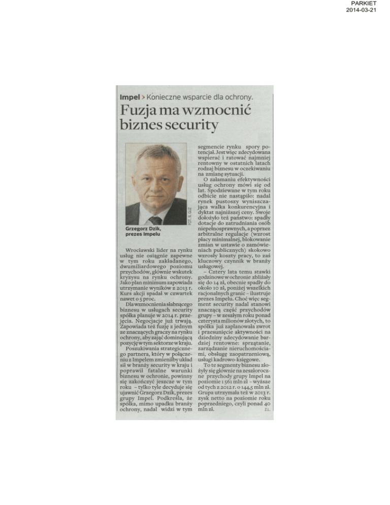 PARKIET 2014-03-21 Impel > Konieczne wsparcie dla ochrony. Fuzja ma wzmocnić biznes security Grzegorz Dzik, prezes Impelu Wrocławski lider na rynku usług nie osiągnie zapewne w tym roku zakładanego, dwumiliardowego poziomu przychodów, głównie wskutek kryzysu na rynku ochrony. Jako plan minimum zapowiada utrzymanie wyników z 2013 r. Kurs akcji spadał w czwartek nawet o5 proc. Dla wzmocnienia słabnącego biznesu w usługach security spółka planuje w 2014 r. prze jęcia. Negocjacje już trwają. Zapowiada też fuzję z jednym ze znaczących graczy na rynku ochrony, aby zająć dominującą pozycję w tym sektorze wkraju. Poszukiwania strategiczne go partnera, który w połącze niu z Impelem zmieniłby układ sił w branży security w kraju i poprawił fatalne warunki biznesu w ochronie, powinny się zakończyć jeszcze w tym roku - tylko tyle decyduje się ujawnić Grzegorz Dzik, prezes grupy Impel. Podkreśla, że spółka, mimo upadku branży ochrony, nadal widzi w tym segmencie rynku spory po tencjał. Jest więc zdecydowana wspierać i ratować najmniej rentowny w ostatnich latach rodzaj biznesu w oczekiwaniu na zmianę sytuacji. O załamaniu efektywności usług ochrony mówi się od lat. Spodziewane w tym roku odbicie nie nastąpiło: nadal rynek pustoszy wyniszcza jąca walka konkurencyjna i dyktat najniższej ceny. Swoje dołożyło też państwo: spadły dotacje do zatrudniania osób niepełnosprawnych, a poprzez arbitralne regulacje (wzrost płacy minimalnej, blokowanie zmian w ustawie o zamówie niach publicznych) skokowo wzrosły koszty pracy, to zaś kluczowy czynnik w branży usługowej. - Cztery lata temu stawki godzinowe w ochronie zbliżały się do 14 zł, obecnie spadły do około 10 zł, poniżej wszelkich racjonalnych granic- ilustruje prezes Impelu. Choć więc seg ment security nadal stanowi znaczącą część przychodów grupy - w zeszłym roku ponad czterysta milionów złotych, to spółka już zaplanowała zwrot i przesunięcie aktywności na dziedziny zdecydowanie bar dziej rentowne: sprzątanie, zarządzanie nieruchomościa mi, obsługę zaopatrzeniową, usługi kadrowo-księgowe. To te segmenty biznesu zło żyły się głównie na zeszłorocz ne przychody grupy Impel na poziomie 1561 mln zł -wyższe od tych z 2012 r. o 144,5 mln zł. Grupa utrzymała też w 2013 r. zysk netto na poziomie roku poprzedniego, czyli ponad 40 mln zł. zi.