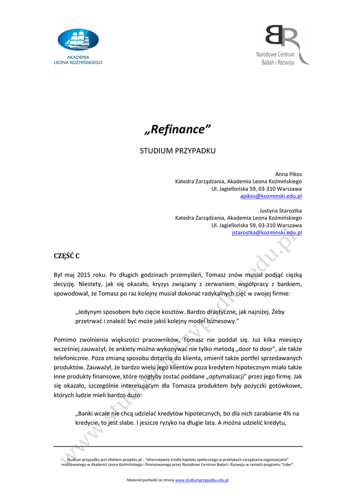 „Refinance” STUDIUM PRZYPADKU Anna Pikos Katedra Zarządzania, Akademia Leona Koźmińskiego Ul. Jagiellońska 59, 03-310 Warszawa [email protected] Justyna Starostka Katedra Zarządzania, Akademia Leona Koźmińskiego Ul. Jagiellońska 59, 03-310 Warszawa [email protected] CZĘŚĆ C Był maj 2015 roku. Po długich godzinach przemyśleń, Tomasz znów musiał podjąć ciężką decyzję. Niestety, jak się okazało, kryzys związany z zerwaniem współpracy z bankiem, spowodował, że Tomasz po raz kolejny musiał dokonać radykalnych cięć w swojej firmie: „Jedynym sposobem było cięcie kosztów. Bardzo drastyczne, jak najniżej. Żeby przetrwać i znaleźć być może jakiś kolejny model biznesowy.” Pomimo zwolnienia większości pracowników, Tomasz nie poddał się. Już kilka miesięcy wcześniej zauważył, że ankiety można wykonywać nie tylko metodą „door to door”, ale także telefonicznie. Poza zmianą sposobu dotarcia do klienta, zmienił także portfel sprzedawanych produktów. Zauważył, że bardzo wielu jego klientów poza kredytem hipotecznym miało także inne produkty finansowe, które mogłyby zostać poddane „optymalizacji” przez jego firmę. Jak się okazało, szczególnie interesującym dla Tomasza produktem były pożyczki gotówkowe, których ludzie mieli bardzo dużo: „Banki wcale nie chcą udzielać kredytów hipotecznych, bo dla nich zarabianie 4% na kredycie, to jest słabe. I jeszcze ryzyko na długie lata. A można udzielić kredytu, Studium przypadku jest efektem projektu pt.: "Alternatywne źródła kapitału społecznego w praktykach zarządzania organizacjami” realizowanego w Akademii Leona Koźmińskiego i finansowanego przez Narodowe Centrum Badań i Rozwoju w ramach programu "Lider". Materiał pochodzi ze strony www.studiumprzypadku.edu.pl pożyczki gotówkowej na RSO, czyli tej rzeczywistej stopie, 25%. I obrócić ją w ciągu 5 lat, czy 3.” Tomasz podkreślał, że banki dodatkowo narzucają na klienta obowiązek ubezpieczenia pożyczki oraz nakładają wysokie prowizje. Pomimo że oprocentowanie ustawowo może sięgać maksymalnie 10% (czterokrotność stopy lombardowej), to jednak bank, narzucając przykładowo 15% ubezpieczenia, obchodzi to prawo. „I tutaj jest duże pole dla nas. Ponieważ jeśli komuś dorzucili te ubezpieczenie albo ktoś ma te 10%, a my mamy na 7–8%, to znowu jest pole do współpracy.” Tomasz zaznaczył, że w Polsce bardzo dużo udziela się pożyczek gotówkowych, więcej niż kredytów mieszkaniowych. Jak podaje „Gazeta Wyborcza”: „w 2014 r. banki i SKOK-i udzieliły 7,6 mln kredytów konsumpcyjnych o rekordowej wartości blisko 78 mld zł. Spadła natomiast - kolejny rok z rzędu - liczba udzielonych kredytów mieszkaniowych - podało Biuro Informacji Kredytowej.”1 Tomasz chciał się zająć konsolidacją pożyczek gotówkowych. Twierdził, że już przy dwóch pożyczkach klientowi opłaca się je skonsolidować. Zdawał sobie sprawę, że kwoty udzielanych pożyczek gotówkowych są mniejsze niż kredytów hipotecznych, lecz ich liczba oraz szybszy proces pozyskiwania powodował, że były bardziej opłacalne w obsłudze. „To są mniejsze kwoty, ale prowizje też są na tyle fajne, są szybsze procesy, bo nie ma księgi wieczystej. To jest 1 wniosek, podpis, szybszy proces.” Tomasz zdecydował się na szerszą ofertę produktową, dotyczącą tak naprawdę wszystkich obszarów życia: „Ankieta telefoniczna, spotkanie audytowe, gdzie skanujemy gościa, co on ma. I rozwiązania w postaci, masz takie produkty, a my ci dopasujemy rozwiązania do tego, co masz. Czyli najpierw badamy twoje potrzeby, nie chcemy ci od razu czegoś sprzedawać, tylko patrzymy, co masz i damy ci coś w tym obszarze lepszego, w tym obszarze lepszego. W tym powiemy, że masz super, to nic nie zrobimy. Ale tego nie masz, to ci to sprzedamy.” Długotrwałe relacje Poza zmianą gamy produktów, zmianie uległa także filozofia dotycząca relacji z klientami. Tomasz zdecydował, że w takim modelu głównym celem powinno być zbudowanie jak najbardziej długotrwałych relacji między jego firmą a klientami: 1 http://wyborcza.biz/biznes/1,100896,17399066,Rekord_sprzedazy_kredytow_konsumpcyjnych __Zalamanie.html Studium przypadku jest efektem projektu pt.: "Alternatywne źródła kapitału społecznego w praktykach zarządzania organizacjami” realizowanego w Akademii Leona Koźmińskiego i finansowanego przez Narodowe Centrum Badań i Rozwoju w ramach programu "Lider". Materiał pochodzi ze strony www.studiumprzypadku.edu.pl 2 „W momencie jak finalizujemy sprzedaż pierwszego produktu, chcę żeby klient wpisał sobie do telefonu imię, nazwisko naszego doradcy. I mówimy mu tak: »We wszelkich sprawach, jak będziesz miał przedłużenie ubezpieczenia samochodu, mieszkania, jak będziesz chciał wziąć pożyczkę, jak będziesz miał kupić mieszkanie dla córki, jak będziesz miał cokolwiek finansowego zrobić, dzwoń do nas«”. Tomasz zapewniał, że tej filozofii podporządkowane jest każde działanie jego i jego doradców, że nawet, jeśli zajdzie taka potrzeba, będą korzystać z oferty konkurencji. Taka sytuacja może się zdarzyć, kiedy firma nie będzie miała danego produktu w ofercie. Wtedy doradca Refinance pójdzie z klientem do banku, który taki produkt posiada i będzie mu doradzał. „Było bardzo wielu naszych klientów VIP-owskich, gdzie doradca szedł z klientem do banku. Doradca bankowy już zacierał ręce, że coś będzie mu sprzedawał. Klient dawał nam do przejrzenia te dokumenty. My mówimy: »Proszę pana, nie po to tu przyszliśmy. Ma pan wziąć to i to, a tego nie. Ale to się da zrobić tylko dla klientów z wyższego poziomu, bo to kosztuje. My to możemy robić dla klientów z większym portfelem, przynajmniej ze średnim portfelem«”. Pasywny dochód doradcy W miarę zdobywania doświadczenia Tomasz zrozumiał także mechanizmy działania rynku doradc