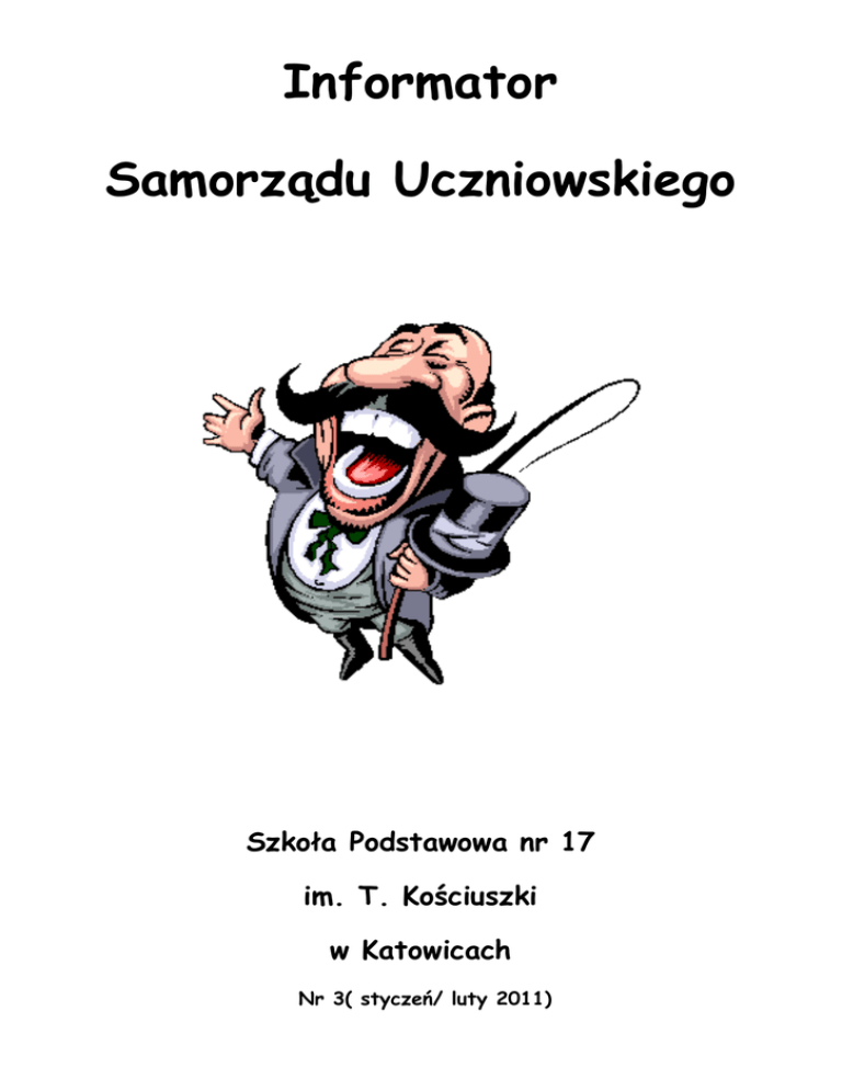 Informator Samorządu Uczniowskiego Szkoła Podstawowa nr 17 im. T. Kościuszki w Katowicach Nr 3( styczeń/ luty 2011) Półroczne posumowanie konkursu o miano „ Klasy sztandarowej” Po pierwszym półroczu podsumowano międzyklasową rywalizację o miano „ Klasy sztandarowej”. Śródroczne zestawienie przedstawia się następująco: I miejsce klasa IV B II miejsce klasa VI C III miejsce klasa V A Gratulujemy. Pozostałych zachęcamy do wzmożenia wysiłków – jeszcze wiele wyzwań przed nami. „ Grzeczność nie jest rzeczą łatwą ani małą” - na półmetku Wstępnie podliczono także punkty w ramach konkursu o grzeczności. Oto wyniki na półmetku: I miejsce klasa IVB II miejsce klasa VI A III miejsce klasa VA Dzień Krawata W styczniu Dzień Integracji Uczniowskiej przebiegał pod węzłem krawata. Postanowiliśmy wyjąć z szaf zakurzone krawaty i zaprezentować je na forum szkoły. Powiało elegancją i dowcipem… Wszak krawat nie jedno ma imię…. 2 Szkolny Projekt Wolontaryjny „ Przyjaciel Zwierząt” Celem projektu jest przeprowadzenie w szkole zbiórki surowców wtórnych i przekazanie zysków z ich sprzedaży na rzecz utrzymania w Chorzowskim Zoo lemura wari oraz wspieranie materialne bezdomnych zwierząt z katowickiego schroniska. Dodatkowo prowadzenie działalności edukacyjnej przygotowującej dzieci do pracy wolontaryjnej. Zbieramy makulaturę, puszki zużyte tonery i kartridże oraz artykuły dla zwierząt. W ramach projektu zrealizowano w lutym warsztaty na temat działalności wolontaryjnej we współpracy z Fundacją „SOS dla bezdomnych zwierząt”. Walentynkowa poczta Tegoroczną pocztę walentynkową połączyliśmy z konkursem na najoryginalniejszą walentynkę. Nagrody ufundowane przez szkolny sklepik Pingwinek w postaci słodkich paczuszek otrzymali wyróżnieni uczniowie w dwóch grupach wiekowych ( klas I – III i klas IV – VI). Nie były to jedyne atrakcje tego dnia ! 3 Dzień z Sercem 14 lutego stał się kolejnym Dniem Integracji Uczniowskiej. Postanowiliśmy świętować nie tylko walentynki ale także wszystkie pozytywne uczucia związane z sercem. Tego dnia uczniowie ubrali się na czerwono i przyczepiali sobie znaczki z serduszkami. Jak przystało na czas karnawału 15 lutego w szkole odbyła się impreza taneczna pod hasłem „ W krainie dreszczowców”. Podczas balu przeprowadzono konkurs na najoryginalniejszy strój własnoręcznie wykonany. Na sali roiło się od czarownic, duchów, zombie i innych szkaradzieństw. Uczniowie prześcigali się w pomysłowości. Najciekawsze stroje uhonorowano nagrodami w postaci bonów do sklepiku szkolnego Pingwinek. Dziękujemy Spółdzielni Uczniowskiej za stałe wspieranie naszych działań! Szkoda, że na następny taki bal musimy czekać cały rok!!! 4