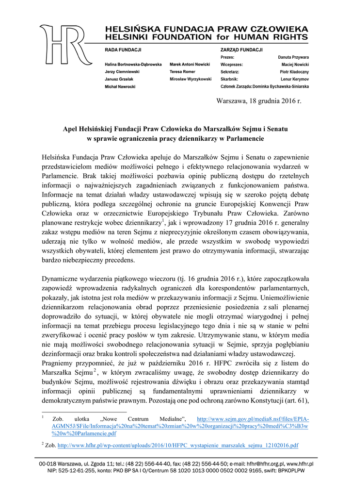Warszawa, 18 grudnia 2016 r. Apel Helsińskiej Fundacji Praw Człowieka do Marszałków Sejmu i Senatu w sprawie ograniczenia pracy dziennikarzy w Parlamencie Helsińska Fundacja Praw Człowieka apeluje do Marszałków Sejmu i Senatu o zapewnienie przedstawicielom mediów możliwości pełnego i efektywnego relacjonowania wydarzeń w Parlamencie. Brak takiej możliwości pozbawia opinię publiczną dostępu do rzetelnych informacji o najważniejszych zagadnieniach związanych z funkcjonowaniem państwa. Informacje na temat działań władzy ustawodawczej wpisują się w szeroko pojętą debatę publiczną, która podlega szczególnej ochronie na gruncie Europejskiej Konwencji Praw Człowieka oraz w orzecznictwie Europejskiego Trybunału Praw Człowieka. Zarówno planowane restrykcje wobec dziennikarzy1, jak i wprowadzony 17 grudnia 2016 r. generalny zakaz wstępu mediów na teren Sejmu z nieprecyzyjnie określonym czasem obowiązywania, uderzają nie tylko w wolność mediów, ale przede wszystkim w swobodę wypowiedzi wszystkich obywateli, której elementem jest prawo do otrzymywania informacji, stwarzając bardzo niebezpieczny precedens. Dynamiczne wydarzenia piątkowego wieczoru (tj. 16 grudnia 2016 r.), które zapoczątkowała zapowiedź wprowadzenia radykalnych ograniczeń dla korespondentów parlamentarnych, pokazały, jak istotna jest rola mediów w przekazywaniu informacji z Sejmu. Uniemożliwienie dziennikarzom relacjonowania obrad poprzez przeniesienie posiedzenia z sali plenarnej doprowadziło do sytuacji, w której obywatele nie mogli otrzymać wiarygodnej i pełnej informacji na temat przebiegu procesu legislacyjnego tego dnia i nie są w stanie w pełni zweryfikować i ocenić pracy posłów w tym zakresie. Utrzymywanie stanu, w którym media nie mają możliwości swobodnego relacjonowania sytuacji w Sejmie, sprzyja pogłębianiu dezinformacji oraz braku kontroli społeczeństwa nad działaniami władzy ustawodawczej. Pragniemy przypomnieć, że już w październiku 2016 r. HFPC zwróciła się z listem do Marszałka Sejmu 2 , w którym zwracaliśmy uwagę, że swobodny dostęp dziennikarzy do budynków Sejmu, możliwość rejestrowania dźwięku i obrazu oraz przekazywania stamtąd informacji opinii publicznej są fundamentalnymi uprawnieniami dziennikarzy w demokratycznym państwie prawnym. Pozostają one pod ochroną zarówno Konstytucji (art. 61), 1 2 Zob. ulotka „Nowe Centrum Medialne”, http://www.sejm.gov.pl/media8.nsf/files/EPIAAGMN5J/$File/Informacja%20na%20temat%20zmian%20w%20organizacji%20pracy%20medi%C3%B3w %20w%20Parlamencie.pdf Zob. http://www.hfhr.pl/wp-content/uploads/2016/10/HFPC_wystapienie_marszalek_sejmu_12102016.pdf ustawy o dostępie do informacji publicznej (art. 3 ust. 1 pkt 3, art. 7 ust. 1 pkt 3 oraz art. 18 ust. 1), a także prawa prasowego (art. 41). Przepisy te gwarantują możliwość wstępu na posiedzenia kolegialnych organów władzy publicznej pochodzących z powszechnych wyborów, wraz z prawem rejestracji dźwięku lub obrazu z tych wydarzeń. Podstawowym celem tych gwarancji jest zapewnienie transparentności procesu tworzenia prawa oraz efektywnego dostępu wyborców do informacji na wszelkie tematy związane m.in. z funkcjonowaniem Sejmu. Z uwagi na konieczność ochrony tych wartości, przepisy prawa – pod groźbą odpowiedzialności karnej – zakazują wszelkich form utrudniania krytyki prasowej oraz utrudniania dostępu do informacji publicznej (art. 44 prawa prasowego i art. 23 ustawy o dostępie do informacji publicznej). W odpowiedzi na nasz list, Kancelaria Sejmu w piśmie z 19 października 2016 r.3 zapewniła nas, że „nie przewiduje wprowadzenia zmian dotyczących pracy dziennikarzy w Sejmie, które byłyby sprzeczne z powszechnie obowiązującymi przepisami prawa, ani standardami demokratycznego państwa prawa albo stanowiły przejaw utrudniania lub tłumienia krytyki prasowej”. Podjęte obecnie działania oraz zapowiadane restrykcje - w naszej ocenie - odbiegają jednak od tej deklaracji. Nie spełniają one bowiem podstawowych warunków dopuszczalności tego rodzaju ograniczeń wobec mediów, tj. mają nieproporcjonalny charakter oraz są wprowadzane bez uzasadnienia, które wskazywałoby, iż służą realizacji uprawnionych celów, a także bez rzeczywistych konsultacji z zainteresowanymi środowiskami. Tymczasem wszelkie ograniczenia praw podstawowych, w tym wolności słowa, zarówno na gruncie Konstytucji RP oraz Europejskiej Konwencji Praw Człowieka muszą mieć odpowiednią podstawę prawną, służyć ochronie jednego ze wskazanych w tych dokumentach dóbr i spełniać kryterium proporcjonalności. Raz jeszcze zwracamy się zatem o przywrócenie dziennikarzom możliwości bieżącego i efektywnego relacjonowania wydarzeń w Sejmie. Apelujemy również o niewprowadzanie nieuzasadnionych i zbyt restrykcyjnych ograniczeń pracy korespondentów parlamentarnych, które w praktyce pozbawiają ich możliwości wykonywania kluczowych zadań mediów jako tzw. „publicznego stróża”. W imieniu Helsińskiej Fundacji Praw Człowieka, Danuta Przywara Prezes zarządu 3 Zob. http://www.hfhr.pl/wp-content/uploads/2016/10/Kancelaria-Sejmu_HFPC_odpowiedz19102016.pdf