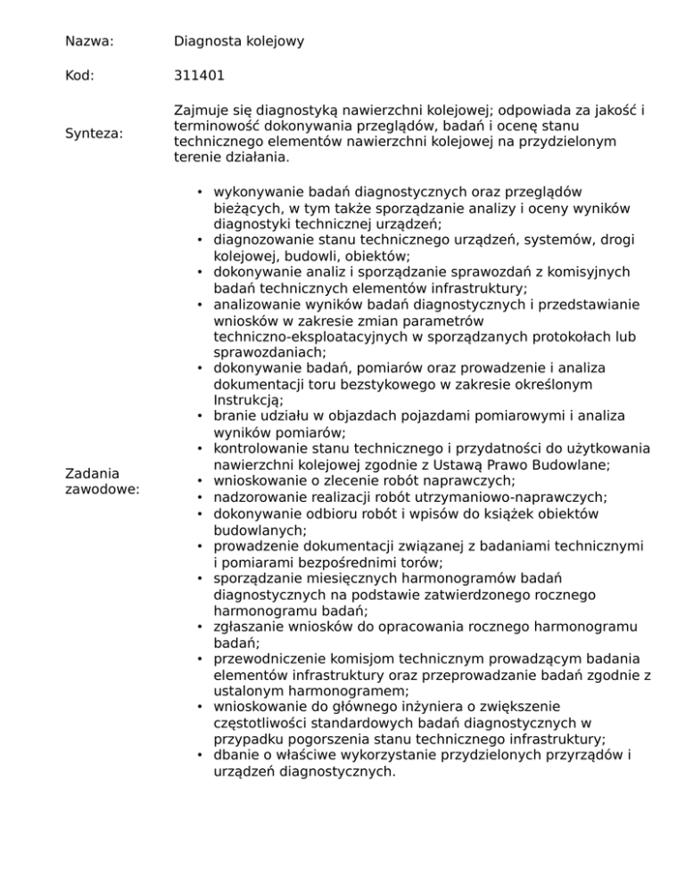 Nazwa: Diagnosta kolejowy Kod: 311401 Synteza: Zajmuje się diagnostyką nawierzchni kolejowej; odpowiada za jakość i terminowość dokonywania przeglądów, badań i ocenę stanu technicznego elementów nawierzchni kolejowej na przydzielonym terenie działania. Zadania zawodowe: • wykonywanie badań diagnostycznych oraz przeglądów bieżących, w tym także sporządzanie analizy i oceny wyników diagnostyki technicznej urządzeń; • diagnozowanie stanu technicznego urządzeń, systemów, drogi kolejowej, budowli, obiektów; • dokonywanie analiz i sporządzanie sprawozdań z komisyjnych badań technicznych elementów infrastruktury; • analizowanie wyników badań diagnostycznych i przedstawianie wniosków w zakresie zmian parametrów techniczno-eksploatacyjnych w sporządzanych protokołach lub sprawozdaniach; • dokonywanie badań, pomiarów oraz prowadzenie i analiza dokumentacji toru bezstykowego w zakresie określonym Instrukcją; • branie udziału w objazdach pojazdami pomiarowymi i analiza wyników pomiarów; • kontrolowanie stanu technicznego i przydatności do użytkowania nawierzchni kolejowej zgodnie z Ustawą Prawo Budowlane; • wnioskowanie o zlecenie robót naprawczych; • nadzorowanie realizacji robót utrzymaniowo-naprawczych; • dokonywanie odbioru robót i wpisów do książek obiektów budowlanych; • prowadzenie dokumentacji związanej z badaniami technicznymi i pomiarami bezpośrednimi torów; • sporządzanie miesięcznych harmonogramów badań diagnostycznych na podstawie zatwierdzonego rocznego harmonogramu badań; • zgłaszanie wniosków do opracowania rocznego harmonogramu badań; • przewodniczenie komisjom technicznym prowadzącym badania elementów infrastruktury oraz przeprowadzanie badań zgodnie z ustalonym harmonogramem; • wnioskowanie do głównego inżyniera o zwiększenie częstotliwości standardowych badań diagnostycznych w przypadku pogorszenia stanu technicznego infrastruktury; • dbanie o właściwe wykorzystanie przydzielonych przyrządów i urządzeń diagnostycznych. Dodatkowe zadania zawodowe: • współpraca z pracodawcą w obsłudze organów kontroli zewnętrznej i wewnętrznej.