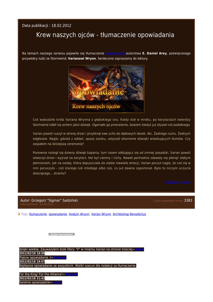 Data publikacji : 18.02.2012 Krew naszych ojców - tłumaczenie opowiadania Na łamach naszego serwisu pojawiło się tłumaczenie opowiadania autorstwa E. Daniel Arey, poświęconego przywódcy ludzi ze Stormwind, Varianowi Wrynn. Serdecznie zapraszamy do lektury. Coś wybudziło króla Variana Wrynna z głębokiego snu. Kiedy stał w mroku, po korytarzach twierdzy Stormwind odbił się echem jakiś dźwięk. Ogarnęło go przerażenie, bowiem kiedyś już słyszał coś podobnego. Varian powoli ruszył w stronę drzwi i przytknął swe ucho do dębowych desek. Nic. Żadnego ruchu. Żadnych odgłosów. Nagle, gdzieś z oddali, spoza zamku, usłyszał stłumione dźwięki wiwatujących tłumów. Czy zaspałem na dzisiejszą ceremonię? Ponownie rozległ się dziwny dźwięk kapania, tym razem odbijający się od zimnej posadzki. Varian powoli otworzył drzwi i wyjrzał na korytarz. Hol był ciemny i cichy. Nawet pochodnie zdawały się płonąć słabym płomieniem. Jak na osobę, która dopuszczała do siebie niewiele emocji, Varian poczuł nagle, że coś się w nim poruszyło - coś starego lub młodego albo coś, co już dawno zapomniał. Było to niczym uczucie dziecięcego... strachu? Więcej informacji Autor: Grzegorz "Sigmar" Sadziński Data publikacji : 18.02.2012 Tagi: tłumaczenie, opowiadanie, Anduin Wrynn, Varian Wrynn, Archbishop Benedictus Komentarz (6) dodaj komentarz dzięki wielkie. Zauważyłem brak litery "V" w imieniu Varian na stronie trzeciej~Netro 2012/02/18 18:50 Piękne opowiadanie :)~Padwee 2012/02/18 19:57 Najlepsze opowiadanie ze wszystkich. Wielki szacun dla redakcji za tłumaczenie. For the King! For the Alliance!~Arghast 2012/02/18 21:42 Swietne opowiadanie~v6v5v Liczba wyświetleń strony: 3383 2012/02/19 10:10 Nareszcie jakiś wartościowy news.~guzimierz 2012/02/20 17:22 super opowiadanie ale jak dla mnie i tak najlepsze było o Sylvans ^^ Sylanas* XD~tarne 2012/02/21 11:17 dodaj komentarz Pozostałe nowości Zapowiedź zmian w klasach - Mnich Legion wkroczył w fazę alfa testów w czasie których dostępna jest póki co jedynie lokacja startowa łowców demonów, a my przyglądamy się temu, jakich zmian doczeka się klasa, która stosunkowo niedawno pojawiła się w World of Warcraft. Oto co na najnowszy dodatek Blizzard przygotował dla mnichów.Data publikacji: 24.11.20150 Zapowiedź zmian w klasach - Wojownik Po krótkiej przerwie wracamy z tłumaczeniami blogów poświęconych zmianom, jakie pojawią się w klasach w nadchodzącym dodatku do World of Warcraft. Oto czego powinni spodziewać się wojownicy z Azeroth w LegionieData publikacji: 23.11.20150 Zapowiedź zmian w klasach - Szaman Kolejna zapowiedzieć, która pojawiła się jakiś czas temu na łamach oficjalnej strony społecznościowej dotyczy szamana. Największe zmiany w przypadku tej klasy dotknęły totemy oraz system zasobów specjalizacji Elemental oraz EnhancementData publikacji: 16.11.20150 11 urodziny World of Warcraft World of Warcraft obchodzi już swoje 11 urodziny. Z tej okazji Blizzard przygotował kilka zabawek, które powinny wszystkim przypomnieć sam początek przygody w świecie Azeroth - w rolach głównych Edwin VanCleef, Hogger, murlok oraz Windfury (w wersji nadmuchiwanej).Data publikacji: 16.11.20150 Zapowiedź zmian w klasach - Rycerz śmierci Kolejna zapowiedź opublikowana na łamach oficjalnej strony społecznościowej World of Warcraft poświęcona jest klasie rycerzy śmierci. Poniżej znajdziecie informacje między innymi o ujednoliceniu wszystkich run oraz nowej umiejętności specjalizacji Blood, która została zainspirowana Lordem Marrowgarem z Icecrown Citadel.Data publikacji: 15.11.20150 Wszystkie nowości