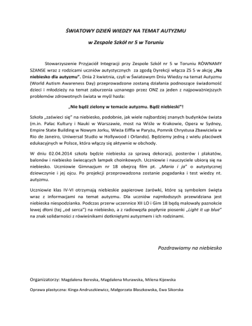 ŚWIATOWY DZIEŃ WIEDZY NA TEMAT AUTYZMU w Zespole Szkół nr 5 w Toruniu Stowarzyszenie Przyjaciół Integracji przy Zespole Szkół nr 5 w Toruniu RÓWNAMY SZANSE wraz z rodzicami uczniów autystycznych za zgodą Dyrekcji włącza ZS 5 w akcję „Na niebiesko dla autyzmu”. Dnia 2 kwietnia, czyli w Światowym Dniu Wiedzy na temat Autyzmu (World Autism Awareness Day) przeprowadzone zostaną działania podnoszące świadomość dzieci i młodzieży na temat zaburzenia uznanego przez ONZ za jeden z najpoważniejszych problemów zdrowotnych świata w myśl hasła: „Nie bądź zielony w temacie autyzmu. Bądź niebieski”! Szkoła „zaświeci się” na niebiesko, podobnie, jak wiele najbardziej znanych budynków świata (m.in. Pałac Kultury i Nauki w Warszawie, most na Wiśle w Krakowie, Opera w Sydney, Empire State Building w Nowym Jorku, Wieża Eiffla w Paryżu, Pomnik Chrystusa Zbawiciela w Rio de Janeiro, Uniwersal Studio w Hollywood i Orlando). Będziemy jedną z wielu placówek edukacyjnych w Polsce, która włączy się aktywnie w obchody. W dniu 02.04.2014 szkoła będzie niebieska za sprawą dekoracji, posterów i plakatów, balonów i niebiesko świecących lampek choinkowych. Uczniowie i nauczyciele ubiorą się na niebiesko. Uczniowie Gimnazjum nr 18 obejrzą film pt. „Maria i ja” o autystycznej dziewczynie i jej ojcu. Po projekcji przeprowadzona zostanie pogadanka i test wiedzy nt. autyzmu. Uczniowie klas IV-VI otrzymają niebieskie papierowe żarówki, które są symbolem święta wraz z informacjami na temat autyzmu. Dla uczniów najmłodszych przewidziana jest niebieska niespodzianka. Podczas przerw uczennice XII LO i Gim 18 będą malowały paznokcie lewej dłoni (tej „od serca”) na niebiesko, a z radiowęzła popłynie piosenki „Light it up blue” na znak solidarności z rówieśnikami dotkniętymi autyzmem i ich rodzinami. Pozdrawiamy na niebiesko Organizatorzy: Magdalena Bereska, Magdalena Murawska, Milena Kijewska Oprawa plastyczna: Kinga Andruszkiewicz, Małgorzata Błaszkowska, Ewa Sikorska