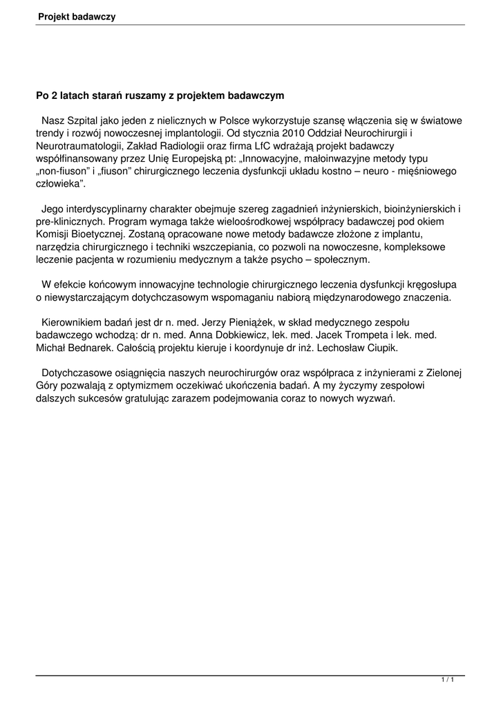 Projekt badawczy Po 2 latach starań ruszamy z projektem badawczym Nasz Szpital jako jeden z nielicznych w Polsce wykorzystuje szansę włączenia się w światowe trendy i rozwój nowoczesnej implantologii. Od stycznia 2010 Oddział Neurochirurgii i Neurotraumatologii, Zakład Radiologii oraz firma LfC wdrażają projekt badawczy współfinansowany przez Unię Europejską pt: „Innowacyjne, małoinwazyjne metody typu „non-fiuson” i „fiuson” chirurgicznego leczenia dysfunkcji układu kostno – neuro - mięśniowego człowieka”. Jego interdyscyplinarny charakter obejmuje szereg zagadnień inżynierskich, bioinżynierskich i pre-klinicznych. Program wymaga także wieloośrodkowej współpracy badawczej pod okiem Komisji Bioetycznej. Zostaną opracowane nowe metody badawcze złożone z implantu, narzędzia chirurgicznego i techniki wszczepiania, co pozwoli na nowoczesne, kompleksowe leczenie pacjenta w rozumieniu medycznym a także psycho – społecznym. W efekcie końcowym innowacyjne technologie chirurgicznego leczenia dysfunkcji kręgosłupa o niewystarczającym dotychczasowym wspomaganiu nabiorą międzynarodowego znaczenia. Kierownikiem badań jest dr n. med. Jerzy Pieniążek, w skład medycznego zespołu badawczego wchodzą: dr n. med. Anna Dobkiewicz, lek. med. Jacek Trompeta i lek. med. Michał Bednarek. Całością projektu kieruje i koordynuje dr inż. Lechosław Ciupik. Dotychczasowe osiągnięcia naszych neurochirurgów oraz współpraca z inżynierami z Zielonej Góry pozwalają z optymizmem oczekiwać ukończenia badań. A my życzymy zespołowi dalszych sukcesów gratulując zarazem podejmowania coraz to nowych wyzwań. 1/1