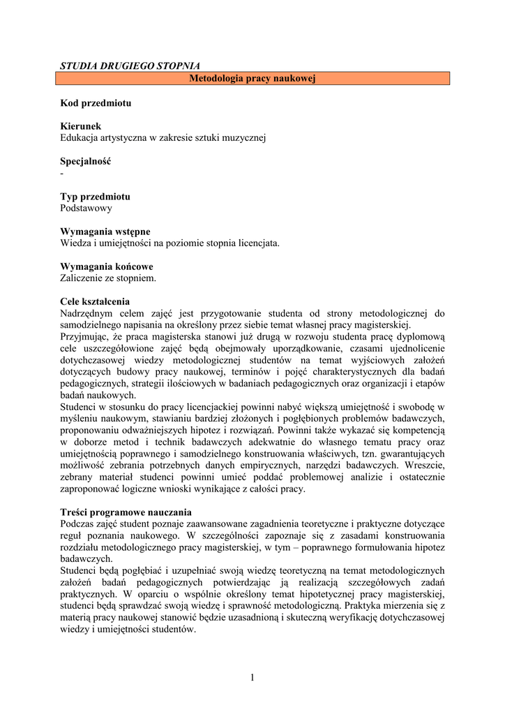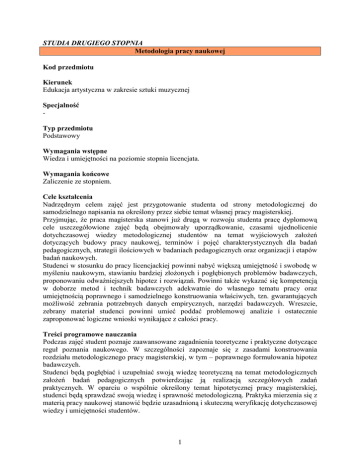 STUDIA DRUGIEGO STOPNIA Metodologia pracy naukowej Kod przedmiotu Kierunek Edukacja artystyczna w zakresie sztuki muzycznej Specjalność Typ przedmiotu Podstawowy Wymagania wstępne Wiedza i umiejętności na poziomie stopnia licencjata. Wymagania końcowe Zaliczenie ze stopniem. Cele kształcenia Nadrzędnym celem zajęć jest przygotowanie studenta od strony metodologicznej do samodzielnego napisania na określony przez siebie temat własnej pracy magisterskiej. Przyjmując, że praca magisterska stanowi już drugą w rozwoju studenta pracę dyplomową cele uszczegółowione zajęć będą obejmowały uporządkowanie, czasami ujednolicenie dotychczasowej wiedzy metodologicznej studentów na temat wyjściowych założeń dotyczących budowy pracy naukowej, terminów i pojęć charakterystycznych dla badań pedagogicznych, strategii ilościowych w badaniach pedagogicznych oraz organizacji i etapów badań naukowych. Studenci w stosunku do pracy licencjackiej powinni nabyć większą umiejętność i swobodę w myśleniu naukowym, stawianiu bardziej złożonych i pogłębionych problemów badawczych, proponowaniu odważniejszych hipotez i rozwiązań. Powinni także wykazać się kompetencją w doborze metod i technik badawczych adekwatnie do własnego tematu pracy oraz umiejętnością poprawnego i samodzielnego konstruowania właściwych, tzn. gwarantujących możliwość zebrania potrzebnych danych empirycznych, narzędzi badawczych. Wreszcie, zebrany materiał studenci powinni umieć poddać problemowej analizie i ostatecznie zaproponować logiczne wnioski wynikające z całości pracy. Treści programowe nauczania Podczas zajęć student poznaje zaawansowane zagadnienia teoretyczne i praktyczne dotyczące reguł poznania naukowego. W szczególności zapoznaje się z zasadami konstruowania rozdziału metodologicznego pracy magisterskiej, w tym – poprawnego formułowania hipotez badawczych. Studenci będą pogłębiać i uzupełniać swoją wiedzę teoretyczną na temat metodologicznych założeń badań pedagogicznych potwierdzając ją realizacją szczegółowych zadań praktycznych. W oparciu o wspólnie określony temat hipotetycznej pracy magisterskiej, studenci będą sprawdzać swoją wiedzę i sprawność metodologiczną. Praktyka mierzenia się z materią pracy naukowej stanowić będzie uzasadnioną i skuteczną weryfikację dotychczasowej wiedzy i umiejętności studentów. 1 Efekty kształcenia (uczenia się) po ukończeniu przedmiotu - w zakresie umiejętności • Student potrafi samodzielnie zaplanować, przygotować oraz napisać pracę naukową spełniającą kryteria pracy magisterskiej w zakresie rozwiniętej struktury metodologicznej pracy naukowej (K1_U13). Metody nauczania Zajęcia zbiorowe Nakład pracy studenta potrzebny do osiągnięcia efektów uczenia się ROK SEMESTR Punkty ECTS Ilość godzin w semestrze Rodzaj zaliczenia LEGENDA I 1 II 2 3 4 1 15 zs zal – zaliczony; zs – zaliczenie ze stopniem; egz – egzamin; ed – egzamin dyplomowy Kryteria oceny 1. Opracowanie i przedstawienie w formie pisemnej rozdziału metodologicznego do hipotetycznie przyjętej pracy magisterskiej – przedmiotu i celów pracy, problemów badawczych, hipotez badań własnych oraz wynikających z nich zmiennych i wskaźników, a także dobranej metody, technik i narzędzi badawczych. 2. Szczególna uwaga zostanie położona na jakościową weryfikację hipotez (oceniona zostanie logika wypowiedzi, trafność i wieloaspektowość uzasadnień, posługiwanie się prawidłowym językiem naukowym i poprawnym językiem polskim). Literatura (piśmiennictwo) 1. K. Duraj-Nowakowa, Modelowanie w badaniach pedagogicznych,[w:] S. Palka, red., Podstawy metodologii badań w pedagogice, Gdańsk 2009, s. 139 – 152. 2. K. Duraj-Nowakowa, Studiowanie literatury przedmiotu, Kraków 2012. 3. H. Komorowska, Metody ilościowe a metody jakościowe w badaniach pedagogicznych, [w:] Edukacja, 1989, nr 3. 4. H. H. Kruger, Metody badań w pedagogice, GWP, Gdańsk 2004. 5. M. Łobocki, Metody badań pedagogicznych, Kraków 2000. 6. M. Łobocki, Wprowadzenie do metodologii badań pedagogicznych, Kraków 1999. 7. Maszke A., Metodologiczne podstawy badań pedagogicznych, Rzeszów 2004. 8. J. Pieter, Z zagadnień pracy naukowej, Ossolineum, Wrocław 1974. 9. T. Pilch, T. Bauman, Zasady badań pedagogicznych. Strategie ilościowe i jakościowe, Wydawnictwo Akademickie „Żak”, Warszawa 2001. 10. K. Rubacha, Metodologia badań edukacyjnych, WAiP, Warszawa 2008. 11. J. Sztumski, Wstęp do metod i technik badań społecznych, Katowice 2005. 12. D. Urbaniak-Zając, J. Piekarski (red.), Jakościowe orientacje w badaniach pedagogicznych. Studia i materiały, Wyd. Uniwersytetu Łódzkiego, Łódź, 2001. 2 13. W. Zaczyński, Poradnik autora prac seminaryjnych, dyplomowych i magisterskich, Warszawa 1995. 14. W. Zaczyński, Praca badawcza nauczyciela, Warszawa 2000. Język wykładowy Polski, może być też język angielski. Imię i nazwisko wykładowcy dr Aneta Rogalska - Marasińska 3
