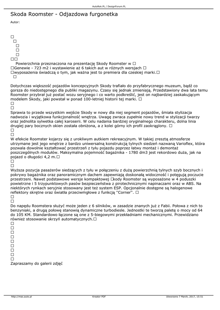 AutoRok.PL / DesignForum.PL Skoda Roomster - Odjazdowa furgonetka Autor: Powierzchnia przeznaczona na prezentację Skody Roomster w Genewie - 723 m2 i wystawienie aż 6 takich aut w różnych wersjach wyposażenia świadczą o tym, jak ważna jest to premiera dla czeskiej marki. Dotychczas większość pojazdów koncepcyjnych Skody trafiało do przyfabrycznego muzeum, bądź co gorsza do niedostępnego dla publiki magazynu. Czasy się jednak zmieniają. Przedstawiony dwa lata temu Roomster przybrał już postać wozu seryjnego i co warto podkreślić, jest on najbardziej zaskakującym modelem Skody, jaki powstał w ponad 100-letniej historii tej marki. Sprawia to przede wszystkim wejście Skody w nowy dla niej segment pojazdów, śmiała stylizacja nadwozia i wyjątkowa funkcjonalność wnętrza. Uwagę zwraca zupełnie nowy trend w stylizacji twarzy oraz jednolita sylwetka całej karoserii. W celu nadania bardziej oryginalnego charakteru, dolna linia drugiej pary bocznych okien została obniżona, a z kolei górny ich profil zaokrąglony. W efekcie Roomster kojarzy się z urokliwym autkiem rekreacyjnym. W takiej zresztą atmosferze utrzymane jest jego wnętrze z bardzo uniwersalną konstrukcją tylnych siedzeń nazwaną Varioflex, która pozwala dowolnie kształtować przestrzeń z tyłu pojazdu poprzez łatwy montaż i demontaż poszczególnych modułów. Maksymalna pojemność bagażnika - 1780 dm3 jest rekordowo duża, jak na pojazd o długości 4,2 m. Wyższa pozycja pasażerów siedzących z tyłu w połączeniu z dużą powierzchnią tylnych szyb bocznych i pokrywy bagażnika oraz panoramicznym dachem zapewniają doskonałą widoczność i potęgują poczucie przestrzeni. Nawet podstawowe wersje kompaktowej ©kody Roomster są wyposażone w 4 poduszki powietrzne i 5 trzypunktowych pasów bezpieczeństwa z pirotechnicznymi napinaczami oraz w ABS. Na niektórych rynkach seryjnie stosowany jest też system ESP. Opcjonalnie dostępne są halogenowe reflektory skrętne oraz światła przeciwmgłowe z funkcją ''Corner''. Do napędu Roomstera służyć może jeden z 6 silników, w zasadzie znanych już z Fabii. Połowa z nich to benzyniaki, a drugą połowę stanowią dynamiczne turbodiesle. Jednostki te tworzą paletę o mocy od 64 do 105 KM. Standardowo łączone są one z 5-biegowymi przekładniami mechanicznymi. Przewidziano również stosowanie skrzyń automatycznych. Zapraszamy do galerii zdjęć http://mas.auto.pl Kreator PDF Utworzono 7 March, 2017, 15:51