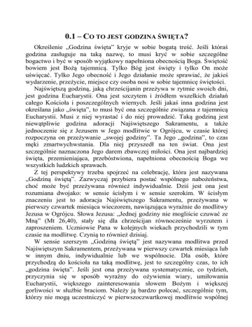 0.1 – CO TO JEST GODZINA ŚWIĘTA? Określenie „Godzina święta” kryje w sobie bogatą treść. Jeśli któraś godzina zasługuje na taką nazwę, to musi kryć w sobie szczególne bogactwo i być w sposób wyjątkowy napełniona obecnością Boga. Świętość bowiem jest Bożą tajemnicą. Tylko Bóg jest święty i tylko On może uświęcać. Tylko Jego obecność i Jego działanie może sprawiać, że jakieś wydarzenie, przeżycie, miejsce czy osoba nosi w sobie tajemnicę świętości. Najświętszą godziną, jaką chrześcijanin przeżywa w rytmie swoich dni, jest godzina Eucharystii. Ona jest szczytem i źródłem wszelkich działań całego Kościoła i poszczególnych wiernych. Jeśli jakaś inna godzina jest określana jako „święta”, to musi być ona szczególnie związana z tajemnicą Eucharystii. Musi z niej wyrastać i do niej prowadzić. Taką godziną jest niewątpliwie godzina adoracji Najświętszego Sakramentu, a także jednoczenie się z Jezusem w Jego modlitwie w Ogrójcu, w czasie której rozpoczyna on przeżywanie „swojej godziny”. Ta Jego „godzina”, to czas męki zmartwychwstania. Dla niej przyszedł na ten świat. Ona jest szczególnie naznaczona Jego darem zbawczej miłości. Ona jest najbardziej święta, przemieniająca, przebóstwiona, napełniona obecnością Boga we wszystkich ludzkich sprawach. Z tej perspektywy trzeba spojrzeć na celebrację, która jest nazywana „Godziną świętą”. Zazwyczaj przybiera postać wspólnego nabożeństwa, choć może być przeżywana również indywidualnie. Dziś jest ona jest rozumiana dwojako: w sensie ścisłym i w sensie szerokim. W ścisłym znaczeniu jest to adoracja Najświętszego Sakramentu, przeżywana w pierwszy czwartek miesiąca wieczorem, nawiązująca wyraźnie do modlitwy Jezusa w Ogrójcu. Słowa Jezusa: „Jednej godziny nie mogliście czuwać ze Mną” (Mt 26,40), stały się dla chrześcijan równocześnie wyrzutem i zaproszeniem. Uczniowie Pana w kolejnych wiekach przychodzili w tym czasie na modlitwę. Czynią to również dzisiaj. W sensie szerszym „Godziną świętą” jest nazywana modlitwa przed Najświętszym Sakramentem, przeżywana w pierwszy czwartek miesiąca lub w innym dniu, indywidualnie lub we wspólnocie. Dla osób, które przychodzą do kościoła na taką modlitwę, jest to szczególny czas, to ich „godzina święta”. Jeśli jest ona przeżywana systematycznie, co tydzień, przyczynia się w sposób wyraźny do ożywienia wiary, umiłowania Eucharystii, większego zainteresowania słowem Bożym i większej gorliwości w służbie braciom. Należy ją bardzo polecać, szczególnie tym, którzy nie mogą uczestniczyć w pierwszoczwartkowej modlitwie wspólnej oraz tym, dla których adoracja raz w miesiącu, to przeżycie zbyt rzadkie. Oni pragną adoracji częstej i bez niej nie umieją przeżywać swojej codzienności. W niniejszym opracowaniu zaproponowana jest „Godzina święta” w sensie ścisłym. Ma ona swój stały schemat, który się za każdym razem powtarza, ale co miesiąc jest wypełniany inną treścią. Rozpoczynamy od wprowadzenia, a po nim przeżywamy trzy części. Każda z nich odwołuje się do słów Jezusa, wypowiedzianych w Ogrójcu. Dla osób, które chcą w taki sposób przeżywać Godzinę świętą, pomocne będzie dokładniejsze zapoznanie się ze specyfika poszczególnych części tej modlitwy. Wprowadzenie - Jezus „wziął z sobą Piotra, Jakuba i Jana” (Mt 14,33) Początek czuwania ma charakter prośby o łaskę modlitwy. Do Ogrójca, w przestrzeń Jezusowej modlitwy, człowiek nie wchodzi sam. To Jezus „zabiera ze sobą uczniów”, aby byli przy Nim. Prosimy, aby i nas „zabrał ze sobą”, aby wprowadził nas w wydarzenie uświęcone Jego modlitwą i duchową walką. Każda chwila modlitwy jest łaską. Łaską jest to, że człowiek rozmawia z Bogiem. Jeszcze większym darem jest to, że człowiek może jednoczyć się z Jezusem w Jego modlitwie, że może uczestniczyć w niezwykłym dialogu miłości z Ojcem, jaki przeżywa Jezus. O ten dar trzeba prosić i od tej prośby rozpoczynamy zawsze Godzinę świętą. Część I - „Czuwajcie ze Mną” (Mt 26,38) Pierwsza część czuwania, po wprowadzeniu, koncentruje uwagę uczestników na modlitwie Jezusa i Jego przeżyciach. Przyjmujemy wezwanie Jezusa, aby być z Nim, przy Nim, blisko Niego. Chodzi nie tylko o fizyczną bliskość. O wiele ważniejsza jest ta bliskość serca. Jest to szczególny czas kontemplacji, w przeżyciu której pomagają wprowadzające teksty. Umiejętność wpatrywania się w Jezusa, wsłuchiwania się w Jego słowa, kontemplacji Jego postawy jest sztuką, której stale się uczymy. W tej części celebracji nie zajmujemy się sobą, lecz Jezusem. Nie pytamy o nasze zachowanie się, lecz o Jego słowa i czyny. Nie koncentrujemy się ani na naszych słabościach ani naszych osiągnięciach, lecz wszystkie nasze siły umysłu i serca kierujemy ku Jezusowi. Staramy się do Niego zbliżyć, lepiej Go zrozumieć, uważniej wsłuchiwać się w Jego słowa, dokładniej poznać Jego pragnienia, wyraźniej dostrzec wielkość Jego darów, bardziej przenikliwie spojrzeć w Jego boskie Serce, by głębiej dotarła do nas prawda o Jego nieskończonej miłości. 2 W Ogrójcu Jezus wypowiedział słowa: „Czuwajcie ze Mną” (Mt 26,38). Te właśnie słowa określają nasze działania. Chcemy czuwać z Nim, starając się przeżywać to, co On przeżywa. Prosimy Ducha Świętego, aby dał nam łaskę zjednoczenia z Tym, aby uzdolnił nas do czuwania z Nim. Po rozważaniach, modlitwach i śpiewach, przeżytych wspólnie, pozostajemy w dłuższej chwili ciszy, aby każdy indywidualnie mógł doświadczyć bliskości z Jezusem w Jego modlitwie. Część II - „Módlcie się, abyście nie ulegli pokusie” (Mt 26,41) Po wspólnym rozważaniu i przeżyciu dłuższej chwili ciszy przechodzimy do drugiej części czuwania. Jej charakter określaj