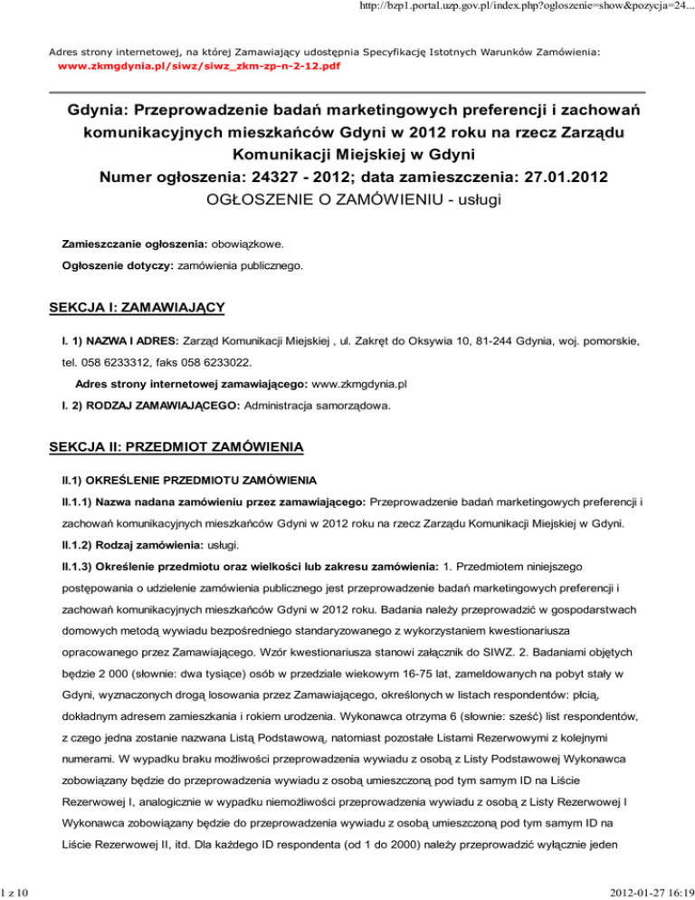 1 z 10 http://bzp1.portal.uzp.gov.pl/index.php?ogloszenie=show&pozycja=24... Adres strony internetowej, na której Zamawiający udostępnia Specyfikację Istotnych Warunków Zamówienia: www.zkmgdynia.pl/siwz/siwz_zkm-zp-n-2-12.pdf Gdynia: Przeprowadzenie badań marketingowych preferencji i zachowań komunikacyjnych mieszkańców Gdyni w 2012 roku na rzecz Zarządu Komunikacji Miejskiej w Gdyni Numer ogłoszenia: 24327 - 2012; data zamieszczenia: 27.01.2012 OGŁOSZENIE O ZAMÓWIENIU - usługi Zamieszczanie ogłoszenia: obowiązkowe. Ogłoszenie dotyczy: zamówienia publicznego. SEKCJA I: ZAMAWIAJĄCY I. 1) NAZWA I ADRES: Zarząd Komunikacji Miejskiej , ul. Zakręt do Oksywia 10, 81-244 Gdynia, woj. pomorskie, tel. 058 6233312, faks 058 6233022. Adres strony internetowej zamawiającego: www.zkmgdynia.pl I. 2) RODZAJ ZAMAWIAJĄCEGO: Administracja samorządowa. SEKCJA II: PRZEDMIOT ZAMÓWIENIA II.1) OKREŚLENIE PRZEDMIOTU ZAMÓWIENIA II.1.1) Nazwa nadana zamówieniu przez zamawiającego: Przeprowadzenie badań marketingowych preferencji i zachowań komunikacyjnych mieszkańców Gdyni w 2012 roku na rzecz Zarządu Komunikacji Miejskiej w Gdyni. II.1.2) Rodzaj zamówienia: usługi. II.1.3) Określenie przedmiotu oraz wielkości lub zakresu zamówienia: 1. Przedmiotem niniejszego postępowania o udzielenie zamówienia publicznego jest przeprowadzenie badań marketingowych preferencji i zachowań komunikacyjnych mieszkańców Gdyni w 2012 roku. Badania należy przeprowadzić w gospodarstwach domowych metodą wywiadu bezpośredniego standaryzowanego z wykorzystaniem kwestionariusza opracowanego przez Zamawiającego. Wzór kwestionariusza stanowi załącznik do SIWZ. 2. Badaniami objętych będzie 2 000 (słownie: dwa tysiące) osób w przedziale wiekowym 16-75 lat, zameldowanych na pobyt stały w Gdyni, wyznaczonych drogą losowania przez Zamawiającego, określonych w listach respondentów: płcią, dokładnym adresem zamieszkania i rokiem urodzenia. Wykonawca otrzyma 6 (słownie: sześć) list respondentów, z czego jedna zostanie nazwana Listą Podstawową, natomiast pozostałe Listami Rezerwowymi z kolejnymi numerami. W wypadku braku możliwości przeprowadzenia wywiadu z osobą z Listy Podstawowej Wykonawca zobowiązany będzie do przeprowadzenia wywiadu z osobą umieszczoną pod tym samym ID na Liście Rezerwowej I, analogicznie w wypadku niemożliwości przeprowadzenia wywiadu z osobą z Listy Rezerwowej I Wykonawca zobowiązany będzie do przeprowadzenia wywiadu z osobą umieszczoną pod tym samym ID na Liście Rezerwowej II, itd. Dla każdego ID respondenta (od 1 do 2000) należy przeprowadzić wyłącznie jeden 2012-01-27 16:19 2 z 10 http://bzp1.portal.uzp.gov.pl/index.php?ogloszenie=show&pozycja=24... wywiad z jednej z list (Podstawowej, Rezerwowej I, Rezerwowej II, Rezerwowej III, Rezerwowej IV, Rezerwowej V, ewentualnie dodatkowej). Zrealizowanie większej liczby wywiadów spod danego ID respondenta będzie przez Zamawiającego traktowane jako jeden zrealizowany wywiad. Mieszkańcy na każdej z list są pogrupowani wg dzielnic. Wyszczególniono 22 (słownie: dwadzieścia dwie) dzielnice. Wzór listy respondentów stanowi załącznik do SIWZ. Po otrzymaniu list respondentów Wykonawca zobowiązany będzie złożyć oświadczenie, że lista respondentów nie zostanie wykorzystana w żadnym innym celu, poza celem objętym umową, która zostanie zawarta w następstwie przeprowadzonego postępowania o udzielenie zamówienia publicznego. 2.1 Badanie zostanie podzielone na dwie tury: a) wiosenną (obejmującą okres : od dnia 1 marca do dnia 2 czerwca 2012 roku ) oraz b) jesienną (obejmującą okres : od dnia 2 października do dnia 8 grudnia 2012 roku). Termin wykonania zamówienia szczegółowo opisano w punkcie 28. Pierwsza tura badań (wiosenna): Wykonawca otrzyma 6 list respondentów (listę podstawową i 5 list rezerwowych). Na każdej z list będzie 1 400 (słownie: tysiąc czterysta) z łącznej liczby 2 000 (słownie: dwa tysiące ) wylosowanych respondentów. Zamawiający udostępni listy respondentów po podpisaniu umowy z Wykonawcą, jednak nie wcześniej niż 20 lutego 2012 roku. Wykonawca zobowiązany będzie do realizacji minimum 1 200 (słownie: tysiąc dwieście) z 1 400 (słownie: tysiąc czterysta) otrzymanych wywiadów, przy czy łączna liczba zrealizowanych wywiadów powinna wynosić co najmniej: 600 (słownie: sześćset) wywiadów do 5 kwietnia 2012 roku (I etap) 900 (słownie: dziewięćset) wywiadów do 28 kwietnia 2012 roku (II etap) 1200 (słownie: tysiąc dwieście) wywiadów do 2 czerwca 2012 roku (III etap) Ponadto Wykonawca zobowiązany będzie do realizacji co najmniej 75% (słownie: siedemdziesiąt pięć procent) z liczby wywiadów wyszczególnionych na otrzymanych listach w każdej z 22 dzielnic. Maksymalna liczba wywiadów jaką Wykonawca może zrealizować w pierwszej turze to 1400 (słownie: tysiąc czterysta). Druga tura badań (jesienna): Zamawiający udostępni listy pozostałych 600 (słownie: sześćset) respondentów (listę podstawową i 5 list rezerwowych) nie wcześniej niż 20 września 2012 roku. Wykonawca zobowiązany będzie do realizacji wywiadów, które nie zostały zrealizowane w pierwszej turze (wiosennej) oraz 600 (słownie: sześćset) wywiadów przewidzianych wyłącznie na drugą turę (jesienną), przy czym łączna liczba zrealizowanych wywiadów powinna wynosić co najmniej: 1 600 (słownie: tysiąc sześćset) wywiadów do 27 października 2012 roku (IV etap), 1 900 (słownie: tysiąc dziewięćset) wywiadów do 30 listopada 2012 roku (V etap), 2 000 (słownie: dwa tysiące) wywiadów do 8 grudnia 2012 roku (VI etap). Liczba wywiadów do zrealizowania w drugiej turze = 1 400 (słownie: tysiąc czterysta) - liczba zrealizowanych wywiadów w 1 turze + 600 (słownie: sześćset). Wykonawca zobowiązany będzie do realizacji minimum 1 200 (słownie: tysiąc dwieście) wywiadów z listy podstawowej łącznie w obu turach. 3. An