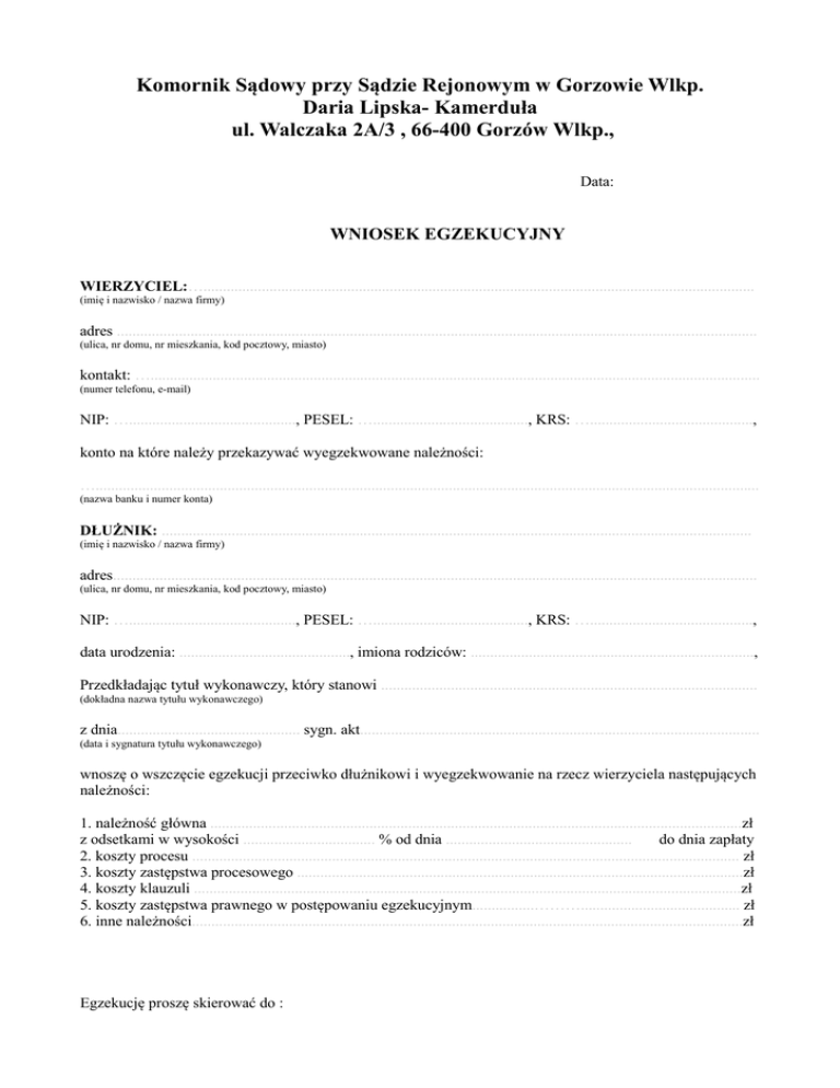 Komornik Sądowy przy Sądzie Rejonowym w Gorzowie Wlkp. Daria Lipska- Kamerduła ul. Walczaka 2A/3 , 66-400 Gorzów Wlkp., Data: WNIOSEK EGZEKUCYJNY WIERZYCIEL:….............................................................................................................................................. (imię i nazwisko / nazwa firmy) adres ..................................................................................................................................................................... (ulica, nr domu, nr mieszkania, kod pocztowy, miasto) kontakt: …............................................................................................................................................................. (numer telefonu, e-mail) NIP: …..........................................., PESEL: …........................................, KRS: ….........................................., konto na które należy przekazywać wyegzekwowane należności: …........................................................................................................................................................................... (nazwa banku i numer konta) DŁUŻNIK: ........................................................................................................................................................ (imię i nazwisko / nazwa firmy) adres...................................................................................................................................................................... (ulica, nr domu, nr mieszkania, kod pocztowy, miasto) NIP: …..........................................., PESEL: …........................................, KRS: ….........................................., data urodzenia: ............................................, imiona rodziców: ........................................................................., Przedkładając tytuł wykonawczy, który stanowi ................................................................................................. (dokładna nazwa tytułu wykonawczego) z dnia............................................... sygn. akt....................................................................................................... (data i sygnatura tytułu wykonawczego) wnoszę o wszczęcie egzekucji przeciwko dłużnikowi i wyegzekwowanie na rzecz wierzyciela następujących należności: 1. należność główna .........................................................................................................................................zł z odsetkami w wysokości .................................. % od dnia ................................................ do dnia zapłaty 2. koszty procesu ............................................................................................................................................. zł 3. koszty zastępstwa procesowego ...................................................................................................................zł 4. koszty klauzuli .............................................................................................................................................zł 5. koszty zastępstwa prawnego w postępowaniu egzekucyjnym................………......................................... zł 6. inne należności..............................................................................................................................................zł Egzekucję proszę skierować do : - wynagrodzenia za pracę................................................................................................................................. (należy podać nazwę i adres pracodawcy, w przypadku braku informacji należy wpisać wg ustaleń Komornika ) -rachunków bankowych................................................................................................................................... (należy podać nazwę banku i numer rachunku bankowego, w przypadku braku informacji należy wpisać wg ustaleń Komornika) - ruchomości..................................................................................................................................................... (należy wymienić ruchomości i miejsce ich położenia,w przypadku braku informacji należy wpisać wg ustaleń Komornika) − wierzytelności................................................................................. − ............................................................. (należy wymienić przysługujące wierzytelności oraz wskazać podmiot od którego przysługują, .w przypadku braku informacji należy wpisać wg ustaleń Komornika) -nieruchomości............................................................................................................................................... (należy wymienić nieruchomości dłużnika wraz z podaniem numeru księgi wieczystej oraz miejsca ich położenia w przypadku braku informacji należy wpisać wg ustaleń Komornika) Na podstawie art. 7971 k.p.c. zlecam komornikowi poszukiwanie majątku dłużnika Jednocześnie oświadczam, iż wyboru komornika dokonałem na podstawie art. 8 ust. 5 ustawy o komornikach sądowych i egzekucji z dnia 29 sierpnia 1997r. podpis wierzyciela