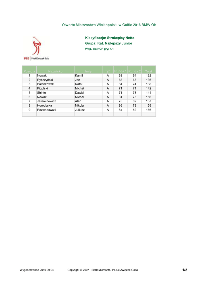 Otwarte Mistrzostwa Wielkopolski w Golfie 2016 BMW Olszowiec Open Klasyfikacja: Strokeplay Netto Grupa: Kat. Najlepszy Junior Wsp. dla HCP gry: 1/1 Pozycja 1 2 3 4 5 6 7 8 9 Nazwisko Nowak Rybczyński Bałenkowski Pigulski Shinto Nowak Jereminowicz Horodyska Rozwadowski Wygenerowano 2016 09 04 Imię Kamil Jan Rafał Michał Dawid Michał Alan Nikola Juliusz Typ A A A A A A A A A Runda 1 Runda 2 68 64 68 68 64 74 71 71 71 73 81 75 75 82 86 73 84 82 Copyright © 2007 - 2010 Microsoft / Polski Związek Golfa Total 132 136 138 142 144 156 157 159 166 1/2 016 BMW Olszowiec Open Wygenerowano 2016 09 04 Copyright © 2007 - 2010 Microsoft / Polski Związek Golfa 2/2