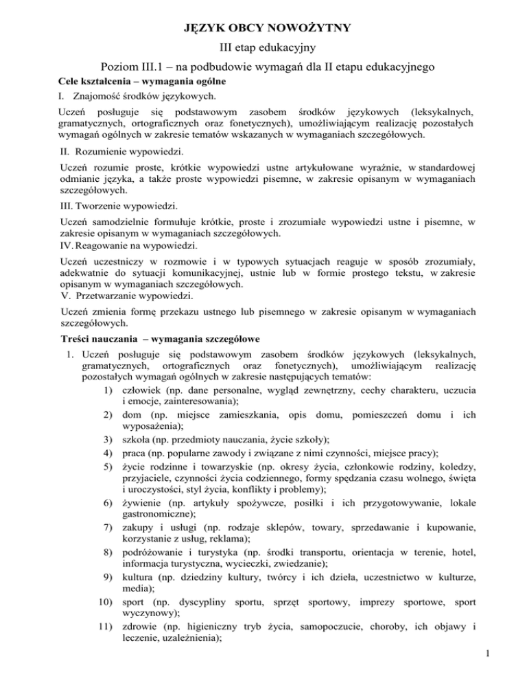 JĘZYK OBCY NOWOśYTNY III etap edukacyjny Poziom III.1 – na podbudowie wymagań dla II etapu edukacyjnego Cele kształcenia – wymagania ogólne I. Znajomość środków językowych. Uczeń posługuje się podstawowym zasobem środków językowych (leksykalnych, gramatycznych, ortograficznych oraz fonetycznych), umoŜliwiającym realizację pozostałych wymagań ogólnych w zakresie tematów wskazanych w wymaganiach szczegółowych. II. Rozumienie wypowiedzi. Uczeń rozumie proste, krótkie wypowiedzi ustne artykułowane wyraźnie, w standardowej odmianie języka, a takŜe proste wypowiedzi pisemne, w zakresie opisanym w wymaganiach szczegółowych. III. Tworzenie wypowiedzi. Uczeń samodzielnie formułuje krótkie, proste i zrozumiałe wypowiedzi ustne i pisemne, w zakresie opisanym w wymaganiach szczegółowych. IV. Reagowanie na wypowiedzi. Uczeń uczestniczy w rozmowie i w typowych sytuacjach reaguje w sposób zrozumiały, adekwatnie do sytuacji komunikacyjnej, ustnie lub w formie prostego tekstu, w zakresie opisanym w wymaganiach szczegółowych. V. Przetwarzanie wypowiedzi. Uczeń zmienia formę przekazu ustnego lub pisemnego w zakresie opisanym w wymaganiach szczegółowych. Treści nauczania – wymagania szczegółowe 1. Uczeń posługuje się podstawowym zasobem środków językowych (leksykalnych, gramatycznych, ortograficznych oraz fonetycznych), umoŜliwiającym realizację pozostałych wymagań ogólnych w zakresie następujących tematów: 1) człowiek (np. dane personalne, wygląd zewnętrzny, cechy charakteru, uczucia i emocje, zainteresowania); 2) dom (np. miejsce zamieszkania, opis domu, pomieszczeń domu i ich wyposaŜenia); 3) szkoła (np. przedmioty nauczania, Ŝycie szkoły); 4) praca (np. popularne zawody i związane z nimi czynności, miejsce pracy); 5) Ŝycie rodzinne i towarzyskie (np. okresy Ŝycia, członkowie rodziny, koledzy, przyjaciele, czynności Ŝycia codziennego, formy spędzania czasu wolnego, święta i uroczystości, styl Ŝycia, konflikty i problemy); 6) Ŝywienie (np. artykuły spoŜywcze, posiłki i ich przygotowywanie, lokale gastronomiczne); 7) zakupy i usługi (np. rodzaje sklepów, towary, sprzedawanie i kupowanie, korzystanie z usług, reklama); 8) podróŜowanie i turystyka (np. środki transportu, orientacja w terenie, hotel, informacja turystyczna, wycieczki, zwiedzanie); 9) kultura (np. dziedziny kultury, twórcy i ich dzieła, uczestnictwo w kulturze, media); 10) sport (np. dyscypliny sportu, sprzęt sportowy, imprezy sportowe, sport wyczynowy); 11) zdrowie (np. higieniczny tryb Ŝycia, samopoczucie, choroby, ich objawy i leczenie, uzaleŜnienia); 1 12) nauka i technika (np. odkrycia naukowe, wynalazki, obsługa i korzystanie z podstawowych urządzeń technicznych, technologie informacyjnokomunikacyjne); 13) świat przyrody (np. pogoda, rośliny i zwierzęta, krajobraz, zagroŜenie i ochrona środowiska naturalnego, klęski Ŝywiołowe); 14) Ŝycie społeczne (np. konflikty i problemy społeczne, przestępczość); 15) elementy wiedzy o krajach obszaru nauczanego języka oraz o kraju ojczystym, z uwzględnieniem kontekstu międzykulturowego oraz tematyki integracji europejskiej. 2. Uczeń rozumie ze słuchu proste, krótkie, typowe wypowiedzi (np. instrukcje, komunikaty, ogłoszenia, rozmowy) artykułowane wyraźnie, w standardowej odmianie języka: 1) reaguje na polecenia; 2) określa główną myśl tekstu; 3) znajduje w tekście określone informacje; 4) określa intencję nadawcy/autora tekstu; 5) określa kontekst wypowiedzi (np. czas, miejsce, sytuację, uczestników); 6) rozróŜnia formalny i nieformalny styl wypowiedzi. 3. Uczeń rozumie proste wypowiedzi pisemne (np. napisy informacyjne, listy, broszury, ulotki reklamowe, jadłospisy, ogłoszenia, rozkłady jazdy, instrukcje obsługi, proste artykuły prasowe i teksty narracyjne): 1) określa główną myśl tekstu; 2) określa główną myśl poszczególnych części tekstu; 3) znajduje w tekście określone informacje; 4) określa intencje nadawcy/autora tekstu; 5) określa kontekst wypowiedzi (np. nadawcę, odbiorcę, formę tekstu); 6) rozpoznaje związki pomiędzy poszczególnymi częściami tekstu; 7) rozróŜnia formalny i nieformalny styl wypowiedzi. 4. Uczeń tworzy krótkie, proste i zrozumiałe wypowiedzi ustne: 1) opisuje ludzi, przedmioty, miejsca, zjawiska i czynności; 2) opowiada o wydarzeniach Ŝycia codziennego; 3) przedstawia fakty z przeszłości i teraźniejszości; 4) relacjonuje wydarzenia z przeszłości; 5) wyraŜa i uzasadnia swoje opinie, poglądy i uczucia; 6) przedstawia opinie innych osób; 7) przedstawia intencje, marzenia, nadzieje i plany na przyszłość; 8) opisuje doświadczenia swoje i innych osób; 9) stosuje formalny lub nieformalny styl wypowiedzi w zaleŜności od sytuacji. 5. Uczeń tworzy krótkie, proste i zrozumiałe wypowiedzi pisemne (np. notatka, ogłoszenie, zaproszenie, pozdrowienia, Ŝyczenia, wiadomość, ankieta, pocztówka, e-mail, opis, krótki list prywatny): 1) opisuje ludzi, przedmioty, miejsca, zjawiska i czynności; 2) opisuje wydarzenia Ŝycia codziennego; 3) przedstawia fakty z przeszłości i teraźniejszości; 4) relacjonuje wydarzenia z przeszłości; 5) wyraŜa i uzasadnia swoje poglądy, uczucia; 6) przedstawia opinie innych osób; 7) opisuje intencje, marzenia, nadzieje i plany na przyszłość; 8) opisuje doświadczenia swoje i innych osób; 2 9) stosuje formalny lub nieformalny styl wypowiedzi w zaleŜności od sytuacji. 6. Uczeń reaguje ustnie w sposób zrozumiały w typowych sytuacjach: 1) nawiązuje kontakty towarzyskie (np. przedstawia siebie i inne osoby, wita się i Ŝegna, udziela podstawowych informacji na swój temat i pyta o dane rozmówcy i innych osób); 2) rozpoczyna, prowadzi i kończy rozmowę; 3) stosuje formy grzecznościowe; 4) uzyskuje i przekazuje informacje i wyjaśnienia; 5) prowadzi proste negocjacje w typowych sytuacjach Ŝycia codziennego (np. wymiana zakupionego towaru); 6) pr