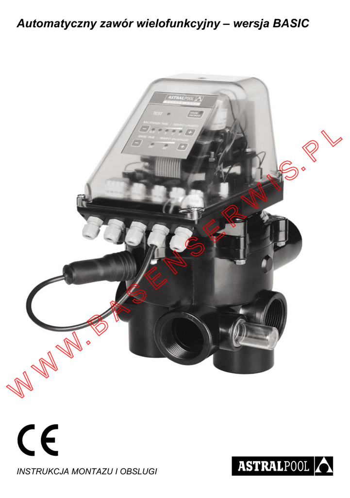 Automatyczny zawór wielofunkcyjny – wersja BASIC W W W .B A S E INSTRUKCJA MONTAZU I OBSLUGI N S E R W I P . S L POLSKI WAŻNE: Instrukcja obsługi która trzymacie Państwo w rękach, zawiera podstawowe istotne informacje dotyczące bezpieczeństwa podczas montażu i włączania do użytkowania lamp podwodnych. Z tego powodu zarówno instalator jak i użytkownik zobowiązani są do przeczytania nniejszej instrukcji przed przystapieniem do ww czynności. Należy zachować nniejsza instrukcję do późniejszego użycia. W celu uzyskania maksymalnych właściwości użytkowych zaworu automatycznego, należy postępować zgodnie z poniższa instrukcją. Ogólne informacje odnośnie bezpieczeństwa: Symbole odpowiednich zaleceń. wskazują możliwość wystąpienia niebezpieczeństwa jako konsekwencji nie przestrzegania P . S NIEBEZPIECZEŃSTWO. Ryzyko śmiertelnego porażenia prądem. Brak uwagi podczas wykonywania czynności oznaczonych tym symbolem może powodować porażenie prądem. NIEBEZPIECZEŃSTWO. Brak uwagi podczas wykonywania czynności oznaczonych tym symbolem może powodować zranienie osoby lub uszkodzenie urzadzenia. I L UWAGA. Brak uwagi podczas wykonywania czynności oznaczonych tym symbolem może ryzyko uszkodzenia urzadzenia lub instalacji OGÓLNE REGULACJE ODNOŚNIE BEZPIECZEŃSTWA: E R W Zawór opisany w niniejszej instrukcji zostal zaprojektowany w celu uzyskania prawidłowej cyrkulacji wody w basenie podczas różnych faz jego pracy. Przeznaczony do pracy z wodą o maksymalnej temperaturze 35o C. N S Instalacja musi być przeprowadzona zgodnie ze szczegółowymi wytycznymi dla poszczególnych zastosowań. S E Regulacje prądowe dla ochrony przez wypadkami muszą byc ściśle przestrzegane. Wszelkie modyfikacje elektroniki zawóru mogą być przeprowadzone jedynie za wcześniejszą zgodą Producenta. Oryginalne części zamienne oraz akcesoria dostarczane przez Producenta gwarantuja większe bezpieczeństwo użytkowania zaworu. A Producent zwolniony jest z wszelkiej odpowiedzialności za uszkodzenia powstałe w wyniku stosowanie nie autoryzowanych cześci zamiennych lub akcesoriów. .B Podczas pracy, elektroniczne i elektryczne części zaworów są podłączone do prądu. Wszystkie czynności związane z elektrycznymi częściami zaworu mogą być przeprowadzane jedynie w przypadku kiedy urzadzenie załączające je do pracy jest odlaczone od źródła zasilania. W Użytkownik musi mieć pewnośc że instalacja i konserwacja przeprowadzana jest przez odpowiednio wykwalifikowany i autoryzowany personel, który przed montażem przeczytal uważnie nniejsza instrukcje. W Bezpieczeństwo pracy zaworu jest gwarantowane tylko w przypadku kiedy instalacja i obsługa odbywa się zgodnie z instrukcja. Maksymalne napiecie pracy nei może nigdy wzrosnąć powyżej podanych wartości. W przypadku nieprawidłowej pracy lub usterki zaworu należy skontaktowac się ze Sprzedawcą. W WSKAZÓWKI ODNOŚNIE PROCESU INSTALACJI I MONTAŻU: Podczas podłączania przwodow elektrycznych do modułu zaworu, należy zwrocić szczególna uwagę na polaryzacje, i na to aby wewnatrz jednostki nie pozostały resztki niepodłączonych kabli. Wykonać wszystkie podłączenia zgodnie z nniejsza instrukcja. Należy upewnić się, że podłączenia elektryczne do karty elektronicznej zaworu sa wykonane dokladnie. Uszczelka obudowy powinna być umieszczona poprawnie, ponieważ niedopuszczalne jest dostanie się wody do wnętrza modułu. Należy również sprawdzic dławik przy przejściu kabla. W przypadku potrzeby zastosowania zaworu do innych celow niż zostal zaprojektowany, należy uzyskac zgodne na adaptacje i zmiany techniczne. WSKAZÓWKI PRZED PRZEKAZANIEM ZAWORU DO SERWISU: Przed wysłaniem zaworu do serwisu, jest konieczne zweryfikowanie kalibracje urzadzenien elektrycznej ochrony skrzynki sterującej . najwazneijsze to to czy sąprawidłow umiejscowione i zamontowane. UWAGA: zalecane jest aby układ filtracji pracował wtedy kiedy nie ma kapiących się w basenie. WSKAZÓWKI PODCZAS INSTALACJI I KONSERWACJI URZĄDZENIA: Podczas montażu należy przestrzegać urzędowych zaleceń odnośnie pracy z urządzeniami elektrycznymi. Szczególna uwaga powinna być zwrócona na fakt ze podz żadnym pozorem woda nie może dostać się do wnętrza elektronicznego modułu zaworu. Podczas pracy zaworu, nawet w przypadku kiedy nie zatrzymał się jeszcze zupełnie, należy unikać kontaktu z jego ruchomymi częściami. L Przed przystąpieniem do jakichkolwiek prac związanych z elektrycznymi lub elektronicznymi częściami zaworu należy upewnić się, że włącznik jest zablokowany. 3. P . S Zalecane jest aby następujące kroki zostały podjęte przed przystąpieniem do jakichkolwiek prac związanych z zaworem: 1. Usuń źródło zasilania z zaworu; 2. Zablokuj włącznik; Sprawdź czy jest napięcie w jakimkolwiek miejscu zaworu lub dołączonych elementów. W I Lista powyżej nie zwalnia z obowiązku respektowania innych zaleceń i wytycznych dotyczących urządzeń elektrycznych. W W W .B A S E N S E R ZAWARTOŚĆ: 1. 1.1 1.2 1.3 1.4 Instalacja zaworu Weryfikacja typu zaworu Gwarancja Schematy przepływu dla róznych pozycji zaworu Modul kontrolny 2. 2.1 2.2 2.3 2.4 2.5 2.6 Praca i programowanie zaworu Obudowa jednostki sterującej Połaczenia elektryczne Skrzynka elektryczna Programowanie Odwodnienie basenu Test 3. Przykłady potencjalnych mechanicznych problemów 4. Regulacja presostatu 5. Bezpieczeństwo przypadkowego odwodnienia. 6. 6.1 6.2 6.3 6.4 Procedury demontażu Sposób demontażu Jak zdemontowac moduł elektroniczny Instrukcja montażu modułu na zaworze Zmiana na system obsługiwany ręcznie 7. Aneksy 7.1 Aneks 1 – Połączenia elektryczne 7.2 Aneks 2 – Montaż i demontaż zaworu W W W .B A S E N S E R W I P . S L 1. INSTALACJA ZAWORU: 1.1 WERYFIKACJA TYPU ZAWORU Dostępne są następujące modele zaworu wielodrogowego: model Basic – 1 ½” - 115-230 VAC (50- 60 Hz) oraz model Basi