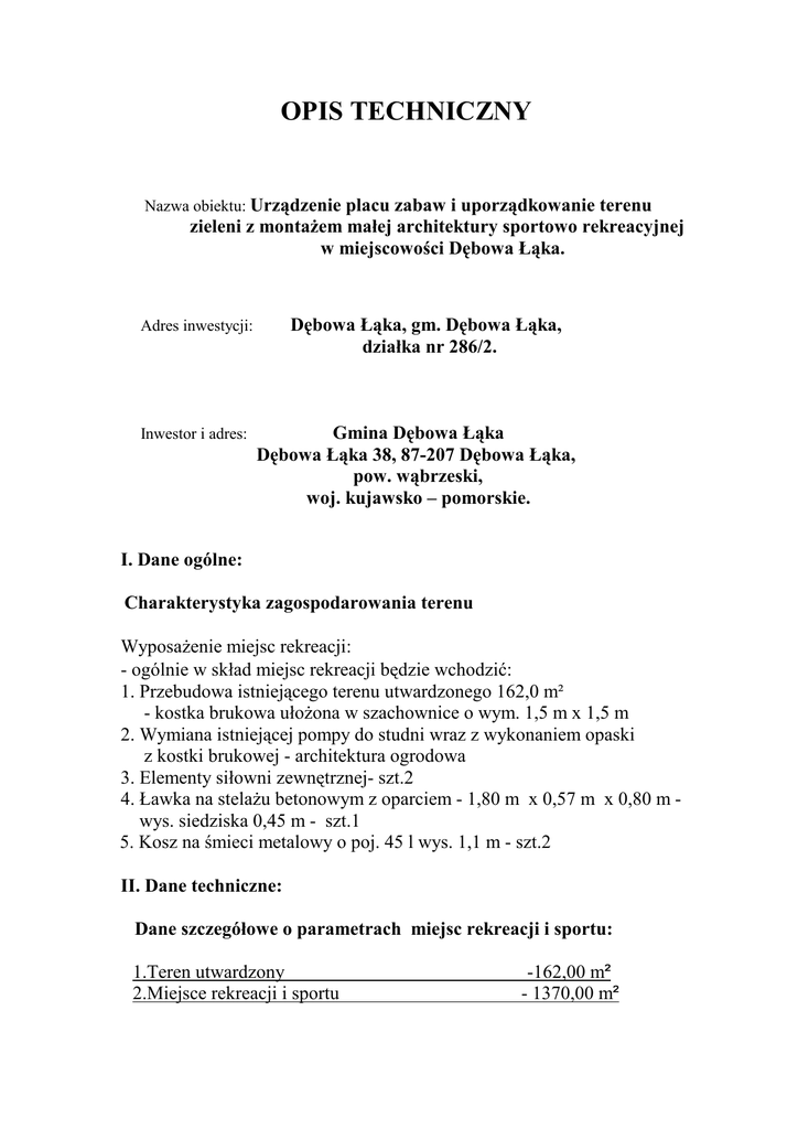 OPIS TECHNICZNY Nazwa obiektu: Urządzenie placu zabaw i uporządkowanie terenu zieleni z montażem małej architektury sportowo rekreacyjnej w miejscowości Dębowa Łąka. Dębowa Łąka, gm. Dębowa Łąka, działka nr 286/2. Adres inwestycji: Inwestor i adres: Gmina Dębowa Łąka Dębowa Łąka 38, 87-207 Dębowa Łąka, pow. wąbrzeski, woj. kujawsko – pomorskie. I. Dane ogólne: Charakterystyka zagospodarowania terenu Wyposażenie miejsc rekreacji: - ogólnie w skład miejsc rekreacji będzie wchodzić: 1. Przebudowa istniejącego terenu utwardzonego 162,0 m² - kostka brukowa ułożona w szachownice o wym. 1,5 m x 1,5 m 2. Wymiana istniejącej pompy do studni wraz z wykonaniem opaski z kostki brukowej - architektura ogrodowa 3. Elementy siłowni zewnętrznej- szt.2 4. Ławka na stelażu betonowym z oparciem - 1,80 m x 0,57 m x 0,80 m wys. siedziska 0,45 m - szt.1 5. Kosz na śmieci metalowy o poj. 45 l wys. 1,1 m - szt.2 II. Dane techniczne: Dane szczegółowe o parametrach miejsc rekreacji i sportu: 1.Teren utwardzony 2.Miejsce rekreacji i sportu -162,00 m² - 1370,00 m² III. Warunki lokalizacyjne: 1. Poziom wód gruntowych – poniżej podbudowy placów. 2. Dopuszczalne naprężenia na grunt: f = 1,5 kg/cm2 3. Poziom powierzchni terenu utwardzonego – 97,55 m n.p.m. IV. Konstrukcja: A. Wyposażenie miejsc rekreacji: Sposób ustawienia elementów przedstawia załącznik graficzny do opisu technicznego. Parametry techniczne elementów miejsc rekreacji: 1. Kosz na śmieci metalowy o poj. 45 l wys. 1,1 m - szt.2 - Kosz z blachy ocynkowanej, lakierowanej, o pojemności 45 l, fi 45 cm, na stelażu metalowym, zakotwiony blokiem fundamentowym 30 cm x 30 cm x 30 cm na głębokość 60 cm p.p.terenu. 2. Ławka na stelażu betonowym z oparciem - 1,80 m x 0,57 m x 0,80 m wys. siedziska 0,45 m - szt.1 - Betonowy stelaż ławki wykonany na bazie twardych kruszyw z surowców naturalnych. Konstrukcja podporowa stalowo-betonowa o dużej odporności na warunki pogodowe i mechaniczne uszkodzenia. Siedziska i oparcia drewniane impregnowane preparatem na bazie naturalnych olejów i wosków. Zakotwienie ławki na głębokość 50 cm p.p.terenu. 3. Utwardzenie powierzchni składać się będzie z następujących warstw oraz ich miąższości: - Kostka betonowa gr. 6 cm - Podsypka cementowo - piaskowa gr. 4 cm - Górna warstwa podbudowy z kruszywa naturalnego gr. 5 cm o frakcji 2 – 8 mm - Dolna warstwa podbudowy z kruszywa naturalnego gr. 10 cm o frakcji 4 – 31,5 mm - Warstwa odsączająca z piasku gr. 12 cm - Grunt nośny o wskaźniku zagęszczenia Is = 0,98 4. Obrzeża betonowe, krawężniki najazdowe wg katalogów elementów drogowych, osadzone na pospółce i ławie betonowej z oporem B 15 wg rysunków. Lokalizację elementów konstrukcyjnych oraz szczegóły pokazano na planie zagospodarowania, przekrojach podłużnych oraz przekrojach poprzecznych. 5. Odwodnienie terenów utwardzonych zrealizowane będzie przez układ następujących czynników: a. pochylenie podłużne i poprzeczne nawierzchni terenów utwardzonych, b. spływ wód na teren zielony - chłonny, 6. Pompa ręczna z misą H7 ZM. Specyfikacja techniczna: - materiał: średnica tłoka średnica przyłącza ssącego wydajność głębokość ssania wysokość waga pompy waga pompy z misą kolor - żeliwo - 90 mm - 1 ½ cala - 40 l/min - 25 m - 170 cm - 85 kg - 125 kg - czarny 7. Element siłowni zewnętrznej a. zestaw 3w1 – umożliwia na jednej konstrukcji wykonywanie trzech rodzajów ćwiczeń tj.: - bioderka – ćwiczenie naprzemienne mięśni brzucha, pośladków, ud i podudzi, naprzemienne ruchy obrotowe biodrami - narciarz - ćwiczenie mięśni bioder, brzucha, ud, podudzi oraz mięśni lędźwiowych, ruchy wahadłowe ciałem od pasa w dół, - chodzik - ćwiczenie mięśni od pasa w dół, ud i podudzi, naprzemienne wymachy nóg tzw. duże kroki. b. zestaw 2w1 – umożliwia na jednej konstrukcji wykonywanie dwóch rodzajów ćwiczeń (zestaw z jednym rodzajem ćwiczeń dla dwóch osób siedzących naprzeciw siebie) tj.: - huśtawka - ćwiczenie mięśni nóg, naprzemiennie wyprost i ugięcie nóg. Elementy konstrukcyjne siłowni plenerowej, winny być wykonane ze szlifowanej stali nierdzewnej gat. AISI 304, natomiast stopki wykonane będą z antypoślizgowej blachy aluminiowej. Elementy takie jak: siedziska typu stadionowego odporne na promieniowanie UV winny posiadać wewnętrzną konstrukcję wzmacniającą ze stali nierdzewnej oraz atest. Elementy ruchome będą łączone na łożyskach krytych typu 2RS. Całość konstrukcji należy tak wykonać aby w maksymalny sposób zabezpieczyć przed wandalizmem (demontaż fragmentów urządzeń) poprzez ograniczenie dostępu do śrub i nakrętek. Zestawy urządzeń do ćwiczeń będą utwierdzone w fundamencie według indywidualnej instrukcji montażu zalecane przez producenta. Urządzenia winny spełniać wymagania normy bezpieczeństwa PN-EN 1176:2009 oraz PN-EN 957:2005 i posiadać certyfikat TÜV. Na każdym urządzeniu winna znajdować się indywidualna instrukcja użytkowania w formie nalepki zgodnej z wymogami TÜV. V. Zieleń: Projektowany teren zieleni wykonany będzie z trawy z zasiewu. Trawa wymaga spulchnienia na głębokość 15-25cm. Następnie należy rozścielić 10 cm warstwę żyznej gleby. Dodać kompost lub torf. Odczyn gleby powinien być lekko kwaśny. Powierzchnia gleby musi być dokładnie wyrównana i zwałowana wałem oraz płytko zagrabiona. Trawę wysiewać w pogodę bezwietrzną, gdy wilgotność powietrza i gleby jest umiarkowana. Wysiana trawa winna być w miarę przykryta a następnie uwałowana. W ramach zadania wchodzi również pielęgnacja nawadniająca wschodzącą trawę. Trawniki należy wykonać po zakończeniu wszystkich prac budowlanych. VI. Uwagi: 1. Do zagospodarowanie terenu pod miejsce rekreacji, należy stosować materiały budowlane posiadające certyfikaty jakości i atesty. Świadectwa jakości należy przechowywać i okazyw