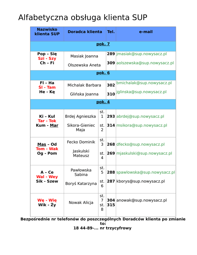 Alfabetyczna obsługa klienta SUP Nazwisko klienta SUP Doradca klienta Tel. e-mail pok. 7 Pop – Się Szi - Szy Ch – Fi 289 [email protected] Masiak Joanna Olszewska Aneta 309 [email protected] pok. 6 Fl – Ha Śl - Tam He - Kę Michalak Barbara 302 Glińska Joanna 310 [email protected] [email protected] pok. 4 Ki – Kul Tar - Tok Kum - Mar Mas – Od Tom - Wak Og - Pom A – Ce Wal - Wey Sik - Szew Wę - Wię Wik - Ży Brdej Agnieszka st. 1 293 [email protected] Sikora-Gieniec Maja st. 314 [email protected] 2 Fecko Dominik st. 3 268 [email protected] Jaskulski Mateusz Pawłowska Sabina st. 269 [email protected] 4 st. 5 288 [email protected] Boryś Katarzyna st. 287 [email protected] 6 Nowak Alicja st. 7 304 [email protected] st. 315 8 Bezpośrednie nr telefonów do poszczególnych Doradców klienta po zmianie to: 18 44-89-... nr trzycyfrowy