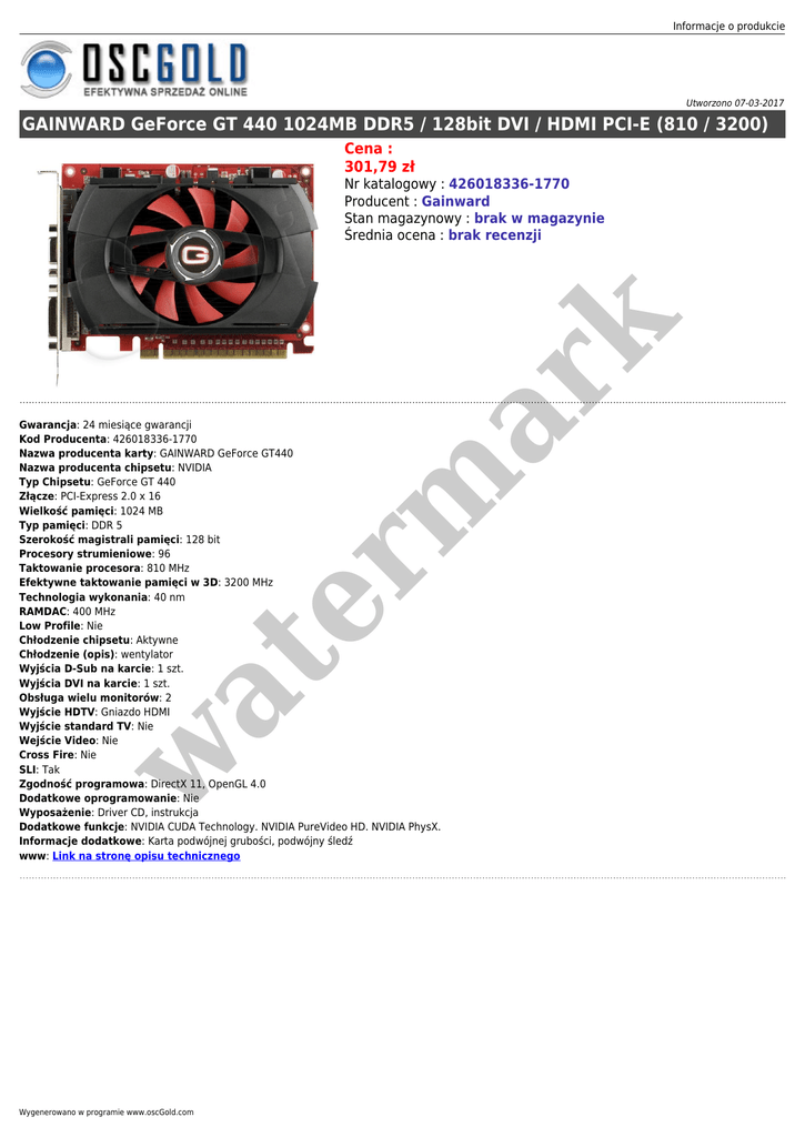 Informacje o produkcie Utworzono 07-03-2017 GAINWARD GeForce GT 440 1024MB DDR5 / 128bit DVI / HDMI PCI-E (810 / 3200) Cena : 301,79 zł er m ar k Nr katalogowy : 426018336-1770 Producent : Gainward Stan magazynowy : brak w magazynie Średnia ocena : brak recenzji w at Gwarancja: 24 miesiące gwarancji Kod Producenta: 426018336-1770 Nazwa producenta karty: GAINWARD GeForce GT440 Nazwa producenta chipsetu: NVIDIA Typ Chipsetu: GeForce GT 440 Złącze: PCI-Express 2.0 x 16 Wielkość pamięci: 1024 MB Typ pamięci: DDR 5 Szerokość magistrali pamięci: 128 bit Procesory strumieniowe: 96 Taktowanie procesora: 810 MHz Efektywne taktowanie pamięci w 3D: 3200 MHz Technologia wykonania: 40 nm RAMDAC: 400 MHz Low Profile: Nie Chłodzenie chipsetu: Aktywne Chłodzenie (opis): wentylator Wyjścia D-Sub na karcie: 1 szt. Wyjścia DVI na karcie: 1 szt. Obsługa wielu monitorów: 2 Wyjście HDTV: Gniazdo HDMI Wyjście standard TV: Nie Wejście Video: Nie Cross Fire: Nie SLI: Tak Zgodność programowa: DirectX 11, OpenGL 4.0 Dodatkowe oprogramowanie: Nie Wyposażenie: Driver CD, instrukcja Dodatkowe funkcje: NVIDIA CUDA Technology. NVIDIA PureVideo HD. NVIDIA PhysX. Informacje dodatkowe: Karta podwójnej grubości, podwójny śledź www: Link na stronę opisu technicznego Wygenerowano w programie www.oscGold.com