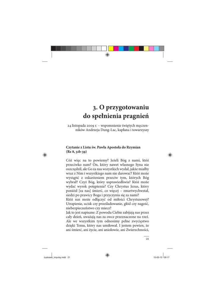 3. O przygotowaniu do spełnienia pragnień 24 listopada 2009 r. – wspomnienie świętych męczenników Andrzeja Dung-Lac, kapłana i towarzyszy Czytanie z Listu św. Pawła Apostoła do Rzymian (Rz 8, 31b-39) Cóż więc na to powiemy? Jeżeli Bóg z nami, któż przeciwko nam? On, który nawet własnego Syna nie oszczędził, ale Go za nas wszystkich wydał, jakże miałby wraz z Nim i wszystkiego nam nie darować? Któż może wystąpić z oskarżeniem przeciw tym, których Bóg wybrał? Czyż Bóg, który usprawiedliwia? Któż może wydać wyrok potępienia? Czy Chrystus Jezus, który poniósł [za nas] śmierć, co więcej – zmartwychwstał, siedzi po prawicy Boga i przyczynia się za nami? Któż nas może odłączyć od miłości Chrystusowej? Utrapienie, ucisk czy prześladowanie, głód czy nagość, niebezpieczeństwo czy miecz? Jak to jest napisane: Z powodu Ciebie zabijają nas przez cały dzień, uważają nas za owce przeznaczone na rzeź. Ale we wszystkim tym odnosimy pełne zwycięstwo dzięki Temu, który nas umiłował. I jestem pewien, że ani śmierć, ani życie, ani aniołowie, ani Zwierzchności, 21 âaskawe_impulsy.indd 21 15-05-13 09:17 ani rzeczy teraźniejsze, ani przyszłe, ani Moce, ani co wysokie, ani co głębokie, ani jakiekolwiek inne stworzenie nie zdoła nas odłączyć od miłości Boga, która jest w Chrystusie Jezusie, Panu naszym. Oto Słowo Boże. EWANGELIA (Łk 9, 23 – 26) Potem mówił do wszystkich: „Jeśli kto chce iść za Mną, niech się zaprze samego siebie, niech co dnia bierze krzyż swój i niech Mnie naśladuje! Bo kto chce zachować swoje życie, straci je, a kto straci swe życie z Mego powodu, ten je zachowa. Bo cóż za korzyść ma człowiek, jeśli cały świat zyska, a siebie zatraci lub szkodę poniesie? Kto się bowiem Mnie i słów moich zawstydzi, tego Syn Człowieczy wstydzić się będzie, gdy przyjdzie w swojej chwale oraz w chwale Ojca i świętych aniołów”. Oto Słowo Pańskie. W dzisiejszym słowie, dobranym z okazji wspomnienia Świętych Męczenników Wietnamskich, Jezus zwraca się nie tylko do uczniów, ale do wszystkich ludzi i zaprasza byśmy podejmowali nie jakieś dodatkowe umartwienia, ale abyśmy odpowiedzialnie podjęli własne powołanie. Wzywa nas do pracy nad sobą, czego wynikiem będzie właściwy styl naszego życia, a nie jakiś chwilowy zryw. Ponieważ ten apel obejmuje wszystkich, zastanówmy się nad nim odnosząc go do małżeństwa, ku któremu dąży (zgodnie z podaną intencją Mszy św.) większość Uczestników tej Eucharystii. Gdy patrzmy na sakramentalny związek dwóch osób, to widzimy, że w małżeństwie, w którym dwoje staje się jednym ciałem (por. Mt 19,5), owe zadania i trudy (czyli krzyż) mają być niesione wspólnie. Nad tym, że zawarcie małżeństwa zmienia 22 âaskawe_impulsy.indd 22 15-05-13 09:17 (powinno zmienić) dotychczasowy tryb życia obojga, że wiąże się z rozmaitymi obowiązkami, odpowiedzialnością i zadaniami, nie chciałbym się tu zatrzymywać. Niestety w obiegowej opinii trudności wspólnego podejmowania zadań bywają nieraz tak wyolbrzymiane, że często skutkuje to lękami (nie musi to być jedyny powód) prowadzącymi do jakiejś niemocy decyzyjnej – „strach ma wielkie oczy”. To z kolei czasem prowadzi do wegetacji w związku bez sakramentu. W takiej postawie z duchowego punktu widzenia widać przede wszystkim brak zaufania, brak wiary (za rozwój której jest się odpowiedzialną/ym od początku, a nie np. dopiero w okresie narzeczeństwa). Chodzi o wiarę w znaczeniu zaufania, że Bóg ma coś do powiedzenia w moim/naszym życiu, że to On mnie/nas poprowadzi i że z Jego pomocą to, co (na razie) wydaje się przerastać ludzkie możliwości, przyniesie dobre owoce. I właśnie we fragmencie z Listu do Rzymian słyszeliśmy ten okrzyk ufnego optymizmu: „Jeżeli Bóg z nami, któż przeciwko nam?”. To zdanie wspaniale stosuje się właśnie do sakramentu małżeństwa. Przypomnijmy w tym miejscu, że każdy sakrament to widzialny znak SKUTECZNEJ ŁASKI. Znak tego, że Bóg zobowiązuje się do podtrzymywania tego związku poprzez ich (obojga) zaangażowanie się. Chodzi tu o zaufanie tych dwojga, którzy chcą iść przez życie razem, którzy uznają, że ich relacja będzie się rozwijała nie tylko dzięki ich osobistym siłom, ale że ona będzie wzrastać jeśli Oni Mu zaufają. Dzisiejsza Ewangelia mówi jednak o „braniu swojego krzyża” (czyli zadań składających się na powołanie) nie dopiero kiedyś, w przyszłości, ale już teraz, „na każdy dzień”, gdy ona i on jeszcze nie się znają. Co zatem jest tym charakterystycznym zadaniem dla „poszukujących” już teraz, w czasie „poszukiwań”? 23 âaskawe_impulsy.indd 23 15-05-13 09:17 Papież św. Pius XI powiedział, że „staranny wybór małżonka” to istota bliższego przygotowania się do małżeństwa. A to oznacza, że Osoby poszukujące (za Które się tu modlimy) przeżywają już kolejny etap przygotowania się do małżeństwa, i to niezależnie od tego, czy sobie zdawały z tego sprawę, czy nie. Ten sam św. Pius XI naucza, że „przygotowanie dalsze [do małżeństwa] polega na wychowaniu”. Tę myśl rozwija Katechizm Kościoła Katolickiego (nr 2206): „Najwłaściwszym sposobem przygotowania do [zawarcia małżeństwa] jest przykład i wychowanie przekazane przez rodziców i rodzinę”. Intencja tej Mszy św. wskazuje, że zainteresowani już „coś” wiedzą o tym, do czego są powołani. Będzie zatem chodziło o podejmowanie już teraz takich działań, które niejako uprzedzając owe „upragnione” wydarzenia, pomogą lepiej wypełnić swoje powołanie w małżeństwie. Przypomnijmy zatem, że Kościół wyróżnia TRZY etapy przygotowania do małżeństwa: 1. Przygotowanie DALSZE; (przykład i wychowanie w rodzinie); 2. Przygotowanie BLIŻSZE: trwa w okresie narzeczeństwa, ma na celu staranny wybór małżonka, obe