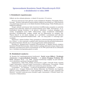 Sprawozdanie Komitetu Nauk Filozoficznych PAN z działalności w roku 2000 I. Działalność organizacyjna Odbyły si˛e dwa zebrania plenarne, w dniach 24 stycznia i 19 czerwca. Pierwsze poświ˛econe było głównie ocenie działalności Redakcji "Przegladu ˛ Filozoficznego". Komitet zaakceptował sprawozdanie redaktora naczelnego kol. Jacka Hołówki oraz poparł jego propozycje co do składu Komitetu Redakcyjnego i Rady Redakcyjnej na najbliższa˛ kadencj˛e. Drugie zebranie poświ˛econe było kryteriom kwalifikowania czasopism na potrzeby kategoryzacji jednostek naukowych przeprowadzanej przez KBN. Stwierdzono, że rekomendacje naszego Komitetu w tej sprawie, uchwalone z końcem ubiegłego roku zostały uwzgl˛ednione przez KBN. Jednocześnie, majac ˛ świadomość niedostatków procedury kwalifikacyjnej, podj˛eto narad˛e nad jej ulepszeniem na nast˛epne lata. Wi˛ecej danych na ten temat znajduje si˛e w protokóle z posiedzenia pod adresem www.calculemus.org/knf/00/zebrplen2.html. Zob. też niżej punkt V.3 obecnego sprawozdania. Referat kol. Adama Groblera "Stan i perspektywy uniwersyteckiego nauczania filozofii w Polsce", w dwu cz˛eściach, wypełnił cz˛eść merytoryczna˛ obu posiedzeń plenarnych. Prezydium Komitetu zbierało si˛e w celu przygotowania zebrań plenarnych. Komisja ds. Kategoryzacji Czasopism Filozoficznych, w składzie dwóch członków Komitetu (Witold Marciszewski, Adam Grobler) i jednego dokooptowanego eksperta (Jan Hartman), powołana przez KNF na posiedzeniu 18.10.1999, pracowała nie na zebraniach lecz w kontakcie korespondencyjnym (e-mail). II. Działalność naukowa A. Komitet był współorganizatorem konferencji: Tarski versus Hilbert: Wynikanie sematyczne a wyprowadzalność formalna — w stulecie Drugiego Problemu Hilberta, Zakopane 30.IX - 3.X. 2000. Program Konferencji znajduje si˛e pod adresem: www.calculemus.org/forum/3/programIV.html Organizatorzy: KNF PAN, Polskie Towarzystwo Logiki i Filozofii Nauki, Katedra Logiki, Informatyki i Filozofii Nauki Uniwersytetu w Białymstoku. Personalnie: Witold Marciszewski. Koszt ogółem 10.600, koszt poniesiony przez Komitet - 2.300 Uczestników – 28, referatów – 8 (odczyty dwugodzinne), komunikatów – 4. Odczyty wygłosili m.in. Grzegorz Malinowski, Roman Murawski, Jan Woleński, Jan Zygmunt. Odczyty zostana˛ opublikowane w wersji angielskiej w "Studies in Logic, Grammar and Rhetoric" (rocznik wydawany przez Katedr˛e Logiki, Informatyki i Filozofii Nauki Uniwersytetu w Białymstoku). 2 W. Marciszewski: Sprawozdanie KNF PAN za rok 2000 B. Zorganizowana przez Komitet wspólnie z IFiS PAN konferencja Władysław Tatarkiewicz – człowiek i dzieło, w dwudziestolecie śmierci odbyła si˛e w Warszawie, Pałac Staszica, 23.XI.2000. Organizatorzy: Stanisław Borzym i Lech Szczucki. Współorganizator ze strony KNF – Andrzej Grzegorczyk. Wkład finansowy Komitetu — 1500 zł. Uczestników – 25, odczytów – 8 (A.Biernacki, S.Borzym, Cz.Głombik, S.Morawski, J.Pelc, S.Swieżawski, R.Wiśniewski, K.Zwolińska). Teksty odczytów zostana˛ opublikowane w "Przegladzie ˛ Filozoficznym". III. Współpraca naukowa z zagranica˛ Co do udziału członków Komitetu w konferencjach naukowych za granica,˛ nie prowadzimy w tej sprawie ewidencji. Orientacyjnie: conajmniej 15 referatów wygłoszono w 2000 za granica; ˛ liczba ta oddaje zagraniczna˛ aktywność odczytowa˛ czterech logików członków Komitetu, o której wiadomo autorowi sprawozdania. Co do działalności komitetów narodowych, za rok 2000 nie ma danych do odnotowania, ale tytułem uzupełnienia do sprawozdania za rok 1999, które nie było robione według obecnie obowiazuj ˛ acego ˛ formularza i z tego powodu nie uwzgl˛edniało pewnych punktów, należy dodać, co nast˛epuje. Komitet Narodowy do współpracy z Sekcja˛ Logiki, Metodologii i Filozofii Nauki (w Mi˛edzynarodowej Unii Historii i Filozofii Nauki) brał znaczacy ˛ udział w realizacji XI Mi˛edzynarodowego Kongresu Logiki, Metodologii i Filozofii Nauki w Krakowie, 20-26 sierpień 1999. Reprezentant Komitetu Narodowego kol. Jan Woleński (wiceprzewodniczacy ˛ KNF) był inicjatorem zorganizowania Kongresu w Polsce, Przewodniczacym ˛ jego Komitetu Organizacyjnego i jego gospodarzem. IV. Działalność wydawnicza Komitet wspólnie z IFiS PAN wydaje kwartalnik "Przeglad ˛ Filozoficzny". Ukazały si˛e cztery zeszyty w łacznej ˛ obj˛etości 60 arkuszy wyd., nakład 300 egzemplarzy (plus gratisy), cena egzemplarza 11 zł. Redaktor naczelny - kol. Jacek Hołówka, wydawca IFiS PAN. V. Inna działalność Komitetu 1. Komitet w niewielkim zakresie prowadzi działalność merytoryczna˛ w formie odczytów i dyskusji na zebraniach, ale uzupełnia ten nurt pracy aktywnościa˛ korespondencyjna˛ w formie tekstów rozsyłanych członkom i na stronach WWW. Przykład: pismo rozesłane przez Przewodniczacego ˛ kol. Grzegorczyka 25 września zawierajace ˛ tekst jego autorstwa (z zach˛eta˛ do dyskusji) pt. "Analiza fenomenologiczna kondycji moralnej społeczeństwa jako cz˛eść analizy fenomenologicznej bytu społecznego". 2. Kontynuowane jest (przez W.Marciszewskiego) redagowanie i programowanie techniczne stron internetowych majacych ˛ charakter serwisu informacyjnego i forum dyskusyjnego. W serwisie tym zamieszcza si˛e m.in. protokóły posiedzeń plenarnych. W. Marciszewski: Sprawozdanie KNF PAN za rok 2000 3 Protokóły z posiedzeń wymienionych wyżej w dziale I sa˛ dost˛epne pod adresami: www.calculemus.org/knf/00/zebplen1.html www.calculemus.org/knf/00/zebplen2.html 3. Komisja ds. Kategoryzacji Czasopism Filozoficznych gromadzi materiały pomocne do dalszych prac nad zasadami procedury kwalifikacyjnej. Sformułowanie możliwie obiektywnych kryteriów wymaga czasu na przyjrzenie si˛e możliwym rozwiazaniom. ˛ Materiały na ten temat sa˛ dost˛epne pod adresem www.calculemus.org/knf/00/, pod którym znajduja˛ si˛e nast˛epujace ˛ pliki nadesłane przez c