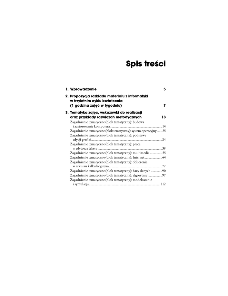Spis treści 1. Wprowadzenie 5 2. Propozycja rozkładu materiału z informatyki w trzyletnim cyklu kształcenia (1 godzina zajęć w tygodniu) 7 3. Tematyka zajęć, wskazówki do realizacji oraz przykłady rozwiązań metodycznych 13 Zagadnienie tematyczne (blok tematyczny): budowa i zastosowanie komputera................................................................. 14 Zagadnienie tematyczne (blok tematyczny): system operacyjny ......25 Zagadnienie tematyczne (blok tematyczny): podstawy edycji grafiki........................................................................................34 Zagadnienie tematyczne (blok tematyczny): praca w edytorze tekstu ................................................................................39 Zagadnienie tematyczne (blok tematyczny): multimedia ............... 55 Zagadnienie tematyczne (blok tematyczny): Internet......................64 Zagadnienie tematyczne (blok tematyczny): obliczenia w arkuszu kalkulacyjnym..................................................................77 Zagadnienie tematyczne (blok tematyczny): bazy danych ..............90 Zagadnienie tematyczne (blok tematyczny): algorytmy ..................97 Zagadnienie tematyczne (blok tematyczny): modelowanie i symulacja......................................................................................... 112 Tematyka zajęć, wskazówki do realizacji oraz przykłady rozwiązań metodycznych Poniżej wyszczególnione są zagadnienia tematyczne z uwzględnieniem liczby godzin na ich realizację (w ciągu trzech lat nauki). Dla każdego z zagadnień (bloków) tematycznych określono, które założenia podstawy programowej kształcenia ogólnego z zakresu informatyki są realizowane. Dla niektórych tematów lekcyjnych przedstawione są cele ogólne, szczegółowe oraz podany jest przykładowy przebieg zajęć wraz z propozycją zadań domowych. Dla innych podane są jedynie wskazówki, które mogą pomóc w przygotowaniu czy realizacji zajęć, gdyż założeniem tego poradnika nie jest podanie gotowych rozwiązań poszczególnych zajęć z informatyki, lecz ukierunkowanie działań nauczyciela. Podczas realizacji kolejnych zagadnień musimy pamiętać o indywidualizacji nauczania i konieczności dostosowania metod do możliwości uczniów. W poradniku uwzględniono również przykładowe zestawy ćwiczeń do zajęć lekcyjnych. Zawarte są w nich ćwiczenia do poszczególnych tematów lekcji. Zestawy ćwiczeń są ponumerowane i znajdują się na płycie CD-ROM dla nauczyciela. 14 PORADNIK METODYCZNY DLA GIMNAZJUM Treści programowe w poradniku (podobnie jak w programie nauczania) obudowane są wokół zagadnień tematycznych (bloków tematycznych): 1. Budowa i zastosowanie komputera 2. System operacyjny 3. Podstawy edycji grafiki 4. Praca z edytorem tekstu 5. Multimedia 6. Internet i sieci 7. Obliczenia w arkuszu kalkulacyjnym 8. Bazy danych 9. Algorytmy 10. Modelowanie i symulacja Zagadnienie tematyczne (blok tematyczny): budowa i zastosowanie komputera Podstawa programowa: Posługiwanie się sprzętem i korzystanie z usług systemu operacyjnego. Podstawowe elementy komputera i ich funkcje. Zasady bezpiecznej pracy z komputerem. Podstawowe usługi systemu operacyjnego. Społeczne, etyczne i ekonomiczne aspekty rozwoju informatyki. Konsekwencje dla osób i społeczeństw. Zagrożenia wychowawcze: szkodliwe gry, deprawujące treści, uzależnienie. Zagadnienia etyczne i prawne związane z ochroną własności intelektualnej i ochroną danych. I ROK NAUKI (8 godzin) 1. Regulamin szkolnej pracowni komputerowej. Przedmiotowy system oceniania z informatyki. II ROK NAUKI (2 godziny) 1. Organizacja pracy na zajęciach z informatyki. Przedmiotowy system oceniania z informatyki. III ROK NAUKI (2 godziny) 1. Organizacja pracy na zajęciach z informatyki. Przedmiotowy system oceniania z informatyki. TEMATYKA ZAJĘĆ, WSKAZÓWKI DO REALIZACJI... I ROK NAUKI (8 godzin) 2. Bezpieczna i higieniczna praca z komputerem (EP). 3. Znaczenie komputera we współczesnym świecie (EF). 4. Ochrona własności intelektualnej. Prawo autorskie. II ROK NAUKI (2 godziny) 2. Zagadnienia etyczne i prawne związane z ochroną własności intelektualnej (EF). 15 III ROK NAUKI (2 godziny) 2. Zagrożenia i pożytki wynikające z zastosowań komputerów i powszechnego dostępu do informacji (EF). 5. Budowa komputera. 6. – 7. Urządzenia służące do komunikowania się z użytkownikiem. 8. Przygotowanie zestawu komputerowego do pracy. Na realizację pierwszego bloku tematycznego „Budowa i zastosowanie komputera” przewidziano 12 jednostek lekcyjnych w 3-letnim cyklu kształcenia. Jeśli w danej szkole przewidziany jest 2-letni cykl kształcenia z zakresu informatyki, zagadnienia tematyczne z każdego z bloków należy rozłożyć na 2 lata. Zakres treści nauczania: Regulamin szkolnej pracowni komputerowej. Przedmiotowy system oceniania z informatyki. Bezpieczna i higieniczna praca z komputerem. Znaczenie komputera we współczesnym świecie. Zagrożenia i pożytki wynikające z zastosowań komputerów i powszechnego dostępu do informacji. Dziedziny życia, w których ma zastosowanie komputer. Informatyka jako dziedzina wiedzy. Prawo autorskie. Co jest własnością w Internecie, a co nie? Budowa komputera. Urządzenia wejściowe i wyjściowe. Jednostki pamięci. Podłączanie elementów zestawu komputerowego (treści rozszerzające). Osiągnięcia ucznia: Uczeń: ♦ stosuje się do zasad regulaminu szkolnej pracowni komputerowej; ♦ potrafi wyjaśnić, na czym polega higieniczna i bezpieczna praca z komputerem; 16 PORADNIK METODYCZNY DLA GIMNAZJUM ♦ wie, jakie znaczenie ma komputer we współczesnym świecie oraz w jakich dziedzinach znalazł zastosowanie; ♦ rozumie potrzebę wykorzystania wszechstronnego narzędzia, jakim jest komputer; ♦ potrafi wyjaśnić pojęcie: informatyka; ♦ zna pojęcia: prawo autorskie, licencja (wymienia i opisuje przykłady licencji), piractwo komputerowe; ♦ r