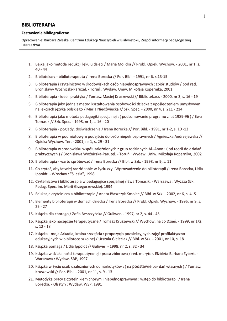 1 BIBLIOTERAPIA Zestawienie bibliograficzne Opracowanie: Barbara Zaleska. Centrum Edukacji Nauczycieli w Białymstoku, Zespół informacji pedagogicznej i doradztwa 1. Bajka jako metoda redukcji lęku u dzieci / Maria Molicka // Probl. Opiek. Wychow. - 2001, nr 1, s. 40 - 44 2. Bibliotekarz - biblioterapeuta / Irena Borecka // Por. Bibl. - 1991, nr 6, s.13-15 3. Biblioterapia i czytelnictwo w środowiskach osób niepełnosprawnych : zbiór studiów / pod red. Bronisławy Woźniczki-Paruzel. - Toruń : Wydaw. Uniw. Mikołaja Kopernika, 2001 4. Biblioterapia - idee i praktyka / Tomasz Maciej Kruszewski // Bibliotekarz. - 2000, nr 3, s. 16 - 19 5. Biblioterapia jako jedna z metod kształtowania osobowości dziecka z upośledzeniem umysłowym na lekcjach języka polskiego / Maria Niedźwiecka // Szk. Spec. - 2000, nr 4, s. 211 - 214 6. Biblioterapia jako metoda pedagogiki specjalnej : ( podsumowanie programu z lat 1989-96 ) / Ewa Tomasik // Szk. Spec. - 1998, nr 1, s. 16 - 20 7. Biblioterapia - poglądy, doświadczenia / Irena Borecka // Por. Bibl. - 1991, nr 1-2, s. 10 -12 8. Biblioterapia w podmiotowym podejściu do osób niepełnosprawnych / Agnieszka Andrzejewska // Opieka Wychow. Ter. - 2001, nr 1, s. 29 - 31 9. Biblioterapia w środowisku współuzależnionych z grup rodzinnych Al.-Anon : ( od teorii do działań praktycznych ) / Bronisława Woźniczka-Paruzel. - Toruń : Wydaw. Uniw. Mikołaja Kopernika, 2002 10. Biblioterapia - warto spróbować / Irena Borecka // Bibl. w Szk. - 1998, nr 9, s. 11 11. Co czytać, aby łatwiej radzić sobie w życiu czyli Wprowadzenie do bilioterapii / Irena Borecka, Lidia Ippoldt. - Wrocław : "Silesia", 1998 12. Czytelnictwo i biblioterapia w pedagogice specjalnej / Ewa Tomasik. - Warszawa : Wyższa Szk. Pedag. Spec. im. Marii Przegorzewskiej, 1994 13. Edukacja czytelnicza a biblioterapia / Aneta Błaszczyk-Smolec // Bibl. w Szk. - 2002, nr 6, s. 4 -5 14. Elementy biblioterapii w domach dziecka / Irena Borecka // Probl. Opiek. Wychow. - 1995, nr 9, s. 25 - 27 15. Książka dla chorego / Zofia Beszczyńska // Puliwer. - 1997, nr 2, s. 44 - 45 16. Książka jako narzędzie terapeutyczne / Tomasz Kruszewski // Wychow. na co Dzień. - 1999, nr 1/2, s. 12 - 13 17. Książka - moja Arkadia, kraina szczęścia : propozycja pozalekcyjnych zajęć profilaktycznoedukacyjnych w bibliotece szkolnej / Urszula Pieleciak // Bibl. w Szk. - 2001, nr 10, s. 18 18. Książka pomaga / Lidia Ippoldt // Puliwer. - 1998, nr 2, s. 32 - 34 19. Książka w działalności terapeutycznej : praca zbiorowa / red. merytor. Elżbieta Barbara Zybert. Warszawa : Wydaw. SBP, 1997 20. Książka w życiu osób uzależnionych od narkotyków : ( na podstawie ba- dań własnych ) / Tomasz Kruszewski // Por. Bibl. - 2001, nr 11, s. 9 - 13 21. Metodyka pracy z czytelnikiem chorym i niepełnosprawnym : wstęp do biblioterapii / Irena Borecka. - Olsztyn : Wydaw. WSP, 1991 2 22. Miejsce biblioteki w rehabilitacji osób z niepełnosprawnościami / Penowefa Surniak // Por. Bibl. 1999, nr 4, s. 12 - 13 23. O biblioterapii reminiscencyjnej / Małgorzata Dudzikowska, Ewa Tomasik // Szk. Spec. - 1998, nr 4, s. 279 - 284 24. O edukacji nauczycieli w zakresie biblioterapii / Irena Borecka // Bibliotekarz. - 2000, nr 7/8, s. 31 33 25. Symbole duszy / Birgitte Brun, Ernst W. Pedersen, Marianne Runberg. - Warszawa : Santorski and CO,. Agencja Wydaw., cop.1995 26. Terapeutyczny charakter książki / Tomasz Kruszewski // Nowe Książ. - 2000, nr 1, s. 78 - 79 27. Terapeutyczny charakter materiałów czytelniczych / Tomasz Kruszewski // Opieka Wychow. Ter. 2000, nr 1, s. 45 - 47 28. Terapia czytelnicza ( biblioterapia ) w szkołach masowych i specjalnych / Irena Borecka. - Wałbrzych : WOM, 1993 29. Terapia słowa / Tomasz Kruszewski // Probl. Alkoh. - 2001, nr 1, s. 12 - 13 30. Zajęcia biblioterapeutyczne : opis i analiza przypadku / Renata Zawadzka // Bibl. w Szk. - 2002, nr 5, s. 16 31. Zastosowanie biblioterapii i muzykoterapii w procesie dydaktyczno-wychowawczym i terapii pedagogicznej / Irena Borecka, Lilianna Piotrowska. - Wałbrzych : WOM, 1992