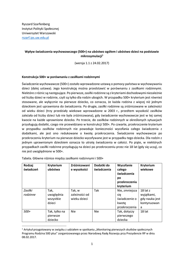 Ryszard Szarfenberg Instytut Polityki Społecznej Uniwersytet Warszawski rszarf.ips.uw.edu.pl Wpływ świadczenia wychowawczego (500+) na ubóstwo ogółem i ubóstwo dzieci na podstawie mikrosymulacji1 (wersja 1.1 z 24.02.2017) Konstrukcja 500+ w porównaniu z zasiłkami rodzinnymi Świadczenie wychowawcze (500+) zostało wprowadzone ustawą o pomocy państwa w wychowywaniu dzieci (dalej ustawa). Jego konstrukcję można przedstawić w porównaniu z zasiłkami rodzinnymi. Niektóre z różnic są następujące. Po pierwsze, zasiłki rodzinne są z kryteriami dochodowymi niezależnie od liczby dzieci w rodzinie, czyli są tylko dla rodzin ubogich. W przypadku 500+ kryterium jest również stosowane, ale wyłącznie na pierwsze dziecko, co oznacza, że każda rodzina z więcej niż jednym dzieckiem jest uprawniona do świadczenia. Po drugie, zasiłki rodzinne są zróżnicowane w zależności od wieku dzieci (trzy przedziały wiekowe wprowadzone w 2003 r., przedtem wysokość zasiłków zależała od liczby dzieci lub nie była zróżnicowana), gdy świadczenie wychowawcze jest w tej samej kwocie na każde uprawnione dziecko. Po trzecie, do zasiłków rodzinnych w określonych sytuacjach przysługują dodatki, czego nie przewidziano w konstrukcji 500+. Po czwarte, przekroczenie kryterium w przypadku zasiłków rodzinnych nie powoduje konieczności wycofania całego świadczenia z dodatkami, ale jest ono redukowane o kwotę przekroczenia. Świadczenie wychowawcze po przekroczeniu kryterium na pierwsze dziecko wycofywane jest w przypadku tego dziecka. Dla rodzin z jednym uprawnionym dzieckiem oznacza to utratę świadczenia w całości. Po piąte, w niektórych przypadkach zasiłki rodzinne przysługują na dzieci po przekroczeniu przez nie 18 lat (gdy się uczą), co nie jest uwzględnione w 500+. Tabela. Główne różnice między zasiłkami rodzinnymi i 500+ Rodzaj świadczeń Kryterium ubóstwa Zróżnicowani e wysokości Dodatki do świadczenia Zasiłki rodzinne Tak, uwzględnia wszystkie dzieci Tak, w zależności od wieku dzieci Tak 500+ Tak, tylko na pierwsze dziecko Nie Nie 1 Wycofanie całego świadczenia po przekroczeniu kryterium Nie, zmniejsza się świadczenie o kwotę przekroczenia Tak, dotyczy pierwszego dziecka Kryterium wiekowe 18 lat z wyjątkami, gdy nauka jest kontynuowan a 18 lat Artykuł przygotowany w związku z udziałem w spotkaniu „Monitoring pierwszych skutków społecznych Programu Rodzina 500 plus” zorganizowanego przez Narodową Radę Rozwoju przy Prezydencie RP w dniu 08.02.2017. 1 Źródło: opracowanie własne Konstrukcja 500+ ma kilka ważnych konsekwencji, najważniejszą jest rozszerzenie zakresu podmiotowego uprawnionych rodzin. Gdyby wszystkie rodziny miały tylko jedno dziecko, wówczas różnica między uprawnionymi do zasiłków rodzinnych i uprawnionymi do 500+ zależałaby wyłącznie od różnicy w kryterium dochodowym. Ponieważ w 500+ zastosowano kryteria wyższe (obecnie 800 zł do 674 zł i 1200 zł do 764 zł), to włączyło więcej rodzin w krąg uprawnionych, w szczególności tych z dzieckiem niepełnosprawnym. Rozszerza ten krąg usunięcie kryterium dla kolejnych dzieci. Jeżeli wszystkie rodziny miałyby więcej niż jedno dziecko, wówczas każda z nich byłaby uprawniona do świadczenia. Średnio miesięcznie zasiłki rodzinne wypłacano na 2 mln dzieci w 2015 r. (liczba ta systematycznie zmniejszała się, sprawozdania MPiPS), a z 500+ korzystało 3,8 mln dzieci pod koniec 2016 r. Można więc szacować liczbę nowych dzieci objętych świadczeniami na 1,8 miliona. Nie oznacza to, że mamy świadczenie powszechne, gdyż około 3,1 miliona dzieci nie jest uprawnionych. Poza konstrukcją 500+ ważne konsekwencje wynikają z ustalenia poziomu tego świadczenia. Średni zasiłek rodzinny na dziecko wynosi obecnie 118 zł, a świadczenie wychowawcze jest to 500 zł. Poziom tego drugiego jest więc 4,2 razy wyższy. Porównanie to powinno jednak uwzględniać również dodatki do zasiłków rodzinnych, które zapewne zwiększą średnią, np. dodatek dla rodzin wielodzietnych wynosi obecnie 95 zł. A więc w przypadku rodzin wielodzietnych i tylko tego dodatku należy porównać 213 zł do 500 zł. Iloraz wynosi teraz 2,3, a więc nadal poziom świadczenia wychowawczego jest ponad dwa razy wyższy. Różnice te będą się zmniejszały, o ile w kolejnych latach kryteria i zasiłki rodzinne będą weryfikowane i zwiększane w dotychczasowej trzyletniej procedurze, a 500+ (w tym kryteria) pozostanie na poziomie pierwotnym. Wniosek jest więc następujący, 500+ zasadniczo zwiększyło zakres podmiotowy oraz poziom świadczeń dla rodzin z dziećmi w porównaniu z zasiłkami rodzinnymi. Nie jest to jednak świadczenie powszechne obejmujące wszystkie dzieci. Ograniczenie ubóstwa wśród celów 500+ W uzasadnieniu do projektu ustawy stwierdzono odnośnie jej podstawowego celu, że jest nim: „pomoc finansowa kierowana do rodzin wychowujących dzieci” oraz „wsparcie ekonomiczne rodzin, w szczególności tych zagrożonych ubóstwem, oraz częściowe pokrycie wydatków rodziców lub opiekunów dzieci z tytułu wysokich kosztów ich wychowania i wykształcenia” (Sejm 2016). Z kolei w prezentacji projektu w Sejmie stwierdzono, że świadczenie ma trzy główne równorzędne cele: „zwiększenie wskaźnika dzietności, inwestycja w kapitał ludzki, redukcja biedy wśród najmłodszych Polaków” (Rafalska 2016). W tej samej prezentacji podkreślano możliwy wpływ świadczenia na ubóstwo w następujący sposób: „dzięki wprowadzeniu świadczenia wychowawczego ubóstwo może spaść o trzy punkty procentowe, a zagrożenie ubóstwem wśród dzieci do 17. roku życia maleje, uwaga, z 23,3% do 11%” (tamże). Wskaźniki ubóstwa dzieci w ostatnich kilku latach przedstawiają dwa poniższe wykresy. 2 Odsetek ubogich dzieci w ujęciu relatywnym i absolutnym (w %) 25 23,1 22 21,8 21,8 20,6 20 15 10,3 10,1 9,8 9,7 10 9 5 0 2011 2012 201