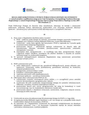 REGULAMIN KORZYSTANIA Z PUNKTU PUBLICZNEGO DOSTĘPU DO INTERNETU w ramach projektu współfinansowanego przez Unie Europejską z Europejskiego Funduszu Rozwoju Regionalnego w ramach Regionalnego Programu Operacyjnego Województwa Śląskiego na lata 20072013 Działanie 2.1 Punkt Publicznego Dostępu do Internetu służy mieszkańcom, ułatwiając im kontakt z instytucjami publicznymi, podnosząc kulturę informatyczną użytkowników oraz stwarzając możliwość aktywacji społeczno – zawodowej przy wykorzystaniu technik informatycznych w szczególności Internetu. §1 1. Przez użyte w Regulaminie określenia należy rozumieć: 1. PIAP – publiczny punkt dostępu do internetu, powszechnie dostępne stanowisko komputerowe znajdujące się w lokalach Gminnej Biblioteki Publicznej, zwanej dalej Biblioteką; 2. Użytkownik – osoba, która zgłosiła chęć korzystania z PIAP-u, zapoznała się i wyraziła zgodę na postanowienia niniejszego Regulaminu; 3. przetwarzanie danych – jakiekolwiek operacje wykonywane na danych, takie jak transmitowanie, zbieranie, utrwalanie, przechowywanie, opracowywanie, zmienianie, udostępnianie i usuwanie; 4. niepożądane dane, oprogramowanie – to wszelkiego typu dane, oprogramowanie, skrypty i ingerencje mające szkodliwe, przestępcze lub złośliwe działanie w stosunku do systemu informatycznego czy użytkownika komputera. 2. W sprawach nieuregulowanych niniejszym Regulaminem mają zastosowanie powszechnie obowiązujące przepisy prawa. §2 1. PIAP-y przeznaczone są do: 1. celów edukacyjnych i naukowych (np. poszukiwań bibliograficznych, pisania referatów, prac naukowych, rozszerzania wiedzy przedmiotowej, gromadzenia informacji do konkursów, olimpiad przedmiotowych); 2. propagowania, promocji kultury i sztuki; 3. kontaktów z instytucjami publicznymi; 4. wspierania aktywności osób niepełnosprawnych; 5. aktywizacji społeczno – zawodowej Użytkownika. 2. Obowiązuje zakaz wykorzystywania PIAP-ów do: 1. wykonywania czynności naruszających prawo polskie, a w szczególności prawa autorskie twórców lub dystrybutorów oprogramowania i danych; 2. uzyskiwania lub prób uzyskiwania nieuprawnionego dostępu do systemów informatycznych, odbierania, wysyłania, rozsyłania niepożądanych danych; 3. przetwarzania danych przy użyciu oprogramowania lub usług do komunikacji w czasie rzeczywistym (np. czat, irc, komunikatory internetowe, bramki sms); 4. przetwarzania danych o charakterze erotycznym, rasistowskim, wulgarnym, rażącym uczucia, naruszającym dobre obyczaje. §3 1. Użytkownik ma prawo do jednorazowego 60-minutowego dostępu do PIAP-u w ciągu doby. 2. Za zgodą pracownika Biblioteki reguły określonej w ust.1 nie stosuje się w przypadku braku innych Użytkowników chętnych do korzystania z PIAP-ów. 3. Po zapoznaniu się z Regulaminem, Użytkownik ma obowiązek wylegitymowania się aktualnym dokumentem tożsamości. Czas i cel korzystania Użytkownik wpisuje do zeszytu odwiedzin i poświadcza własnoręcznym, czytelnym podpisem. 4. Przy PIAP-ie może znajdować się jeden Użytkownik. W wyjątkowych przypadkach oraz za zgodą pracownika Biblioteki przy stanowisku może przebywać Użytkownik wraz z osobą towarzyszącą. 5. Użytkownik przyjmuje do wiadomości i akceptuje monitorowanie jego pracy. 6. Użytkownik musi posiadać elementarną znajomość obsługi komputera i oprogramowania. 7. Użytkownik zobowiązany jest do: 1. korzystania ze sprzętu i oprogramowania stanowiącego wyposażenie stanowiska zgodnie z jego przeznaczeniem i udzielanymi przez pracownika Biblioteki wskazaniami; 2. ochraniania PIAP-u przed uszkodzeniem lub zniszczeniem; 3. zgłaszania pracownikowi Biblioteki wszelkich uszkodzeń lub nieprawidłowości w pracy PIAPu; 4. rozpoczęcia pracy zalogowaniem się, a zakończenia pracy wylogowaniem się z systemu informatycznego; 5. korzystania wyłącznie z zainstalowanego oprogramowania; 6. sprawdzenia własnego nośnika danych oprogramowaniem antywirusowym. 8. Użytkownikowi zabrania się: 1. wykonywania czynności mogących zakłócić funkcjonowanie PIAP-u; 2. włączania, wyłączania, podłączania, montażu, demontażu sprzętu; 3. podłączania, rozłączania okablowania; 4. dokonywania samodzielnych napraw; 5. instalowania, reinstalowania, deinstalowania oprogramowania oraz dokonywania zmian w konfiguracji istniejącego oprogramowania (w tym systemowego); 6. korzystania z nośnika na którym oprogramowanie antywirusowe wykryło niepożądane dane; 7. pobierania plików (w tym programów komputerowych) bez zgody pracownika Biblioteki. §4 1. Biblioteka udostępnia PIAP-y w swoich filiach w godzinach ich otwarcia. 2. Pracownik Biblioteki jest zobowiązany poinformować każdego Użytkownika o zasadach logowania i wylogowania. 3. Pracownik Biblioteki, jeśli aktualnie dysponuje czasem, udziela pomocy w zakresie obsługi PIAP-u. 4. Pracownik Biblioteki jest uprawniony do zbierania, w celach statystycznych, danych dotyczących Użytkownika: wieku, wykształcenia, rodzaju usług i informacji stanowiących przedmiot jego zainteresowania. 5. W szczególnych przypadkach pracownik Biblioteki może, z powodów naruszenia przepisów Regulaminu, przerwać pracę Użytkownika i uniemożliwić mu dostęp do PIAP-u. 6. Biblioteka nie ponosi odpowiedzialności za przetworzenie danych Użytkownika lub zniszczenie nośnika danych spowodowanych działaniem oprogramowania, niepożądanego oprogramowania, sprzętu, działalnością innych Użytkowników, uzyskaniem nieuprawnionego dostępu z sieci Internet. §5 1. Użytkownik ponosi odpowiedzialność za działania, których skutkiem jest naruszenie obowiązujących przepisów prawa oraz Regulaminu. 2. Użytkownik ponosi pełną odpowiedzialność za działania osoby mu towarzyszącej. 3. Za wszelkie uszkodzenia sprzętu komputerowego i oprogramowania odpowiada finansowo Użytkownik. Jeśli jest on niepełnoletni, wówczas odpowiedzialność ponoszą opiekunowie prawn