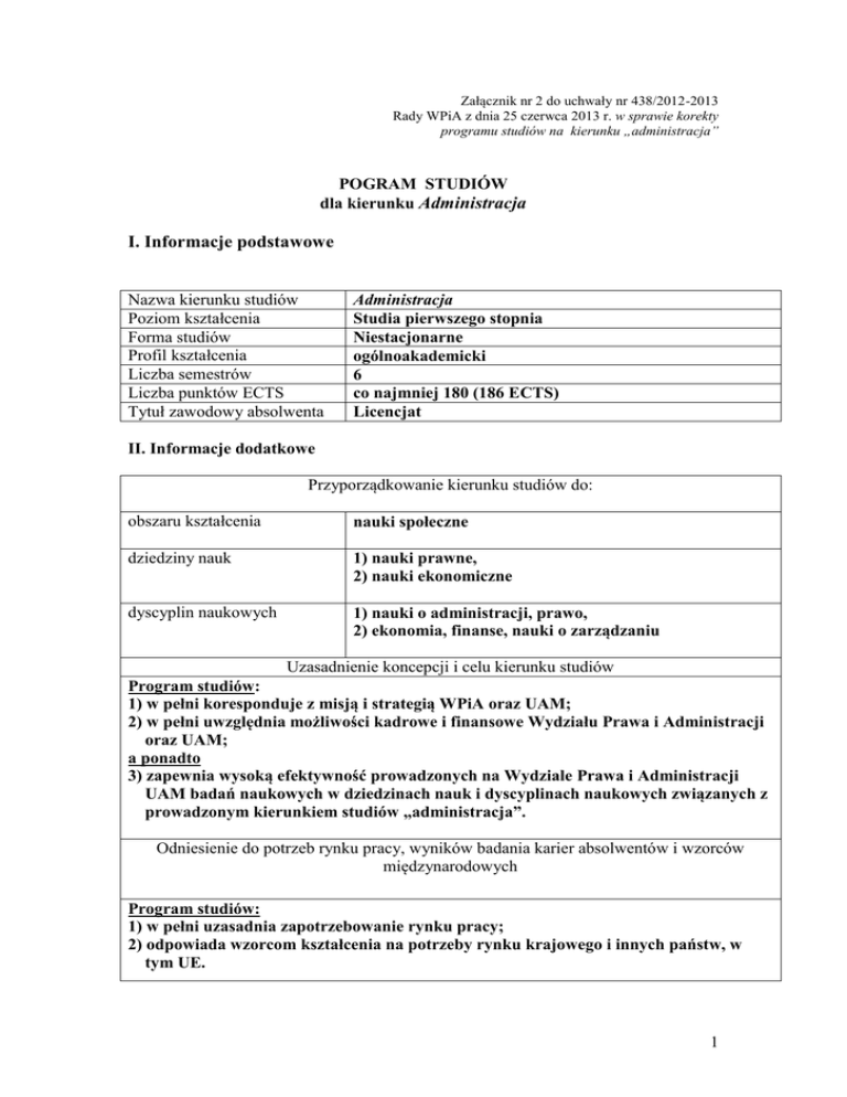 Załącznik nr 2 do uchwały nr 438/2012-2013 Rady WPiA z dnia 25 czerwca 2013 r. w sprawie korekty programu studiów na kierunku „administracja” POGRAM STUDIÓW dla kierunku Administracja I. Informacje podstawowe Nazwa kierunku studiów Poziom kształcenia Forma studiów Profil kształcenia Liczba semestrów Liczba punktów ECTS Tytuł zawodowy absolwenta Administracja Studia pierwszego stopnia Niestacjonarne ogólnoakademicki 6 co najmniej 180 (186 ECTS) Licencjat II. Informacje dodatkowe Przyporządkowanie kierunku studiów do: obszaru kształcenia nauki społeczne dziedziny nauk 1) nauki prawne, 2) nauki ekonomiczne dyscyplin naukowych 1) nauki o administracji, prawo, 2) ekonomia, finanse, nauki o zarządzaniu Uzasadnienie koncepcji i celu kierunku studiów Program studiów: 1) w pełni koresponduje z misją i strategią WPiA oraz UAM; 2) w pełni uwzględnia możliwości kadrowe i finansowe Wydziału Prawa i Administracji oraz UAM; a ponadto 3) zapewnia wysoką efektywność prowadzonych na Wydziale Prawa i Administracji UAM badań naukowych w dziedzinach nauk i dyscyplinach naukowych związanych z prowadzonym kierunkiem studiów „administracja”. Odniesienie do potrzeb rynku pracy, wyników badania karier absolwentów i wzorców międzynarodowych Program studiów: 1) w pełni uzasadnia zapotrzebowanie rynku pracy; 2) odpowiada wzorcom kształcenia na potrzeby rynku krajowego i innych państw, w tym UE. 1 Możliwości zatrudnienia i kontynuacji kształcenia przez absolwentów Absolwenci są przygotowani do: 1) podjęcia zatrudnienia, w tym zajmowania stanowisk kierowniczych średniego szczebla w następujących jednostkach, sferach aktywności: - administracja publiczna (służba cywilna, jednostki samorządu terytorialnego, agencje rządowe, służby resortowe - policji, straży, inspekcji drogowej) - administracja skarbowa (Urzędy Skarbowe, Izby Skarbowe) - administracja celna (Urzędy Celne, Izby Celne) - administracja gospodarcza (podmioty gospodarcze w sektorze publicznym i prywatnym) - administracja społeczna (podmioty działalności leczniczej, oświatowej, kultury, zabytków, instytucji pozarządowych) - administracja wymiaru sprawiedliwości - jednostki kontroli administracji (NIK oraz RIO) - instytucje unijne, a także - działy personalne oraz działy księgowości firm - działy zamówień publicznych - firmy outsourcingowe, w szczególności usługowe (np. księgowość, rozliczenia, logistyka) - administracja w kancelariach zawodów zaufania publicznego etc. 2) dalszego kształcenia na: studiach drugiego stopnia kierunku „administracja” lub kierunków pokrewnych, studiach podyplomowych - zgodnie z przyjętymi zasadami rekrutacji w danej Uczelni. Moduły kształcenia 1. moduł zajęć z zakresu nauk podstawowych, 2. moduł zajęć obowiązkowych (innych niż podstawowe) i do wyboru (profil kształcenia utworzony przez studenta), 3. moduł zajęć o charakterze praktycznym, 4. moduł zajęć oferowanych na zajęciach ogólnouczelnianych lub na innym kierunku studiów WPiA Moduły zajęć z zakresu nauk Obejmują: 2 podstawowych dla kierunku studiów Moduł zajęć wymagających bezpośredniego udziału nauczycieli akademickich i studentów Prawoznawstwo (wykład, ćwiczenia); Mikro i makro-ekonomia (wykład); Prawo konstytucyjne (wykład, ćwiczenia); Metody zarządzania (wykład); Prawo administracyjne cz. I. (wykład, ćwiczenia); Prawo administracyjne cz. II. (wykład, ćwiczenia); Prawo cywilne (wykład, ćwiczenia); Prawo pracy i stosunki pracownicze (wykład, ćwiczenia); Finanse publiczne i prawo finansowe (wykłady, ćwiczenia); Postępowanie administracyjne (wykłady, ćwiczenia); Publiczne prawo gospodarcze (wykłady, ćwiczenia). I. Wykłady: 1) z zakresu nauk podstawowych (podane powyżej), 2) inne obowiązkowe wykłady z przedmiotów: : Doktryny polityczno-prawne, Organizacja i kierownictwo, Psychologia ogólna z elementami psychologii społecznej, Logika praktyczna, Współczesna historia administracji, Nauka administracji, Socjologia organizacji, Podstawy marketingu, Statystyka z demografią, Międzynarodowa ochrona praw człowieka, Prawo karne, Prawo międzynarodowe publiczne, Prawo rodzinne i spadkowe, Podstawy prawa własności intelektualnej, Administracja rolnictwa, Etyka, Prawo instytucjonalne UE, Podatki i prawo podatkowe, Podstawy prawa handlowego, Fundusze strukturalne UE, Postępowanie egzekucyjne w administracji, Ochrona środowiska, Zamówienia publiczne. 3) 14 wykładów do wyboru spośród: Filozofia, teoria i praktyka demokracji, Techniki organizatorskie i decyzyjne, Korpus urzędniczy w Polsce XVIII w., Wstęp do wykładni prawa administracyjnego, Techniki negocjacji i mediacji w administracji, 3 Podstawy rachunkowości, Polityka społeczna, Prawo migracyjne, Umowy w administracji, Prawo urzędnicze, Prawo wykroczeń, Prawo karno-skarbowe, Dyplomacja i prawo dyplomatyczne, Instytucje współpracy europejskiej, Europejskie prawo osobowe, Finanse UE, Prawo żywnościowe, Nietypowe formy zatrudnienia, Prawo ubezpieczeń społecznych, Prawo zagospodarowania przestrzeni, Zarządzanie nieruchomościami, Ochrona zabytków, Standardy etyczne w służbie publicznej, Europejskie prawo podatkowe, Finanse samorządu terytorialnego, Swoboda świadczenia usług w Polsce, Pojęcie i rejestracja stanu cywilnego osoby fizycznej, Prawo spółdzielcze, Prawo medyczne, wykładów (do 6) z innego kierunku WPiA lub proponowanych przez UAM. II. Ćwiczenia:: 1) z zakresu nauk podstawowych dla kierunku studiów (wskazane powyżej), oraz 2) inne ćwiczenia obowiązkowe z przedmiotów: Logika praktyczna, Prawo międzynarodowe publiczne, Prawo rodzinne i spadkowe, Prawo własności intelektualnej, Administracja rolnictwa, Podatki i prawo podatkowe, Fundusze strukturalne UE, Postępowanie egzekucyjne w administracji, Ochrona środowiska, Zamówienia publiczne, Technologia informacji III. Lektorat Język obcy do wyboru spośród” angielski, niemiecki, fra