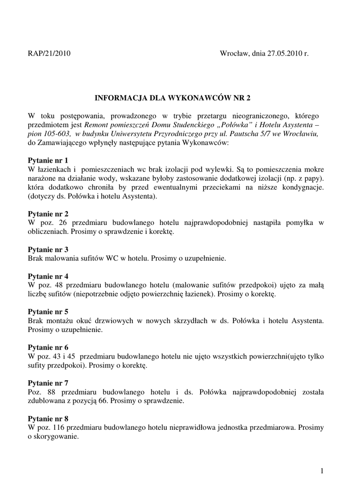 RAP/21/2010 Wrocław, dnia 27.05.2010 r. INFORMACJA DLA WYKONAWCÓW NR 2 W toku postępowania, prowadzonego w trybie przetargu nieograniczonego, którego przedmiotem jest Remont pomieszczeń Domu Studenckiego „Połówka” i Hotelu Asystenta – pion 105-603, w budynku Uniwersytetu Przyrodniczego przy ul. Pautscha 5/7 we Wrocławiu, do Zamawiającego wpłynęły następujące pytania Wykonawców: Pytanie nr 1 W łazienkach i pomieszczeniach wc brak izolacji pod wylewki. Są to pomieszczenia mokre narażone na działanie wody, wskazane byłoby zastosowanie dodatkowej izolacji (np. z papy). która dodatkowo chroniła by przed ewentualnymi przeciekami na niższe kondygnacje. (dotyczy ds. Połówka i hotelu Asystenta). Pytanie nr 2 W poz. 26 przedmiaru budowlanego hotelu najprawdopodobniej nastąpiła pomyłka w obliczeniach. Prosimy o sprawdzenie i korektę. Pytanie nr 3 Brak malowania sufitów WC w hotelu. Prosimy o uzupełnienie. Pytanie nr 4 W poz. 48 przedmiaru budowlanego hotelu (malowanie sufitów przedpokoi) ujęto za małą liczbę sufitów (niepotrzebnie odjęto powierzchnię łazienek). Prosimy o korektę. Pytanie nr 5 Brak montażu okuć drzwiowych w nowych skrzydłach w ds. Połówka i hotelu Asystenta. Prosimy o uzupełnienie. Pytanie nr 6 W poz. 43 i 45 przedmiaru budowlanego hotelu nie ujęto wszystkich powierzchni(ujęto tylko sufity przedpokoi). Prosimy o korektę. Pytanie nr 7 Poz. 88 przedmiaru budowlanego hotelu i ds. Połówka najprawdopodobniej została zdublowana z pozycją 66. Prosimy o sprawdzenie. Pytanie nr 8 W poz. 116 przedmiaru budowlanego hotelu nieprawidłowa jednostka przedmiarowa. Prosimy o skorygowanie. 1 Pytanie nr 9 W przedmiarach instalacyjnych hotelu Asystenta i ds. Połówka brak utylizacji odpadów z demontażu urządzeń sanitarnych. Prosimy o uzupełnienie. Pytanie nr 10 W przedmiarach elektrycznych hotelu Asystenta i ds. Połówka brak utylizacji odpadów z demontażu urządzeń elektrycznych. Prosimy o uzupełnienie. Pytanie nr 11 W przedmiarach elektrycznych hotelu Asystenta i ds. Połówka brak utylizacji gruzu z kucia bruzd i otworów. Prosimy o uzupełnienie Pytanie nr 12 W przedmiarach elektrycznych hotelu Asystenta i ds. Połówka brak przygotowania podłoża pod puszki p.t. jak i również montażu samych puszek. Prosimy o uzupełnienie. Pytanie nr 13 W poz. 26 przedmiaru budowlanego ds. Połówka najprawdopodobniej nastąpiła pomyłka w obliczeniach (analogia do hotelu Asystenta). Prosimy o sprawdzenie i korektę. Pytanie nr 14 W poz. 43 i 45 przedmiaru budowlanego ds. Połówka nie ujęto wszystkich powierzchni(analogia do hotelu Asystenta). Prosimy o korektę. Pytanie nr 15 W poz. 48 przedmiaru budowlanego ds. Połówka (malowanie sufitów przedpokoi) nastąpiła pomyłka w obliczeniach (analogia do hotelu Asystenta), nie ujęto również malowania sufitów WC. Prosimy o sprawdzenie i korektę. Pytanie nr 16 W ds. połówka brak szpachlowania starych tynków w WC przerobionych na pralnie. Tynki sufitów są w złym stanie i samo przetarcie może dać mizerny efekt. Prosimy o uzupełnienie. Pytanie nr 17 W poz. 183 przedmiaru budowlanego ds. Połówka Prosimy o skorygowanie wartości. nastąpiła pomyłka w obliczeniach . Pytanie nr 18 W poz. 192,193,202 i 203 przedmiaru budowlanego ds. Połówka uwzględniono prace malarskie tylko jednego pomieszczenia, z pozostałych robót wynika że tych pomieszczeń jest osiem Prosimy o sprawdzenie i ewentualną korektę. Pytanie nr19 W pracach przy remoncie holi i korytarza ds. Połówka występuję tynkowanie i obłożenie płytkami ścian w WC przy portierni na parterze, natomiast jest brak w kosztorysie pozostałych prac w tym pomieszczeniu, (zbicie tynków, roboty posadzkarskie, izolacyjne itd.). Proszę potwierdzenie, zakresu remontu tego pom. i ewentualne uzupełnienie. 2 Pytanie nr 20 W ds. połówka brak szpachlowania starych tynków sufitów holi i klatki schodowej . Samo przetarcie i przemalowanie tynków nie da zamierzonego efektu. Prosimy o uzupełnienie. Pytanie nr 21 W ds. połówka nie ujęto malowania wszystkich (najprawdopodobniej sufitów). Prosimy o uzupełnienie. powierzchni holi i korytarzy Pytanie nr 22 Brak pomalowania i szpachlowania wsypów od środka (roboty malarskie po wymianie drzwi). Prosimy o uzupełnienie. Pytanie nr 23 Brak ilości przedmiarowej w poz. 279 przedmiaru robót budowlanych ds. Połówka. Pytanie nr 24 W piwnicach ds. Połówka ujęto zrobienie posadzek z zaprawy cementowej gr. 20mm. Jest to wylewka zbyt cienka, która może ulec w krótkim czasie zniszczeniu i spękaniu. Proszę o ewentualną zamianę na wylewkę samopoziomującą. Pytanie nr 25 W powierzchniach wykładzin, we wszystkich remontowanych pomieszczeniach hotelu i ds. Połówka nie ujęto powierzchni wywinięć wykładziny na ściany. Prosimy o korektę. Pytanie nr 26 W związku z notatką, że roboty będą wykonywane na czynnym obiekcie, oraz ze względu na krotki termin wykonania prosimy o informację czy mniej uciążliwe prace będą mogły być wykonywane w godzinach nocnych, czy na czas remonty zostanie zamknięta remontowana klatka schodowa(na której zostanie rozstawione rusztowanie i zlikwidowana balustrada), oraz czy wykonawcy zostanie udostępniony cały zakres robót. Pytanie nr 27 Prosimy o podanie parametrów technicznych , rodzaju ościeżnic stalowych przewidzianych do wbudowania – czy mają to być ościeżnice stalowe malowane na budowie czy fabrycznie wykończone, malowane proszkowo ze stali ocynkowanej. Pytanie nr 28 Prosimy o podanie parametrów technicznych , rodzaju skrzydeł drzwiowych – konstrukcja skrzydeł, wypełnienie, rodzaj i grubość okleiny. Pytanie nr 29 Prosimy o określenie funkcji i podziałów stolarki okiennej PCV wbudowania. przewidzianej do Pytanie nr 30 W pozycji 177 wartość przedmiaru wynosi 0. Prosimy o uzupełnienie Przedmiaru . 3 Pytanie nr 31 W pozycji 279 przedmiaru jest brak jednostki miary i ilości przedmiaru. Prosimy o uzupełnie