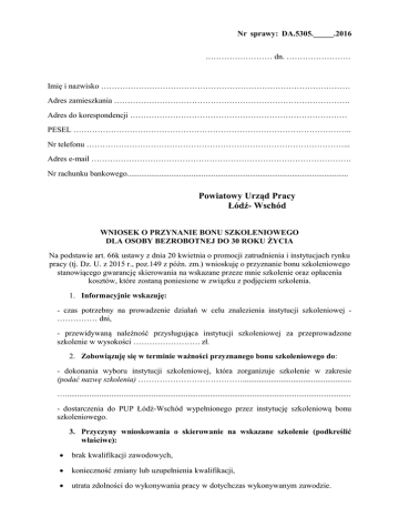 Nr sprawy: DA.5305._____.2016 .…………………… dn. …………………… Imię i nazwisko ………………………………………………………………………………… Adres zamieszkania ……………………………………………………………………………. Adres do korespondencji ……………………………………………………………………… PESEL ………………………………………………………………………………………….. Nr telefonu ……………………………………………………………………………………... Adres e-mail ……………………………………………………………………………………. Nr rachunku bankowego.............................................................................................................. Powiatowy Urząd Pracy Łódź- Wschód WNIOSEK O PRZYNANIE BONU SZKOLENIOWEGO DLA OSOBY BEZROBOTNEJ DO 30 ROKU ŻYCIA Na podstawie art. 66k ustawy z dnia 20 kwietnia o promocji zatrudnienia i instytucjach rynku pracy (tj. Dz. U. z 2015 r., poz.149 z późn. zm.) wnioskuję o przyznanie bonu szkoleniowego stanowiącego gwarancję skierowania na wskazane przeze mnie szkolenie oraz opłacenia kosztów, które zostaną poniesione w związku z podjęciem szkolenia. 1. Informacyjnie wskazuję: - czas potrzebny na prowadzenie działań w celu znalezienia instytucji szkoleniowej …………… dni, - przewidywaną należność przysługująca instytucji szkoleniowej za przeprowadzone szkolenie w wysokości ……………………. zł. 2. Zobowiązuję się w terminie ważności przyznanego bonu szkoleniowego do: - dokonania wyboru instytucji szkoleniowej, która zorganizuje szkolenie w zakresie (podać nazwę szkolenia) …………………………………...................................................... ….............................................................................................................................................. - dostarczenia do PUP Łódź-Wschód wypełnionego przez instytucję szkoleniową bonu szkoleniowego. 3. Przyczyny wnioskowania o skierowanie na wskazane szkolenie (podkreślić właściwe): brak kwalifikacji zawodowych, konieczność zmiany lub uzupełnienia kwalifikacji, utrata zdolności do wykonywania pracy w dotychczas wykonywanym zawodzie. 4. Uzasadnienie celowości ubiegania się o skierowanie na szkolenie: (wskazując także umiejętności i kwalifikacje jakie Pan/Pani uzyska w wyniku szkolenia oraz zapotrzebowanie ich na rynku pracy) .................................................................................................................................................. .................................................................................................................................................. .................................................................................................................................................. .................................................................................................................................................. .................................................................................................................................................. .................................................................................................................................................. .................................................................................................................................................. ................................................................................................................................................. 5. Oświadczam, że w okresie ostatnich 3 lat (zaznaczyć odpowiednio): nie uczestniczyłem/łam w szkoleniu (lub szkoleniach) na podstawie skierowania powiatowego urzędu pracy, uczestniczyłem/łam w szkoleniu (lub szkoleniach) na podstawie skierowania powiatowego urzędu pracy, W przypadku uczestniczenia należy podać: nazwę szkolenia .............................................................................................................. …………………………………………………………………………………………... datę rozpoczęcia i zakończenia szkolenia ........................................................................ …………………………………………………………………………………………... nazwę Urzędu Pracy i siedzibę Urzędu kierującego na szkolenie ………………………………………..…………………………………………………. …………………………………….................................................................................. koszt szkolenia (lub szkoleń łącznie) na podstawie skierowania z powiatowego urzędu pracy (w przypadku uzyskania skierowania na szkolenie z innego Urzędu niż PUP Łódź – Wschód na podstawie uzyskanego od niego zaświadczenia) …………………………………....................................................................................... ........................................................................................................................................... .......................................................................................................................................... 6. Inne informacje o wskazanym szkoleniu, które osoba wnioskująca uzna za istotne: ………………………………………………………………………………………………… ………………………………………………………………………………………………… ………………………………………………………………………………………………… …………………………………………………………………………