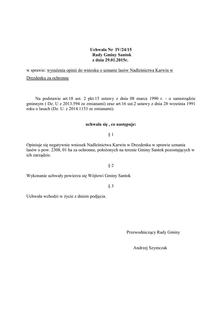 Uchwała Nr IV/24/15 Rady Gminy Santok z dnia 29.01.2015r. w sprawie: wyrażenia opinii do wniosku o uznanie lasów Nadleśnictwa Karwin w Drezdenku za ochronne Na podstawie art.18 ust. 2 pkt.15 ustawy z dnia 08 marca 1990 r. - o samorządzie gminnym ( Dz. U z 2013.594 ze zmianami) oraz art.16 ust.2 ustawy z dnia 28 września 1991 roku o lasach (Dz. U. z 2014.1153 ze zmianami). uchwala się , co następuje: §1 Opiniuje się negatywnie wniosek Nadleśnictwa Karwin w Drezdenku w sprawie uznania lasów o pow. 2308, 01 ha za ochronne, położonych na terenie Gminy Santok pozostających w ich zarządzie. §2 Wykonanie uchwały powierza się Wójtowi Gminy Santok §3 Uchwała wchodzi w życie z dniem podjęcia. Przewodniczący Rady Gminy Andrzej Szymczak Uzasadnienie: Nadleśnictwo Karwin pismem z dnia 08.01.2015r.; znak: ZG.6002.2.2015 zwróciło się do Rady Gminy Santok o pozytywną opinię w sprawie uznania lasów za ochronne, położonych na terenie Gminy Santok. Na podstawie art. 16 ust.2 ustawy z dnia 28 września 1991 roku o lasach Rada Gminy powinna wyrazić opinię w ciągu 2 miesięcy od dnia otrzymania wystąpienia o jej wyrażenie. Wymienione obszary, na których proponuje się uznanie lasów za ochronne ze względu za zachowanie biologicznej różnorodności, zlokalizowane na obszarach NATURA 2000, są już objęte formą ochrony wynikającą z innej podstawy prawnej, nie mniej jednak mającej na celu zapewnienie między innymi zachowanie biologicznej różnorodności chronionych obszarów. Uznanie praktycznie całej powierzchni lasów będących w zarządzie Nadleśnictwa Karwin za lasy ochronne niesie za sobą skutki finansowe dla budżetu gminy Santok w postaci zmniejszenia o 50 % stawki podatku leśnego. Uznanie 2.308,01 ha powierzchni za lasy ochronne spowoduje zmniejszenie kwoty 86.850,04163 na kwotę 43.425,2081 zł. Wobec czego Gmina zmniejsza swoje dochody, nie uzyskując żadnej rekompensaty. Należy liczyć się również z faktem, że w perspektywie lat mogą pojawić się inne negatywne skutki dla mieszkańców po uznaniu lasów za ochronne tj. brak możliwości budowy i rozbudowy infrastruktury, ograniczenia w pozyskiwania drewna lub runa leśnego. W związku z tym podjęcie uchwały wyrażającej negatywną opinię jest zasadne.