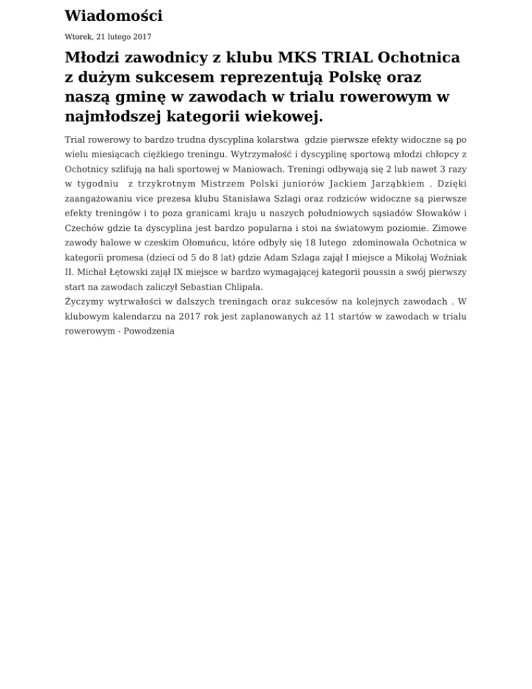Wiadomości Wtorek, 21 lutego 2017 Młodzi zawodnicy z klubu MKS TRIAL Ochotnica z dużym sukcesem reprezentują Polskę oraz naszą gminę w zawodach w trialu rowerowym w najmłodszej kategorii wiekowej. Trial rowerowy to bardzo trudna dyscyplina kolarstwa gdzie pierwsze efekty widoczne są po wielu miesiącach ciężkiego treningu. Wytrzymałość i dyscyplinę sportową młodzi chłopcy z Ochotnicy szlifują na hali sportowej w Maniowach. Treningi odbywają się 2 lub nawet 3 razy w tygodniu z trzykrotnym Mistrzem Polski juniorów Jackiem Jarząbkiem . Dzięki zaangażowaniu vice prezesa klubu Stanisława Szlagi oraz rodziców widoczne są pierwsze efekty treningów i to poza granicami kraju u naszych południowych sąsiadów Słowaków i Czechów gdzie ta dyscyplina jest bardzo popularna i stoi na światowym poziomie. Zimowe zawody halowe w czeskim Ołomuńcu, które odbyły się 18 lutego zdominowała Ochotnica w kategorii promesa (dzieci od 5 do 8 lat) gdzie Adam Szlaga zajął I miejsce a Mikołaj Woźniak II. Michał Łętowski zajął IX miejsce w bardzo wymagającej kategorii poussin a swój pierwszy start na zawodach zaliczył Sebastian Chlipała. Życzymy wytrwałości w dalszych treningach oraz sukcesów na kolejnych zawodach . W klubowym kalendarzu na 2017 rok jest zaplanowanych aż 11 startów w zawodach w trialu rowerowym - Powodzenia