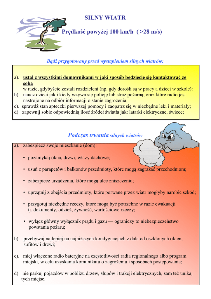 SILNY WIATR Prędkość powyŜej 100 km/h ( >28 m/s) Bądź przygotowany przed wystąpieniem silnych wiatrów: a). ustal z wszystkimi domownikami w jaki sposób będziecie się kontaktować ze sobą w razie, gdybyście zostali rozdzieleni (np. gdy dorośli są w pracy a dzieci w szkole): b). naucz dzieci jak i kiedy wzywa się policję lub straŜ poŜarną, oraz które radio jest nastrojone na odbiór informacji o stanie zagroŜenia; c). sprawdź stan apteczki pierwszej pomocy i zaopatrz się w niezbędne leki i materiały; d). zapewnij sobie odpowiednią ilość źródeł światła jak: latarki elektryczne, świece; Podczas trwania silnych wiatrów a). zabezpiecz swoje mieszkanie (dom): • pozamykaj okna, drzwi, włazy dachowe; • usuń z parapetów i balkonów przedmioty, które mogą zagraŜać przechodniom; • zabezpiecz urządzenia, które mogą ulec zniszczeniu; • uprzątnij z obejścia przedmioty, które porwane przez wiatr mogłyby narobić szkód; • przygotuj niezbędne rzeczy, które mogą być potrzebne w razie ewakuacji tj. dokumenty, odzieŜ, Ŝywność, wartościowe rzeczy; • wyłącz główny wyłącznik prądu i gazu — ograniczy to niebezpieczeństwo powstania poŜaru; b). przebywaj najlepiej na najniŜszych kondygnacjach z dala od oszklonych okien, sufitów i drzwi; c). miej włączone radio bateryjne na częstotliwości radia regionalnego albo program miejski, w celu uzyskania komunikatu o zagroŜeniu i sposobach postępowania; d). nie parkuj pojazdów w pobliŜu drzew, słupów i trakcji elektrycznych, sam teŜ unikaj tych miejsc. JeŜeli słuŜby ratownicze zalecają ewakuację: - wyrusz tak szybko jak to tylko moŜliwe; - opuszczając mieszkanie wyłącz energię e1ektryczną oraz główny zawór wody i gazu. Wygaś ogień w piecach i zabezpiecz dom; - zawiadom kogoś, poza zasięgiem wichury o tym, dokąd się ewakuujesz. Po ustąpieniu wiatrów: a). udziel pierwszej pomocy rannym i poszkodowanym osobom; b). unikaj 1eŜących lub zwisających przewodów elektrycznych; c). ostroŜnie wkraczaj do swego domu; d). sprawdź instalację gazową, e1ektryczną, wodociągową i ściekową w zniszczonym domu. 0 wszystkich zdarzeniach, mających istotne znaczenie dla bezpieczeństwa ludzi informuj: - słuŜby dyŜurne StraŜy PoŜarnej i Policji; - pogotowie energetyczne, gazowe, inne.