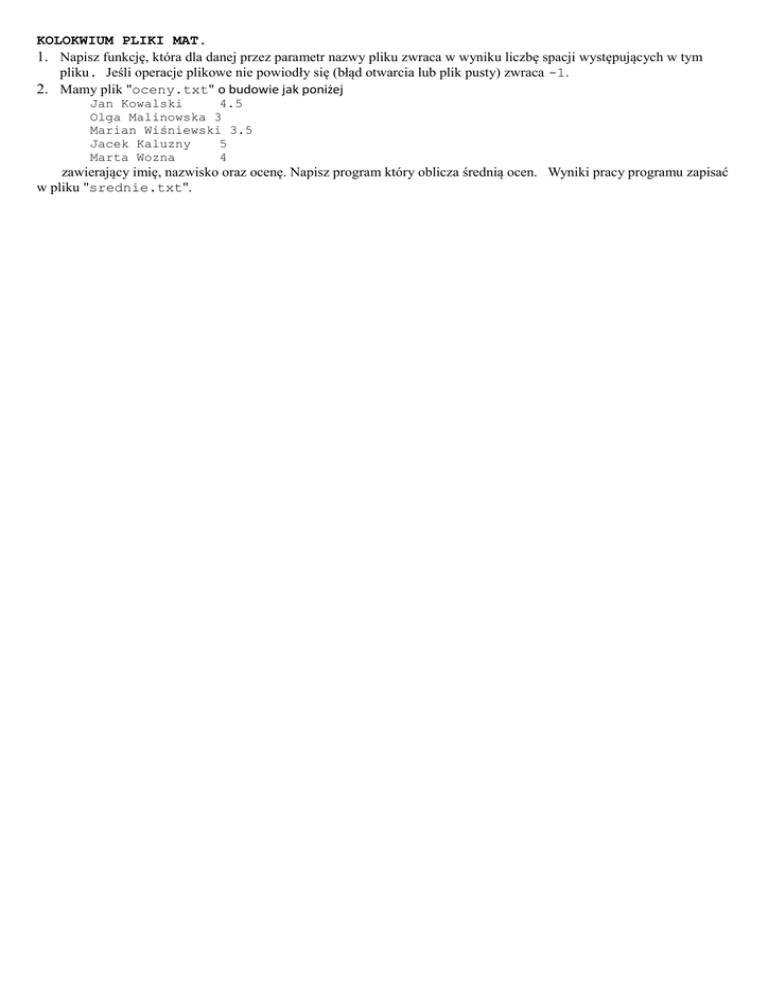 KOLOKWIUM PLIKI MAT. 1. Napisz funkcję, która dla danej przez parametr nazwy pliku zwraca w wyniku liczbę spacji występujących w tym pliku. Jeśli operacje plikowe nie powiodły się (błąd otwarcia lub plik pusty) zwraca -1. 2. Mamy plik "oceny.txt" o budowie jak poniżej Jan Kowalski 4.5 Olga Malinowska 3 Marian Wiśniewski 3.5 Jacek Kaluzny 5 Marta Wozna 4 zawierający imię, nazwisko oraz ocenę. Napisz program który oblicza średnią ocen. Wyniki pracy programu zapisać w pliku "srednie.txt". KOLOKWIUM PLIKI gr 3 - E. 3. Napisz funkcję, która dla danej przez parametr nazwy pliku zwraca w wyniku liczbę spacji występujących w tym pliku, a liczbę dużych liter zwraca przez dodatkowy parametr. Jeśli operacje plikowe nie powiodły się (błąd otwarcia lub plik pusty) zwraca -1. 4. Mamy plik "oceny.txt" o budowie jak poniżej A A B A B Jan Kowalski 4.5 Olga Malinowska 3 Marian Wiśniewski 3.5 Jacek Kaluzny 5 Marta Wozna 4 zawierający numer grupy, imię, nazwisko oraz ocenę. Napisz program który oblicza średnią ocen w grupie A i średnią ocen w grupie B. Wyniki pracy programu zapisać w pliku "srednie.txt". KOLOKWIUM PLIKI gr 3 - F. 1. Napisz funkcję, która dla danej przez parametr nazwy pliku oblicza prawdopodobieństwo zdarzenia, że znak pliku jest znakiem nowej linii, natomiast prawdopodobieństwo wystąpienia cyfry zwraca przez dodatkowy parametr. Jeśli operacje plikowe nie powiodły się zwraca -1. Dla pliku pustego zwraca 0. 2. Mamy plik "zarobki.txt" o budowie jak poniżej Jan Kowalski 1234.50 Olga Malinowska 3324.60 Marian Wiśniewski 1235.00 Jacek Kaluzny 5000.00 Marta Wozna 1423.75 zawierający imię, nazwisko oraz wysokość zarobków, napisz program, który dla tego pliku policzy ile osób w zakładzie zarabia powyżej 2000zł, a ile 2000 lub mniej. Wyniki pracy programu zapisać w pliku "raport.txt". KOLOKWIUM PLIKI gr 8 - A . 5. Napisz funkcję, która dla danej przez parametr nazwy pliku zwraca w wyniku liczbę małych liter występujących w tym pliku, a liczbę spacji zwraca przez dodatkowy parametr. Jeśli operacje plikowe nie powiodły się (błąd otwarcia lub plik pusty) zwraca -1. 6. Mamy plik "oceny.txt" o budowie jak poniżej A A B A B Jan Kowalski 4.5 Olga Malinowska 3 Marian Wiśniewski 3.5 Jacek Kaluzny 5 Marta Wozna 4 zawierający numer grupy, imię, nazwisko oraz ocenę. Napisz program który oblicza średnią ocen w grupie A i średnią ocen w grupie B. Wyniki pracy programu zapisać w pliku "srednie.txt". KOLOKWIUM PLIKI gr 8 - B . 3. Napisz funkcję, która dla danej przez parametr nazwy pliku oblicza prawdopodobieństwo zdarzenia, że znak pliku jest cyfrą, natomiast prawdopodobieństwo wystąpienia znaku tabulacji zwraca przez dodatkowy parametr. Jeśli operacje plikowe nie powiodły się zwraca -1. Dla pliku pustego zwraca 0. 4. Mamy plik "zarobki.txt" o budowie jak poniżej Jan Kowalski 1234.50 Olga Malinowska 3324.60 Marian Wiśniewski 1235.00 Jacek Kaluzny 5000.00 Marta Wozna 1423.75 zawierający imię, nazwisko oraz wysokość zarobków, napisz program, który dla tego pliku policzy ile osób w zakładzie zarabia powyżej 2000zł, a ile 2000 lub mniej. Wyniki pracy programu zapisać w pliku "raport.txt". KOLOKWIUM PLIKI – grupa 2- C . 1. Napisz funkcję, która dla danej przez parametr nazwy pliku zwraca w wyniku prawdopodobieństwo z jakim występują znaki spacji w tym pliku, natomiast prawdopodobieństwo wystąpienia znaku cyfry zwraca przez dodatkowy parametr. Jeśli operacje plikowe nie powiodły się zwraca -1. Dla pliku pustego zwraca 0. 2. Mamy plik "sprzedaz.txt" o budowie jak poniżej Jan Kowalski 35 Olga Malinowska 44 Marian Wiśniewski 20 Jacek Kaluzny 5 Marta Wozna 49 zawierający imię, nazwisko oraz liczbę zdobytych punktów. Program ma obliczyć ilu pracowników zdobyło 30 lub więcej punktów, a ilu mniej. Wyniki pracy programu zapisać w pliku "raport.txt". KOLOKWIUM PLIKI – grupa 2- D . 1. Napisz funkcję, która dla danej przez parametr nazwy pliku zwraca w wyniku liczbę dużych liter występujących w tym pliku, a liczbę znaków nowej linii zwraca przez dodatkowy parametr. Jeśli operacje plikowe nie powiodły się(błąd otwarcia lub plik pusty) zwraca -1. 2. Mamy plik "egzamin.txt" o budowie jak poniżej 1 2 1 1 2 Jan Kowalski 35 Olga Malinowska 44 Marian Wiśniewski 20 Jacek Kaluzny 5 Marta Wozna 49 zawierający numer grupy, imię, nazwisko oraz liczbę punktów z egzaminu. Program ma obliczyć średnią punktów w grupie 1 i średnią punktów w grupie 2. Wyniki pracy programu zapisać w pliku "srednie.txt".