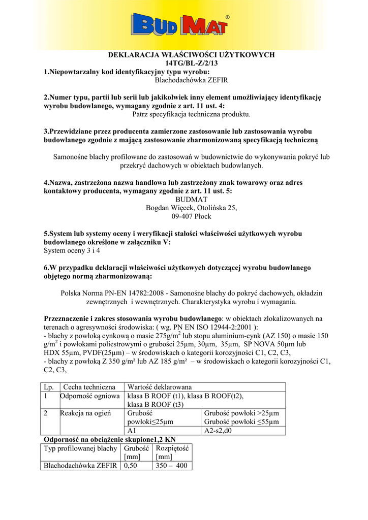 DEKLARACJA WŁAŚCIWOŚCI UŻYTKOWYCH 14TG/BL-Z/2/13 1.Niepowtarzalny kod identyfikacyjny typu wyrobu: Blachodachówka ZEFIR 2.Numer typu, partii lub serii lub jakikolwiek inny element umożliwiający identyfikację wyrobu budowlanego, wymagany zgodnie z art. 11 ust. 4: Patrz specyfikacja techniczna produktu. 3.Przewidziane przez producenta zamierzone zastosowanie lub zastosowania wyrobu budowlanego zgodnie z mającą zastosowanie zharmonizowaną specyfikacją techniczną Samonośne blachy profilowane do zastosowań w budownictwie do wykonywania pokryć lub przekryć dachowych w obiektach budowlanych. 4.Nazwa, zastrzeżona nazwa handlowa lub zastrzeżony znak towarowy oraz adres kontaktowy producenta, wymagany zgodnie z art. 11 ust. 5: BUDMAT Bogdan Więcek, Otolińska 25, 09-407 Płock 5.System lub systemy oceny i weryfikacji stałości właściwości użytkowych wyrobu budowlanego określone w załączniku V: System oceny 3 i 4 6.W przypadku deklaracji właściwości użytkowych dotyczącej wyrobu budowlanego objętego normą zharmonizowaną: Polska Norma PN-EN 14782:2008 - Samonośne blachy do pokryć dachowych, okładzin zewnętrznych i wewnętrznych. Charakterystyka wyrobu i wymagania. Przeznaczenie i zakres stosowania wyrobu budowlanego: w obiektach zlokalizowanych na terenach o agresywności środowiska: ( wg. PN EN ISO 12944-2:2001 ): - blachy z powłoką cynkową o masie 275g/m2 lub stopu aluminium-cynk (AZ 150) o masie 150 g/m2 i powłokami poliestrowymi o grubości 25µm, 30µm, 35µm, SP NOVA 50µm lub HDX 55µm, PVDF(25µm) – w środowiskach o kategorii korozyjności C1, C2, C3, - blachy z powłoką Z 350 g/m² lub AZ 185 g/m² – w środowiskach o kategorii korozyjności C1, C2, C3, Lp. Cecha techniczna 1 Odporność ogniowa Wartość deklarowana klasa B ROOF (t1), klasa B ROOF(t2), klasa B ROOF (t3) Grubość powłoki >25µm 2 Reakcja na ogień Grubość powłoki≤25µm Grubość powłoki ≤55µm A1 A2-s2,d0 Odporność na obciążenie skupione1,2 KN Typ profilowanej blachy Grubość Rozpiętość [mm] [mm] Blachodachówka ZEFIR 0,50 350 – 400 Wodoszczelność, przepuszczalność wody, powietrza i oparów – Wyroby nie mające perforacji (jako uszkodzeń) są wodoszczelne i nieprzepuszczalne dla pary i powietrza. Zmiana wymiarów – rozszerzalność cieplna powinna być brana pod uwagę tam, gdzie taka zmiana może mieć wpływ na eksploatację produktu, należy brać pod uwagę odpowiedni współczynnik rozszerzalności cieplnej - stal: 12 x 10-6 K-1 Tolerancje wymiarowe dla wyrobów dachowych, określone są w PN-EN 508-1 Instytut Techniki Budowlanej: Zakład Trwałości I Ochrony Budowli przeprowadził badania odporności korozyjnej wyrobów i wydał opinię NO-2/819/A/2008 i Raport z badań Nr LM00-0785/11/Z00NM – system oceny 4 Zakład Badań Ogniowych wykonał badania reakcji na ogień powłok lakierniczych i wydał opinie NP-1259.2.1/07/AK; NP-1259.2.2/07/AK; NP-1259.2.3/07/AK, NP-1259.2.3/2007/AK – system oceny 3 Wodoszczelność, przepuszczalność wody, powietrza i oparów – Wyroby nie mające perforacji (jako uszkodzeń) są wodoszczelne i nieprzepuszczalne dla pary i powietrza. Zmiana wymiarów – rozszerzalność cieplna powinna być brana pod uwagę tam, gdzie taka zmiana może mieć wpływ na eksploatację produktu, należy brać pod uwagę odpowiedni współczynnik rozszerzalności cieplnej - stal: 12 x 10-6 K-1 Tolerancje wymiarowe dla wyrobów dachowych, określone są w PN-EN 508-1 7. Właściwości użytkowe wyrobu określone w punkcie 3 są zgodne z właściwościami deklarowanymi w punkcie 6 Niniejsza deklaracja właściwości użytkowych wydana została na wyłączną odpowiedzialność producenta . W imieniu producenta podpisał: Dyrektor ds. Produkcji Mieczysław Kijek (nazwisko i stanowisko) Płock 01.07.2013
