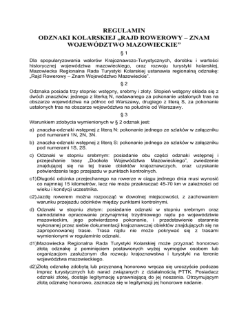 REGULAMIN ODZNAKI KOLARSKIEJ „RAJD ROWEROWY – ZNAM WOJEWÓDZTWO MAZOWIECKIE” §1 Dla spopularyzowania walorów Krajoznawczo-Turystycznych, dorobku i wartości historycznej województwa mazowieckiego, oraz rozwoju turystyki kolarskiej, Mazowiecka Regionalna Rada Turystyki Kolarskiej ustanawia regionalną odznakę: „Rajd Rowerowy – Znam Województwo Mazowieckie”. §2 Odznaka posiada trzy stopnie: wstępny, srebrny i złoty. Stopień wstępny składa się z dwóch znaczków: jednego z literką N, nadawanego za pokonanie ustalonych tras na obszarze województwa na północ od Warszawy, drugiego z literą S, za pokonanie ustalonych tras na obszarze województwa na południe od Warszawy. §3 Warunkiem zdobycia wymienionych w § 2 odznak jest: a) znaczka-odznaki wstępnej z literą N: pokonanie jednego ze szlaków w załączniku pod numerami 1N, 2N, 3N. b) znaczka-odznaki wstępnej z literą S: pokonanie jednego ze szlaków w załączniku pod numerami 1S, 2S. c) Odznaki w stopniu srebrnym: posiadanie obu części odznaki wstępnej i przejechanie trasy „Dookoła Województwa Mazowieckiego”, zwiedzenie znajdującej się na tej trasie obiektów krajoznawczych, oraz uzyskanie potwierdzenia tego przejazdu w punktach kontrolnych. c1) Długość odcinka przejechanego na rowerze w ciągu jednego dnia musi wynosić co najmniej 15 kilometrów, lecz nie może przekraczać 45-70 km w zależności od wieku i kondycji uczestnika. c2) Jazdę rowerem można rozpocząć w dowolnej miejscowości, z zachowaniem warunku przejazdu odcinków między punktami kontrolnymi. d) Odznaki w stopniu złotym: posiadanie odznaki w stopniu srebrnym oraz samodzielne opracowanie przynajmniej trzydniowego rajdu po województwie mazowieckim, jego potwierdzone pokonanie, i przedstawienie starannie wykonanej przez siebie dokumentacji krajoznawczej obiektów znajdujących się na zaproponowanej trasie. Trasa rajdu nie może pokrywać się z trasami wymienionymi w regulaminie odznaki. d1) Mazowiecka Regionalna Rada Turystyki Kolarskiej może przyznać honorowo złotą odznakę z pominięciem postawionych wyżej wymogów osobom lub organizacjom zasłużonym dla rozwoju krajoznawstwa i turystyki na terenie województwa mazowieckiego. d2) Złotą odznakę zdobytą lub przyznaną honorowo wręcza się uroczyście podczas imprez turystycznych lub narad związanych z działalnością PTTK. Posiadacz odznaki złotej, dostaje legitymację uprawniającą do jej noszenia. Otrzymującym złotą odznakę honorowo, zaznacza się w legitymacji jej honorowe nadanie. §4 Potwierdzenia realizowanych zadań, przejechanych odcinków trasy i przejazdy przez punkty kontrolne należy dokonywać w specjalnie do tego celu przeznaczonej "Książeczce Wycieczek Kolarskich". Przejechana trasa może być zaliczona do Kolarskiej Odznaki Turystycznej (KOT) i innych odznak krajoznawczych. §5 Turysta po zdobyciu potwierdzeń do każdego stopnia odznaki przekazuje swoją, wymienioną w §4 specjalną książeczkę wycieczek kolarskich do weryfikacji Mazowieckiej Radzie Regionalnej Turystyki Kolarskiej, która jest jedynym weryfikatorem tych odznak. §6 Przyznane odznaki turyści wykupują w biurze oddziału PTTK Śródmieście. Jej honorowi laureaci otrzymują złotą odznakę gratis. §7 Odznaki może zdobyć turysta począwszy od 10 roku życia, z tym, że niepełnoletni mogą pokonywać trasę tylko w pod opieką osób dorosłych. §8 Udział w rajdzie odbywa się na własne ryzyko. Organizatorzy nie ponoszą żadnej odpowiedzialności za jakiekolwiek szkody, których może doznać uczestnik, jak również za szkody wyrządzone przez uczestnika osobom trzecim. §9 Prawo interpretacji niniejszego regulaminu przysługuje jedynie MRRTur. Kol. § 10 Regulamin został zatwierdzony dnia 11 grudnia 2004 r. przez Mazowiecką Regionalną Radę Turystyki Kolarskiej. 2 ZAŁĄCZNIKI do regulaminu odznaki „Rajd Rowerowy – Znam Województwo Mazowieckie” UWAGA: W opisach tras miejscowości napisane dużymi literami są punktami kontrolnymi, w których należy uzyskać potwierdzenie pobytu. Miejscowości podkreślone mają duże walory krajoznawcze. Oznakowanie w nawiasach: M – muzeum P – obiekt obowiązkowy Kolarskiej Odznaki Pielgrzymiej Z – obiekt Odznaki Szlakiem Zamków w Polsce ZAŁACZNIK nr 1 Wykaz odwiedzanych miejscowości warunkujących zdobycie znaczka w stopniu wstępnym: 1N MAZOWIECKI SZLAK CENTRALNY WARSZAWA (M,P,Z) Łomianki PALMIRY (M) MODLIN Nasielsk PUŁTUSK (M,P,Z) SZELKÓW (P) Maków Mazowiecki PRZASNYSZ (M,P) ROSTKOWO (P) OPINOGÓRA (M) CIECHANÓW (M.Z). 2N MAZOWIECKI SZLAK HISTORYCZNY SOCHACZEW (M,Z) ŻELAZOWA WOLA (M) Brochów Tułowice (M) ŚLADÓW Wyszogród CZERWIŃSK (M) Zakroczym MODLIN Nowy Dwór Mazowiecki Janówek Chotomów JABŁONNA WARSZAWA. 3N MAZOWIECKI SZLAK LlWCA WYSZKÓW (M) KAMIEŃCZYK Gwizdały (M) ŁOCHÓW LIW (M,Z) WĘGRÓW SOKOŁÓW PODLASKI Mokobody SUCHA (M) Polaki (M) KOTUŃ (M) Iganie SIEDLCE (M). 1S MAZOWIECKI SZLAK PAMIĘCI WIELKICH POLAKÓW WARSZAWA (M,P,Z) KOMORÓW Nowa Wieś OTRĘBUSY (M) KAROLIN PODKOWALEŚNA (M) GRODZISKMAZ (M) Kuklówka RADZIEJOWlCE (M) ŻELECHÓW OJRZANÓW Młochów MAGDALENKA FALENTY RASZYN WARSZAWA (Józef Chełmoński, Maria Dąbrowska, Pola Gojawiczyńska, Benedykt Herz, Anna i Jarosław Iwaszkiewiczowie, Aleksander Janowski, Mira i Tadeusz Sygietyńscy) 2S MAZOWIECKI SZLAK POŁUDNIOWY WARSZAWA (M,P,Z) KONSTANCIN-JEZIORNA (M) GÓRA KALWARIA (M) CZERSK (Z) CHYNÓW Budziszyn WARKA (M) Grabów n/Pilicą STUDZIANKI PANCERNE Głowaczów Brzóza PIONKI RADOM (M). 3 ZAŁĄCZNIK nr 2 RAJD DOOKOŁA WOJEWÓDZTWA MAZOWIECKIEGO SOCHACZEW (M,Z) Iłów SANNIKI (M) Pacyna GOSTYNIN (Z) Lucień NOWY DUNINÓW Soczewka ŁĄCK PŁOCK (M.P.Z) Proboszewice Sikórz Bożewo MOCHOWO SIERPC (M) Rosciszewo BIEŻUŃ (M) ŻUROMIN MŁAWA (M) Grzebsk CHORZELE Krukowo Czamia MYSZYNIEC (M) ŁYSE KADZIDŁO (M) Lelis (M) OSTROŁĘKA Czerwin OSTRÓW MAZ. BROK TREBUNKA (M) KOSÓW LACKI (alternatywnie TREBUNKA ZU