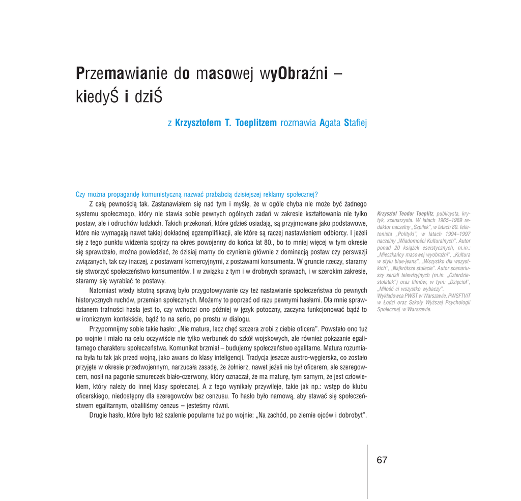 Przemawianie do masowej wyObrani kiedy i dzi z Krzysztofem T. Toeplitzem rozmawia Agata Stafiej Czy mo¿na propagandê komunistyczn¹ nazwaæ prababci¹ dzisiejszej reklamy spo³ecznej? Z ca³¹ pewnoci¹ tak. Zastanawia³em siê nad tym i mylê, ¿e w ogóle chyba nie mo¿e byæ ¿adnego systemu spo³ecznego, który nie stawia sobie pewnych ogólnych zadañ w zakresie kszta³towania nie tylko postaw, ale i odruchów ludzkich. Takich przekonañ, które gdzie osiadaj¹, s¹ przyjmowane jako podstawowe, które nie wymagaj¹ nawet takiej dok³adnej egzemplifikacji, ale które s¹ raczej nastawieniem odbiorcy. I je¿eli siê z tego punktu widzenia spojrzy na okres powojenny do koñca lat 80., bo to mniej wiêcej w tym okresie siê sprawdza³o, mo¿na powiedzieæ, ¿e dzisiaj mamy do czynienia g³ównie z dominacj¹ postaw czy perswazji zwi¹zanych, tak czy inaczej, z postawami komercyjnymi, z postawami konsumenta. W gruncie rzeczy, staramy siê stworzyæ spo³eczeñstwo konsumentów. I w zwi¹zku z tym i w drobnych sprawach, i w szerokim zakresie, staramy siê wyrabiaæ te postawy. Natomiast wtedy istotn¹ spraw¹ by³o przygotowywanie czy te¿ nastawianie spo³eczeñstwa do pewnych historycznych ruchów, przemian spo³ecznych. Mo¿emy to poprzeæ od razu pewnymi has³ami. Dla mnie sprawdzianem trafnoci has³a jest to, czy wchodzi ono póniej w jêzyk potoczny, zaczyna funkcjonowaæ b¹d to w ironicznym kontekcie, b¹d to na serio, po prostu w dialogu. Przypomnijmy sobie takie has³o: Nie matura, lecz chêæ szczera zrobi z ciebie oficera. Powsta³o ono tu¿ po wojnie i mia³o na celu oczywicie nie tylko werbunek do szkó³ wojskowych, ale równie¿ pokazanie egalitarnego charakteru spo³eczeñstwa. Komunikat brzmia³ budujemy spo³eczeñstwo egalitarne. Matura rozumiana by³a tu tak jak przed wojn¹, jako awans do klasy inteligencji. Tradycja jeszcze austro-wêgierska, co zosta³o przyjête w okresie przedwojennym, narzuca³a zasadê, ¿e ¿o³nierz, nawet je¿eli nie by³ oficerem, ale szeregowcem, nosi³ na pagonie sznureczek bia³o-czerwony, który oznacza³, ¿e ma maturê, tym samym, ¿e jest cz³owiekiem, który nale¿y do innej klasy spo³ecznej. A z tego wynika³y przywileje, takie jak np.: wstêp do klubu oficerskiego, niedostêpny dla szeregowców bez cenzusu. To has³o by³o namow¹, aby stawaæ siê spo³eczeñstwem egalitarnym, obalilimy cenzus jestemy równi. Drugie has³o, które by³o te¿ szalenie popularne tu¿ po wojnie: Na zachód, po ziemie ojców i dobrobyt. Krzysztof Teodor Toeplitz, publicysta, krytyk, scenarzysta. W latach 19651969 redaktor naczelny Szpilek, w latach 80. felietonista Polityki, w latach 19941997 naczelny Wiadomoci Kulturalnych. Autor ponad 20 ksi¹¿ek eseistycznych, m.in.: Mieszkañcy masowej wyobrani, Kultura w stylu blue-jeans, Wszystko dla wszystkich, Najkrótsze stulecie. Autor scenariuszy seriali telewizyjnych (m.in. Czterdziestolatek) oraz filmów, w tym: Dziêcio³, Mi³oæ ci wszystko wybaczy. Wyk³adowca PWST w Warszawie, PWSFTViT w £odzi oraz Szko³y Wy¿szej Psychologii Spo³ecznej w Warszawie. 67 Przemawianie do masowej... Chodzi³o o to, aby ludnoæ przesadziæ. Nie tylko tê, która si³¹ rzeczy musia³a siê tam dostaæ, tzn. z terenów wschodnich, ale równie¿ z Polski centralnej, wci¹gn¹æ na ziemie tzw. odzyskane. Dla mnie jest to przyk³ad, jak pewne ogólne has³o ma przemówiæ do wyobrani spo³ecznej, namawiaj¹c spo³eczeñstwo do wziêcia udzia³u w procesie, który by³ wielk¹ migracj¹. Znajdujemy dwa argumenty tego procesu w tym hale. Mianowicie: to jest ziemia ojców. Uwa¿ano je za ziemie piastowskie, które nam siê s³usznie nale¿¹ od dawna i w zwi¹zku z tym musimy je odzyskaæ. I argument drugi tam czeka dobrobyt. By³o to dosyæ dziwaczne, bo has³o dobrobytu w³aciwie nie wystêpowa³o a¿ do lat 70. w pedagogice spo³ecznej okresu PRL-u. Nie mówi³o siê o dobrobycie, ale o osi¹gniêciach zbiorowych. Dopiero na tym polega³ nowy etap, zapocz¹tkowany przez epokê gierkowsk¹. Natomiast w tym czasie has³em, które wesz³o do obiegu, by³o: Ca³y naród buduje stolicê. A wiêc odbudowa Warszawy, jako zadanie ogólnonarodowe, bez obietnicy, ¿e to bêdzie dobrobyt, tylko to stanie siê symbolem wspania³ego pañstwa. I w³aciwie takimi chwytami ogólnymi, które te trzy has³a, moim zdaniem, ilustruj¹, operowa³ ten system. By³y to chwyty w³aciwie nie propagandy, a pedagogiki spo³ecznej, wykorzystywane mniej wiêcej do lat 70. Wówczas, jak mi siê wydaje, nastêpuje pewna zmiana jakoci perswazji. Ca³a epoka gierkowska by³a prób¹ w³¹czenia Polski w proces bogacenia siê indywidualnego, który na Zachodzie by³ niezwykle rozwiniêty. Wiadomo by³o, ¿e ju¿ nie uda siê dzia³aæ tylko na zasadzie kolektywnego wysi³ku, który ma chocia¿by odbudowaæ stolicê czy zbudowaæ przemys³, tylko ¿e ludzie chc¹ co z tego mieæ. Wtedy, jak wiemy, powstaje has³o: ¯eby Polska ros³a w si³ê, a ludzie ¿yli dostatniej, jako g³ówne za³o¿enie systemu tego okresu. Mylê, ¿e by³o to doæ precyzyjne sformu³owanie okrelaj¹ce, o co chodzi³o politykom. To oni przecie¿ nadawali ton i kierunek tamtej dzia³alnoci. Chciano pogodziæ jednoczenie si³ê pañstwa, znaczenie pañstwa z jednoczesn¹ korzyci¹ poszczególnych ludzi. To, jak wiemy, wymaga³o nie tylko zmiany politycznej, ale równie¿ przekonania o w³asnej wartoci. Nasze spo³eczeñstwo mia³o ju¿ w tym okresie przecie¿ poczucie pewnego kompleksu. Wiedziano, ¿e kraje Zachodu rozwijaj¹ siê szybciej, s¹ bardziej kolorowe, zdecydowanie zasobniejsze, ¿e maj¹ wiêcej rozmaitych swobód, ¿e jest tam, krótko mówi¹c, lepiej. A wiêc ta wiadomoæ powodowa³a nie tylko poczucie wadliwoci systemu, ale równie¿ pewien rodzaj kompleksu osobistego, ¿e my mamy dwie lewe rêce, ¿e nam co nie wychodzi. Z tego siê rodzi has³o: Polak potrafi. Zawo³anie to u¿ywane do dzisiaj w rozmaitych kontekstach mia³o na celu podbudowaæ nasze samopoczuc