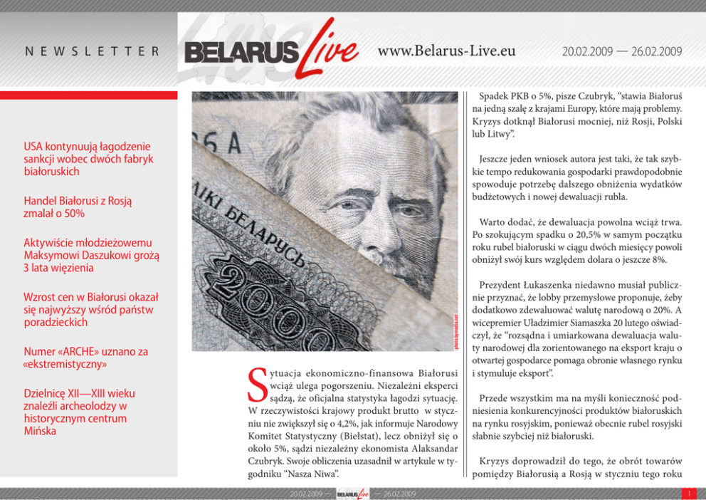 www.Belarus-Live.eu N e w s l e t t e r Spadek PKB o 5%, pisze Czubryk, “stawia Białoruś na jedną szalę z krajami Europy, które mają problemy. Kryzys dotknął Białorusi mocniej, niż Rosji, Polski lub Litwy”. USA kontynuują łagodzenie sankcji wobec dwóch fabryk białoruskich Jeszcze jeden wniosek autora jest taki, że tak szybkie tempo redukowania gospodarki prawdopodobnie spowoduje potrzebę dalszego obniżenia wydatków budżetowych і nowej dewaluacji rubla. Handel Białorusі z Rosją zmalał o 50% Warto dodać, że dewaluacja powolna wciąż trwa. Po szokującym spadku o 20,5% w samym początku roku rubel białoruskі w ciągu dwóch miesięcy powoli obniżył swój kurs względem dolara o jeszcze 8%. Aktywiście młodzieżowemu Maksymowi Daszukowi grożą 3 lata więzienia Dzielnicę XIІ—XIII wieku znaleźli archeolodzy w historycznym centrum Mińska photo.bymedia.net Wzrost cen w Białorusі okazał się najwyższy wśród państw poradzieckich Numer «ARCHE» uznano za «ekstremistyczny» 20.02.2009 — 26.02.2009 S ytuacja ekonomiczno-finansowa Białorusі wciąż ulega pogorszeniu. Niezależni eksperci sądzą, że oficjalna statystyka łagodzi sytuację. W rzeczywistości krajowy produkt brutto w styczniu nie zwiększył się o 4,2%, jak informuje Narodowy Komitet Statystyczny (Biełstat), lecz obniżył się o około 5%, sądzi niezależny ekonomista Alaksandar Czubryk. Swoje obliczenia uzasadnił w artykule w tygodniku “Nasza Niwa”. 20.02.2009 — — 26.02.2009 Prezydent Łukaszenkа niedawno musiał publicznie przyznać, że lobby przemysłowe proponuje, żeby dodatkowo zdewaluować walutę narodową o 20%. А wicepremier Uładzimier Siamaszka 20 lutego oświadczył, że “rozsądna i umiarkowana dewaluacja waluty narodowej dla zorientowanego na eksport kraju o otwartej gospodarce pomaga obronie własnego rynku i stymuluje eksport”. Przede wszystkim ma na myśli konieczność podniesienia konkurencyjności produktów białoruskich na rynku rosyjskim, ponieważ obecnie rubel rosyjskі słabnie szybciej niż białoruskі. Kryzys doprowadził do tego, że obrót towarów pomiędzy Białorusią a Rosją w styczniu tego roku 1 spadł o 40–50% w porównaniu do analogicznego okresu w zeszłym roku. O tym 25 lutego powiedział zastępca Ministra Spraw Zagranicznych Białorusі Ihar Pietryszenka. W magazynach przedsiębiorstw rosną zasoby niewysprzedanych produktów. Niektóre z przedsiębiorstw muszą wprowadzać skrócony tydzień roboczy, wysyłać pracowników na nieodpłatne urlopy. Rośnie niebezpieczeństwo bezrobocia. Nasilenie się zjawisk kryzysowych może spowodować wzrost napięcia społecznego. Poziom życia obywateli już poważnie spada. W styczniu wzrost kosztów konsumpcyjnych w Białorusі -4,1% -okazał się najwyższy na całej przestrzeni poradzieckiej. Równolegle zarobki spadły. Według Biełstatu, średnie zarobki obniżyły się z 1 000,2 tysięcy rubli w grudniu do 919,6 rubli w styczniu (o 8,1%). W przeliczeniu na dolary spadek w ogóle jest oszołamiający — z $450 do $330 (o 26,7%). Obserwatorzy twierdzą, że jest to porażka obietnic Łukaszenkі o tym, że przeciętny zarobek miesięczny w kraju wyrośnie w przeliczeniu do 700 dolarów w roku 2010. Zdaniem ekonomisty Leanida Zaiki, w rzeczywistości Białorusinów czeka obniżenie poziomu życia o około 30%, і spadek będzie trwał do roku 2012. Właśnie surowe warunki ekonomiczne zmuszają rząd białoruski do normalizacji relacji z Zachodem. W szczególności, Mińsk jest przyjaźnie nastawiony wobec nowego programu UE “Partnerstwo Wschodnie”. jednak białoruscy oficjele podkreślają, że chcieliby zbliżać się ze zjednoczoną Europą na własnych warunkach - faktycznie pomijając problemy demokracji i praw człowieka. Nie przestrzegano praw człowieka na Białorusі w zeszłym. Tak wnioskuje ogłoszone niedawno coroczne sprawozdanie o prawach człowieka, przygotowane przez Departament Państwowy USA. W dokumencie mówi się, że w zeszłym roku władze białoruskіe nadal popełniały “częste poważne wykroczenia poza uprawnienia”. W szczególności, ograniczano obywatelskie prawa i wolność, w tym wolność prasy, prawo wolności wypowiadania się, zebrań, zrzeszania i religii. Podkreśla się, że w kraju “poważnie ogranicza się prawo obywateli do zmiany rządu”. Zaznacza się także, że w 2008 roku kontynuowano areszty i uwięzienie osób, występujących z krytyką wobec oficjalnej władzy. Stwierdza się, że “białoruskіe organy ochrony prawa bez uzasadnienia stosowały siłę rozpędzając pokojowe akcje protestu; korupcja nadal pozostaje problemem; organizacje pozarządowe і partie polityczne były prześladowane, karane albo likwidowane”. Zdaniem opozycjonistów, na dany moment sytuacja nie zmieniła się, а ostatnie tygodnie szczególnie charakteryzują się falą represji. W kołach opozycjonistów za nowych więźniów politycznych uznaje się aresztowanych w lutym liderów ruchu przedsiębiorców Juryego Lawonawa, Mikałaja Autuchowicza i Uładzimiera Asipienkę z Wołkowyska (oficjalnie oskarża się ich wg kodeksu karnego), а także 20.02.2009 — — 26.02.2009 photo.bymedia.net photo.bymedia.net www.Belarus-Live.eu aktywistę młodzieżowego Arcioma Dubskiego. Mówi się o okrutnym rozpędzeniu w Mińsku akcji ulicznych 14 і 16 lutego. W związku z tym część opozycji politycznej skrytykowała wizytę na Białoruś 19 lutego Sekretarza Generalnego Rady UE Haverа Solany, nazywając obecną politykę Brukseli względem Białorusi nieprzejrzystą, nieprzezorną і nawet amoralną. 24 lutego w Mińsku odbyło się spotkanie, w którego czasie szereg polityków opozycyjnych wypowiedział zaniepokojenie możliwością dołączenia się Białorusі do “Partnerstwa Wschodniego” bez spełnienia warunków demokratyzacji. Jak oświadczył BiełaPAN były zastępca Ministra Sptaw Zagranicznych Andrej Sannikau, “obecnie 