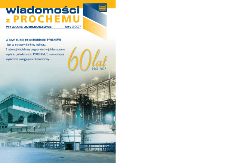 wiadomoÊci z PROCHEMU WYDANIE JUBILEUSZOWE W lutym br. mija 60 lat dzia∏alnoÊci PROCHEMU i jest to znaczàcy dla firmy jubileusz. Z tej okazji chcieliÊmy przypomnieç w jubileuszowym wydaniu „WiadomoÊci z PROCHEMU”, najwa˝niejsze wydarzenia i osiàgni´cia z historii firmy… luty 2007 60 lat PROCHEM PROCHEM S.A. PROCHEM S.A. PROCHEM S.A. W lutym br. mija 60 lat dzia∏alnoÊci PROCHEMU i jest to znaczàcy dla firmy jubileusz. Z tej okazji chcieliÊmy przypomnieç w jubileuszowym wydaniu „WiadomoÊci z PROCHEMU”, najwa˝niejsze wydarzenia i osiàgni´cia z historii firmy – przesz∏oÊç i teraêniejszoÊç PROCHEMU, a przede wszystkim ludzi którzy go tworzyli. Liczby sà imponujàce – ponad 3000 inwestycji zaprojektowanych lub zrealizowanych przez PROCHEM i ponad 7000 pracowników zatrudnionych w firmie. Nadal pracujà razem z nami osoby, które zwiàzane sà z PROCHEMEM od ponad 40 lat, a rekordziÊci znacznie przekroczyli 50 lat pracy – zas∏ugujà oni na szczególne podzi´kowania. Ale dzisiaj du˝à grup´ w firmie stanowià tak˝e ludzie m∏odzi, od których w du˝ym stopniu zale˝y przysz∏oÊç PROCHEMU. Historycznie bowiem klucz do sukcesu firmy zawsze by∏ taki sam – PRACOWNICY z pomys∏ami i inwencjà, silnie identyfikujàcy si´ z firmà i jej strategià dzia∏ania, nie l´kajàcy si´ ponoszenia odpowiedzialnoÊci. Tylko najlepsi. Jubileusz obchodzimy w firmie, która jest w dobrej kondycji i ma du˝e perspektywy rozwoju. ˚yczmy wi´c PROCHEMOWI nast´pnych udanych lat, umiej´tnoÊci rozwiàzywania kryzysowych sytuacji (oby jednak nas one omija∏y), aby nie opuszcza∏o Go tak wa˝ne w ˝yciu szcz´Êcie i by∏a w nim jak dotychczas otwartoÊç na „nowe”. Mi∏ej lektury ˝yczy S.A. 60 lat SIEDZIBY SIEDZIBY 1 Od poczàtku dzia∏alnoÊci firma zmienia∏a swojà siedzib´ 7 razy. Najd∏u˝ej, bo a˝ 28 lat sp´dzi∏a w budynku na ul. Marsza∏kowskiej 82/86. Poni˝ej wykaz wszystkich dotychczasowych siedzib: 1. ul. Lwowska 15, w latach 1947-48, 2. ul. ˚urawia 1, w 1948 r., 3. Pl. Trzech Krzy˝y (budynek Paƒstwowej Komisji Planowania Gospodarczego), w 1948 r., 4. ul. D∏uga 52 (budynek „Arsena∏u”), w latach 1949 – 1952, 5. ul. Marsza∏kowska 82/86 (budynek Centralnej Sk∏adnicy Harcerskiej), w latach 1953 – 1981, 6. ul. Ostrobramska 103, w latach 1982 – 2001, 7. ul. Powàzkowska 44c, (budynek „Irydion”), od 2002 r. do chwili obecnej. 2 60 lat PROCHEM PROCHEM S.A. S.A. 3 HISTORIA HISTORIA PROCHEMU 4 W SKRÓCIE Na dzisiejszy obraz PROCHEMU z∏o˝y∏o si´ wiele przeobra˝eƒ – od pracowni projektowej do biura in˝ynierskiego, funkcjonujàcego wed∏ug modelu biur in˝ynierskich dzia∏ajàcych w Europie Zachodniej. Przeobra˝enia te poczàtkowo wynika∏y z potrzeb inwestycyjnych w dobie gospodarki planowej, póêniej by∏y one odpowiedzià na rodzàce si´ mo˝liwoÊci gospodarki wolnorynkowej. W ostatnim okresie - wraz z przystàpieniem Polski do Unii Europejskiej, przeobra˝enia te zwiàzane by∏y z wyrównaniem poziomu technicznego i organizacyjnego firmy z poziomem najlepszych firm zagranicznych o podobnym profilu dzia∏ania. W skrócie przedstawiamy najwa˝niejsze etapy w 60-letniej historii naszej firmy: 1947 r. – zalà˝kiem biura projektowego budownictwa przemys∏owego by∏a powo∏ana i utworzona przez architekta Jana Pàgowskiego pracownia projektowa, 2 5 1948 r. – utworzone zosta∏o Centralne Biuro Studiów i Projektów Budownictwa Przemys∏owego, 1951 r. – nastàpi∏o wydzielenie z tego biura tzw. Ekspozytury Warszawskiej, a nast´pnie utworzenie samodzielnego niezale˝nego przedsi´biorstwa pod nazwà: Warszawskie Biuro Projektów Budownictwa Przemys∏owego, 1963 r. – firma zmieni∏a nazw´ na Biuro Projektów Budownictwa Przemys∏u Chemicznego „PROCHEM”. Biuro by∏o najwi´ksze w resorcie i powierzono mu rol´ biura kierujàcego dla projektów budowlano-instalacyjnych w zak∏adach i obiektach przemys∏u chemicznego, 1971 r. – firma kolejny raz zmieni∏a nazw´ na Przedsi´biorstwo Projektowania i Realizacji Inwestycji Przemys∏u Chemicznego “PROCHEM”, 1991 r. – to poczàtek nowego etapu w historii PROCHEMU. W lipcu tego roku akt notarialny uprawomocni∏ powstanie Spó∏ki Akcyjnej PROCHEM, której akcjonariuszami zostali pracownicy firmy, 1994 r. – mia∏o miejsce pierwsze notowanie akcji Spó∏ki na Gie∏dzie Papierów WartoÊciowych w Warszawie, 1994 r. – inwestorem strategicznym PROCHEMu zosta∏a amerykaƒska firma in˝ynierska FLUOR DANIEL, która zakupi∏a 35% akcji Spó∏ki (od kilku lat FD nie jest ju˝ akcjonariuszem), 1995 r. – jako pierwsza firma in˝ynierska PROCHEM uzyska∏ certyfikat ISO 9001, 1996 r. – PROCHEM rozpoczà∏ budow´ Grupy Kapita∏owej. Poczàtkowo do Grupy tej nale˝a∏y 4 firmy, obecnie PROCHEM ma udzia∏y w kilkunastu firmach, 2003 r. – System Zarzàdzania JakoÊcià w firmie zosta∏ dostosowany do wymagaƒ NATO i spó∏ka uzyska∏a zintegrowany certyfikat ISO i AQAP. 7 6 CZY WIESZ, ˚E… Wi´kszoÊç z nas pami´ta przeprowadzk´ do IRYDIONA. By∏ to styczeƒ 2002 r. kiedy PROCHEM zaczà∏ dzia∏aç w nowej siedzibie. Poczàtkowo firma nasza by∏a jedynym lokatorem tego budynku, ale wkrótce pozosta∏a powierzchnia zosta∏a wynaj´ta w 100% i obecnie IRYDION jest siedzibà 13 firm o ró˝nej wielkoÊci i charakterze dzia∏alnoÊci. PROCHEM w dalszym ciàgu jest g∏ównym najemcà. 3 60 lat PROCHEM PROCHEM S.A. PROCHEM S.A. PROCHEM S.A. W¸ADZE OSIÑGNI¢CIA Mówiàc o jubileuszu firmy nie sposób pominàç tych, którzy kierowali nià przez lata, zapewniajàc stabilnoÊç i przyczyniajàc si´ do najwi´kszych jej sukcesów. Dzi´ki klarownej strategii dzia∏ania kolejnych kierownictw firmy oraz sprawnemu zarzàdzaniu, firma ciàgle „par∏a” do przodu, dokona∏a ogromnego post´pu technicznego i organizacyjnego. W historii PROCHEMU mieliÊmy 7 (znów szcz´Êliwa cyfra 7) „wodzów”, i jak 