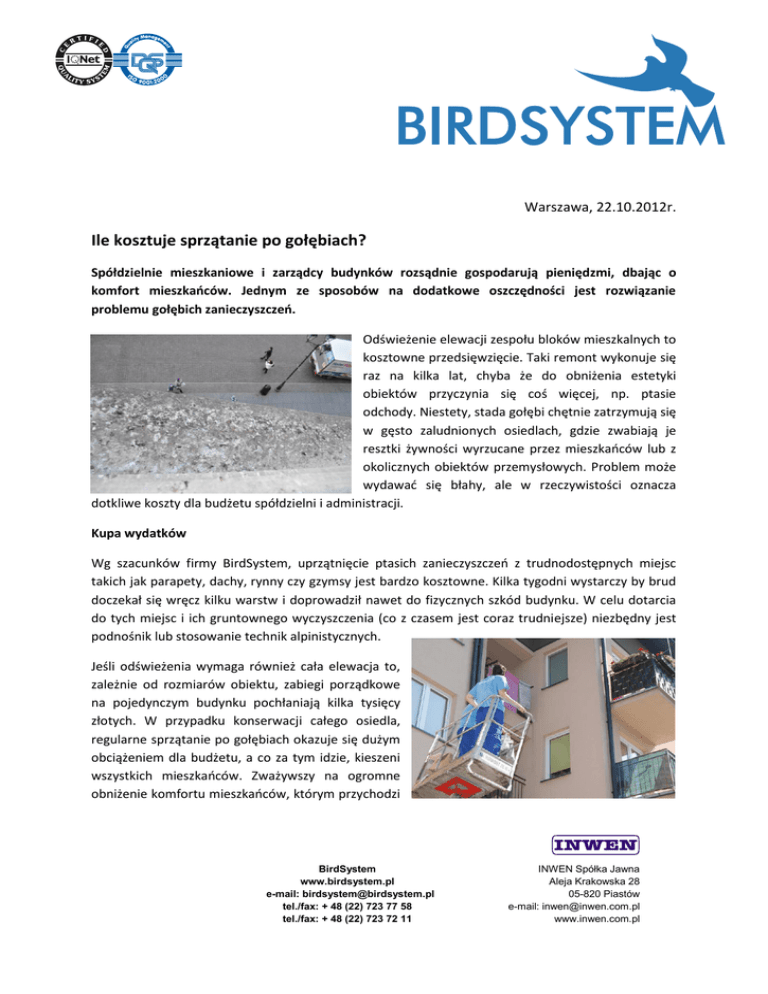 Warszawa, 22.10.2012r. Ile kosztuje sprzątanie po gołębiach? Spółdzielnie mieszkaniowe i zarządcy budynków rozsądnie gospodarują pieniędzmi, dbając o komfort mieszkańców. Jednym ze sposobów na dodatkowe oszczędności jest rozwiązanie problemu gołębich zanieczyszczeń. Odświeżenie elewacji zespołu bloków mieszkalnych to kosztowne przedsięwzięcie. Taki remont wykonuje się raz na kilka lat, chyba że do obniżenia estetyki obiektów przyczynia się coś więcej, np. ptasie odchody. Niestety, stada gołębi chętnie zatrzymują się w gęsto zaludnionych osiedlach, gdzie zwabiają je resztki żywności wyrzucane przez mieszkańców lub z okolicznych obiektów przemysłowych. Problem może wydawać się błahy, ale w rzeczywistości oznacza dotkliwe koszty dla budżetu spółdzielni i administracji. Kupa wydatków Wg szacunków firmy BirdSystem, uprzątnięcie ptasich zanieczyszczeń z trudnodostępnych miejsc takich jak parapety, dachy, rynny czy gzymsy jest bardzo kosztowne. Kilka tygodni wystarczy by brud doczekał się wręcz kilku warstw i doprowadził nawet do fizycznych szkód budynku. W celu dotarcia do tych miejsc i ich gruntownego wyczyszczenia (co z czasem jest coraz trudniejsze) niezbędny jest podnośnik lub stosowanie technik alpinistycznych. Jeśli odświeżenia wymaga również cała elewacja to, zależnie od rozmiarów obiektu, zabiegi porządkowe na pojedynczym budynku pochłaniają kilka tysięcy złotych. W przypadku konserwacji całego osiedla, regularne sprzątanie po gołębiach okazuje się dużym obciążeniem dla budżetu, a co za tym idzie, kieszeni wszystkich mieszkańców. Zważywszy na ogromne obniżenie komfortu mieszkańców, którym przychodzi BirdSystem www.birdsystem.pl e-mail: [email protected] tel./fax: + 48 (22) 723 77 58 tel./fax: + 48 (22) 723 72 11 INWEN Spółka Jawna Aleja Krakowska 28 05-820 Piastów e-mail: [email protected] www.inwen.com.pl też często samemu czyścić, np. balkon, warto sięgnąć po rozwiązanie zapewniające ochronę przed taką sytuacją. ,,Spółdzielnie mieszkaniowe inwestują w BirdSystem, ponieważ jest to tania i skuteczna metoda na odstraszanie gołębi. Dodatkowo, nie godzi w estetykę budynków, system jest praktycznie niewidoczny z poziomu chodnika” – mówi Paweł Ćwierzyński, przedstawiciel BirdSystem. Czy odstraszanie gołębi jest drogie? Ceny za metr BirdSystem wahają się między 17-23zł za m2 zależnie od stopnia zagęszczenia szpilek. Dostępny jest również model BirdSystem Plus zakończony specjalnymi plastikowymi nasadkami. Zważywszy iż jest to rozwiązanie stałe, wiele spółdzielni mieszkaniowych decyduje się na zainwestowanie w moduły mechaniczne, aby uniknąć konieczności regularnego sprzątania po gołębiach. Ponadto, wskazane jest stworzenie regulaminu lub rozporządzenia, w którym zostanie uregulowana kwestia dokarmiania zwierząt przez mieszkańców, np. poprzez wybranie konkretnego miejsca do dokarmiania lub zakazania go w ogóle. Nie wszyscy wiedzą bowiem, że dokarmianie ptaków jest dobre wyłącznie w okresie zimowym, kiedy zdobycie pokarmu faktycznie może być dla nich utrudnione, w innym czasie sprzyja to stłumieniu naturalnych instynktów przetrwania ptaków. Kontakt dla mediów: Korneliusz Smolik, [email protected] , tel. 510 796 217 --------------------------------------------------------------------------------------------------------BirdSystem - to marka firmy INWEN , która od roku 2000 z sukcesem oferuje rozwiązania pozwalające na skuteczne zabezpieczenie obiektów przed niepożądaną obecnością ptaków. BirdSystem to jedyny w Polsce producent profesjonalnych modułów mechanicznych z końcówkami zabezpieczającymi ptaki przed zranieniem. Więcej o BirdSystem na stronie www.birdsystem.pl. BirdSystem www.birdsystem.pl e-mail: [email protected] tel./fax: + 48 (22) 723 77 58 tel./fax: + 48 (22) 723 72 11 INWEN Spółka Jawna Aleja Krakowska 28 05-820 Piastów e-mail: [email protected] www.inwen.com.pl