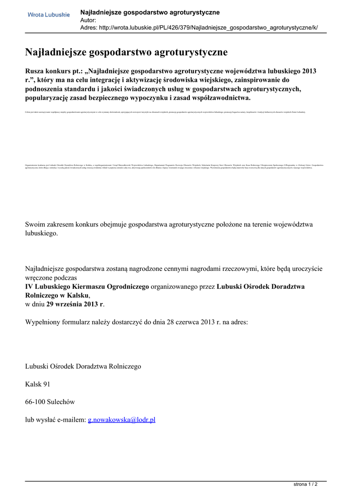 Najładniejsze gospodarstwo agroturystyczne Autor: Adres: http://wrota.lubuskie.pl/PL/426/379/Najladniejsze_gospodarstwo_agroturystyczne/k/ Najładniejsze gospodarstwo agroturystyczne Rusza konkurs pt.: „Najładniejsze gospodarstwo agroturystyczne województwa lubuskiego 2013 r.”, który ma na celu integrację i aktywizację środowiska wiejskiego, zainspirowanie do podnoszenia standardu i jakości świadczonych usług w gospodarstwach agroturystycznych, popularyzację zasad bezpiecznego wypoczynku i zasad współzawodnictwa. Celem jest także nawiązywanie współpracy między gospodarstwami agroturystycznymi w celu wymiany doświadczeń, sprzyjających rozwojowi turystyki na obszarach wiejskich, promocję gospodarstw agroturystycznych województwa lubuskiego; promocję bogactwa natury, krajobrazów i tradycji kulturowych obszarów wiejskich Ziemi Lubuskiej. Organizatorem konkursu jest Lubuski Ośrodek Doradztwa Rolniczego w Kalsku, a współorganizatorami: Urząd Marszałkowski Województwa Lubuskiego, Departament Programów Rozwoju Obszarów Wiejskich, Sekretariat Krajowej Sieci Obszarów Wiejskich oraz Kasa Rolniczego Ubezpieczenia Społecznego O/Regionalny w Zielonej Górze. Gospodarstwa agroturystyczne, które dbają o estetykę i wysoką jakość świadczonych usług wnoszą ewidentny wkład w poprawę estetyki całej wsi, aktywizują społeczeństwo do dbania o lepszy wizerunek swojego otoczenia i obszaru wiejskiego. Wyróżnione gospodarstwa będą stanowiły bazę wzorcową dla innych gospodarstw agroturystycznych z naszego województwa. Swoim zakresem konkurs obejmuje gospodarstwa agroturystyczne położone na terenie województwa lubuskiego. Najładniejsze gospodarstwa zostaną nagrodzone cennymi nagrodami rzeczowymi, które będą uroczyście wręczone podczas IV Lubuskiego Kiermaszu Ogrodniczego organizowanego przez Lubuski Ośrodek Doradztwa Rolniczego w Kalsku, w dniu 29 września 2013 r. Wypełniony formularz należy dostarczyć do dnia 28 czerwca 2013 r. na adres: Lubuski Ośrodek Doradztwa Rolniczego Kalsk 91 66-100 Sulechów lub wysłać e-mailem: [email protected] strona 1 / 2 Najładniejsze gospodarstwo agroturystyczne Autor: Adres: http://wrota.lubuskie.pl/PL/426/379/Najladniejsze_gospodarstwo_agroturystyczne/k/ strona 2 / 2 Powered by TCPDF (www.tcpdf.org)