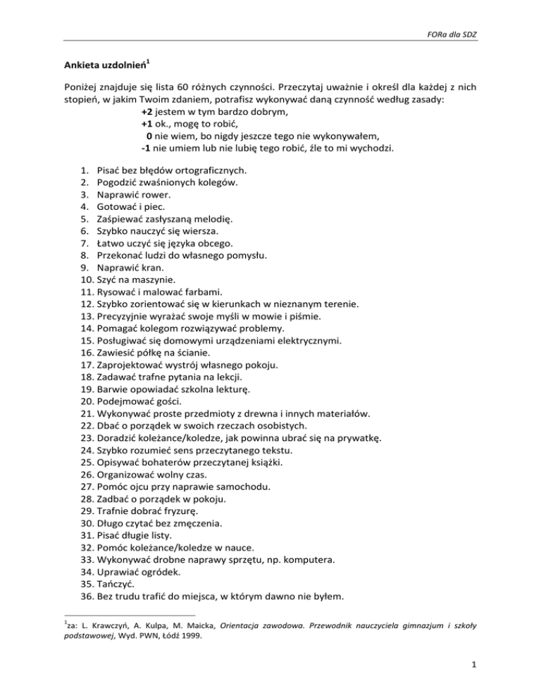 FORa dla SDZ Ankieta uzdolnień1 Poniżej znajduje się lista 60 różnych czynności. Przeczytaj uważnie i określ dla każdej z nich stopień, w jakim Twoim zdaniem, potrafisz wykonywać daną czynność według zasady: +2 jestem w tym bardzo dobrym, +1 ok., mogę to robić, 0 nie wiem, bo nigdy jeszcze tego nie wykonywałem, -1 nie umiem lub nie lubię tego robić, źle to mi wychodzi. 1. Pisać bez błędów ortograficznych. 2. Pogodzić zwaśnionych kolegów. 3. Naprawić rower. 4. Gotować i piec. 5. Zaśpiewać zasłyszaną melodię. 6. Szybko nauczyć się wiersza. 7. Łatwo uczyć się języka obcego. 8. Przekonać ludzi do własnego pomysłu. 9. Naprawić kran. 10. Szyć na maszynie. 11. Rysować i malować farbami. 12. Szybko zorientować się w kierunkach w nieznanym terenie. 13. Precyzyjnie wyrażać swoje myśli w mowie i piśmie. 14. Pomagać kolegom rozwiązywać problemy. 15. Posługiwać się domowymi urządzeniami elektrycznymi. 16. Zawiesić półkę na ścianie. 17. Zaprojektować wystrój własnego pokoju. 18. Zadawać trafne pytania na lekcji. 19. Barwie opowiadać szkolna lekturę. 20. Podejmować gości. 21. Wykonywać proste przedmioty z drewna i innych materiałów. 22. Dbać o porządek w swoich rzeczach osobistych. 23. Doradzić koleżance/koledze, jak powinna ubrać się na prywatkę. 24. Szybko rozumieć sens przeczytanego tekstu. 25. Opisywać bohaterów przeczytanej książki. 26. Organizować wolny czas. 27. Pomóc ojcu przy naprawie samochodu. 28. Zadbać o porządek w pokoju. 29. Trafnie dobrać fryzurę. 30. Długo czytać bez zmęczenia. 31. Pisać długie listy. 32. Pomóc koleżance/koledze w nauce. 33. Wykonywać drobne naprawy sprzętu, np. komputera. 34. Uprawiać ogródek. 35. Tańczyć. 36. Bez trudu trafić do miejsca, w którym dawno nie byłem. 1 za: L. Krawczyń, A. Kulpa, M. Maicka, Orientacja zawodowa. Przewodnik nauczyciela gimnazjum i szkoły podstawowej, Wyd. PWN, Łódź 1999. 1 FORa dla SDZ 37. Posługiwać się językiem obcym. 38. Z łatwością prowadzić rozmowy z ludźmi. 39. Czytać rysunek techniczny. 40. Robić zakupy. 41. Robić dobre zdjęcia fotograficzne. 42. Szybko liczyć. 43. Szybko czytać. 44. Być duszą towarzystwa na prywatce. 45. Posługiwać się komputerem. 46. Pomalować pokój. 47. Układać bukiety z kwiatów. 48. Łatwo poznawać nowe dziedziny wiedzy. 49. Realistycznie opowiadać różne zdarzenia. 50. Sprzeciwić się „głupiemu” pomysłowi kolegów. 51. Objaśnić budowę silnika. 52. Sprawnie zorganizować imprezę klasową. 53. Grać na instrumencie muzycznym. 54. Szybko rozumieć treść instrukcji obsługi jakiegoś urządzenia. 55. Posługiwać się słowami i zwrotami obcojęzycznymi. 56. Zaopiekować się kolegą. 57. Obsługiwać różne urządzenia. 58. Przejrzyście prowadzić notatki. 59. Recytować wiersze. 60. Szybko dostrzec znajomego w tłumie ludzi. Arkusz odpowiedzi: nr. pyt. 1 7 13 19 25 31 37 43 49 55 I punkty nr. pyt 2 8 14 20 26 32 38 44 50 56 II punkty nr. pyt 3 9 15 21 27 33 39 45 51 57 III punkty nr. pyt 4 10 16 22 28 34 40 46 52 58 IV punkty nr. pyt 5 11 17 23 29 35 41 47 53 59 V punkty nr. pyt punkty 6 12 18 24 30 36 42 48 54 60 VI Klucz: I uzdolnienia językowe, II uzdolnienia interpersonalne, III uzdolnienia techniczne, IV uzdolnienia praktyczno-porządkowe, V uzdolnienia artystyczne, VI uzdolnienia poznawcze. 2