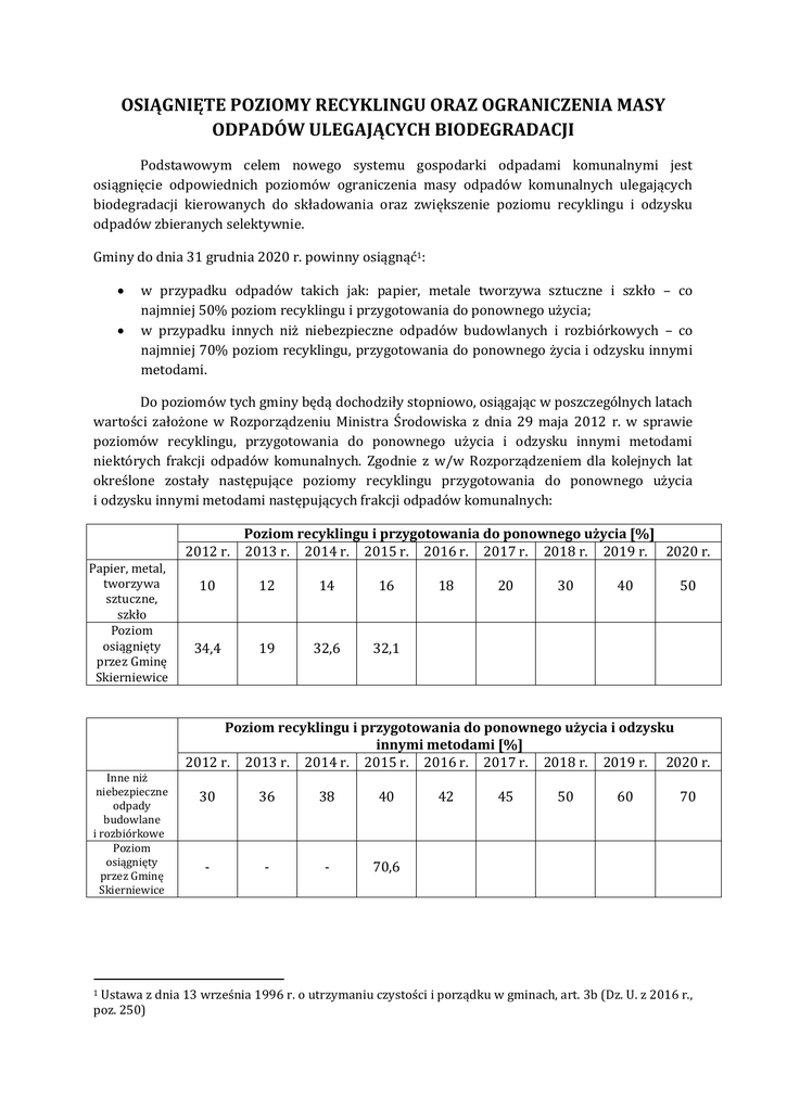 OSIĄGNIĘTE POZIOMY RECYKLINGU ORAZ OGRANICZENIA MASY ODPADÓW ULEGAJĄCYCH BIODEGRADACJI Podstawowym celem nowego systemu gospodarki odpadami komunalnymi jest osiągnięcie odpowiednich poziomów ograniczenia masy odpadów komunalnych ulegających biodegradacji kierowanych do składowania oraz zwiększenie poziomu recyklingu i odzysku odpadów zbieranych selektywnie. Gminy do dnia 31 grudnia 2020 r. powinny osiągnąć1: w przypadku odpadów takich jak: papier, metale tworzywa sztuczne i szkło – co najmniej 50% poziom recyklingu i przygotowania do ponownego użycia; w przypadku innych niż niebezpieczne odpadów budowlanych i rozbiórkowych – co najmniej 70% poziom recyklingu, przygotowania do ponownego życia i odzysku innymi metodami. Do poziomów tych gminy będą dochodziły stopniowo, osiągając w poszczególnych latach wartości założone w Rozporządzeniu Ministra Środowiska z dnia 29 maja 2012 r. w sprawie poziomów recyklingu, przygotowania do ponownego użycia i odzysku innymi metodami niektórych frakcji odpadów komunalnych. Zgodnie z w/w Rozporządzeniem dla kolejnych lat określone zostały następujące poziomy recyklingu przygotowania do ponownego użycia i odzysku innymi metodami następujących frakcji odpadów komunalnych: 2012 r. Papier, metal, tworzywa sztuczne, szkło Poziom osiągnięty przez Gminę Skierniewice Poziom recyklingu i przygotowania do ponownego użycia [%] 2013 r. 2014 r. 2015 r. 2016 r. 2017 r. 2018 r. 2019 r. 2020 r. 10 12 14 16 34,4 19 32,6 32,1 18 20 30 40 50 Poziom recyklingu i przygotowania do ponownego użycia i odzysku innymi metodami [%] 2012 r. 2013 r. 2014 r. 2015 r. 2016 r. 2017 r. 2018 r. 2019 r. 2020 r. Inne niż niebezpieczne odpady budowlane i rozbiórkowe Poziom osiągnięty przez Gminę Skierniewice 30 36 38 40 - - - 70,6 42 45 50 60 70 Ustawa z dnia 13 września 1996 r. o utrzymaniu czystości i porządku w gminach, art. 3b (Dz. U. z 2016 r., poz. 250) 1 Gminy mają również obowiązek ograniczyć masę odpadów komunalnych ulegających biodegradacji przekazywanych do składowania2: do dnia 16 lipca 2013 r. - do nie więcej niż 50% wagowo całkowitej masy odpadów komunalnych ulegających biodegradacji przekazywanych do składowania; do dnia 16 lipca 2020 r. - do nie więcej niż 35% wagowo całkowitej masy odpadów komunalnych ulegających biodegradacji przekazywanych do składowania w stosunku do masy tych odpadów wytworzonych w 1995 r. Poziomy do osiągnięcia w poszczególnych latach oraz sposób ich obliczenia zostały określone w Rozporządzeniu Ministra Środowiska z dnia 25 maja 2012 r. w sprawie poziomów ograniczenia masy odpadów komunalnych ulegających biodegradacji przekazywanych do składowania oraz sposobu obliczania poziomu ograniczania masy tych odpadów i przedstawiają się następująco: Rok Dopuszczalny poziom masy odpadów komunalnych ulegających biodegradacji przekazywanych do składowania w stosunku do masy tych odpadów wytworzonych w 1995 r. [%] Poziom osiągnięty przez Gminę Skierniewice 2012 r. 16 lipca 2013 r. 2014 r. 2015 r. 2016 r. 2017 r. 2018 r. 2019 r. 16 lipca 2020 r. 75 50 50 50 45 45 40 40 35 27 42 29,2 24,1 Ustawa z dnia 13 września 1996 r. o utrzymaniu czystości i porządku w gminach, art. 3c (Dz. U. z 2016 r., poz. 250) 2