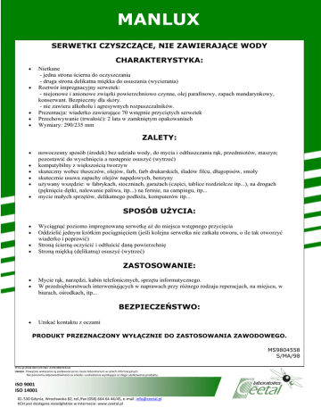 MANLUX SERWETKI CZYSZCZĄCE, NIE ZAWIERAJĄCE WODY CHARAKTERYSTYKA: Nietkane - jedna strona ścierna do oczyszczania - druga strona delikatna miękka do osuszania (wycierania) Roztwór impregnacyjny serwetek: - niejonowe i anionowe związki powierzchniowo czynne, olej parafinowy, zapach mandarynkowy, konserwant. Bezpieczny dla skóry. - nie zawiera alkoholu i agresywnych rozpuszczalników. Prezentacja: wiaderko zawierające 70 wstępnie przyciętych serwetek Przechowywanie (trwałość): 2 lata w zamkniętym opakowaniach Wymiary: 290/235 mm ZALETY: nowoczesny sposób (środek) bez udziału wody, do mycia i odtłuszczania rąk, przedmiotów, maszyn; pozostawić do wyschnięcia a następnie osuszyć (wytrzeć) kompatybilny z większością tworzyw skuteczny wobec tłuszczów, olejów, farb, farb drukarskich, śladów filcu, długopisów, smoły skutecznie usuwa zapachy olejów napędowych, benzyny używany wszędzie: w fabrykach, stoczniach, garażach (części, tablice rozdzielcze itp...), na drogach (pęknięcie dętki, nalewanie paliwa, itp...) na fermie, na campingu, itp... mycie małych sprzętów, delikatnego podłoża, komputerów itp... SPOSÓB UŻYCIA: Wyciągnąć poziomo impregnowaną serwetkę aż do miejsca wstępnego przycięcia Oddzielić jednym krótkim pociągnięciem (jeśli kolejna serwetka nie zatkała otworu, o ile tak otworzyć wiaderko i poprawić) Stroną ścierną oczyścić i odtłuścić daną powierzchnię Stroną miękką (delikatną) osuszyć (wytrzeć) ZASTOSOWANIE: Mycie rąk, narzędzi, kabin telefonicznych, sprzętu informatycznego. W przedsiębiorstwach interweniujących w naprawach przy różnego rodzaju reperacjach, na miejscu, w biurach, ośrodkach, itp... BEZPIECZEŃSTWO: Unikać kontaktu z oczami PRODUKT PRZEZNACZONY WYŁĄCZNIE DO ZASTOSOWANIA ZAWODOWEGO. MS9804558 S/MA/98 WYŁĄCZNIE DO UŻYTKU ZAWODOWEGO UWAGA : Powyższe wskazania są podawane przez nasze laboratorium w celach informacyjnych. Nie ponosimy odpowiedzialności za szkody i uszkodzenia wynikające ze złego użytkowania produktu. ISO 9001 ISO 14001 81-530 Gdynia, Wrocławska 82, tel./fax (058) 664 64 44/45, e-mail: [email protected] KCH jest dostępna nieodpłatnie w Internecie: www.ceetal.pl