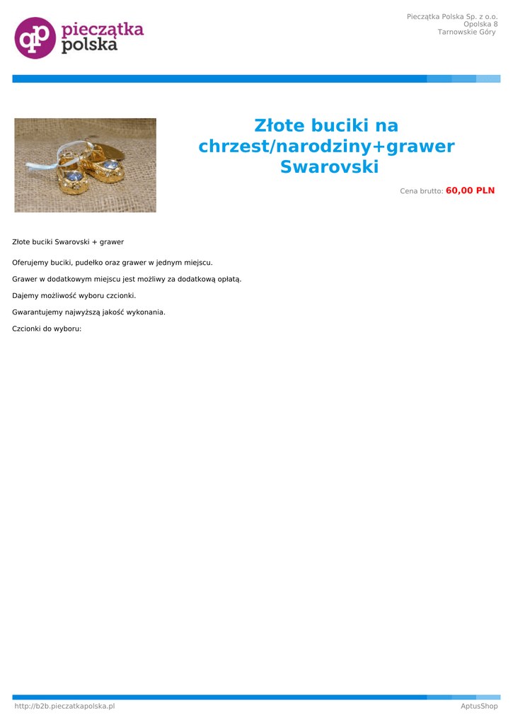 Pieczątka Polska Sp. z o.o. Opolska 8 Tarnowskie Góry Złote buciki na chrzest/narodziny+grawer Swarovski Cena brutto: 60,00 PLN Złote buciki Swarovski + grawer Oferujemy buciki, pudełko oraz grawer w jednym miejscu. Grawer w dodatkowym miejscu jest możliwy za dodatkową opłatą. Dajemy możliwość wyboru czcionki. Gwarantujemy najwyższą jakość wykonania. Czcionki do wyboru: http://b2b.pieczatkapolska.pl AptusShop