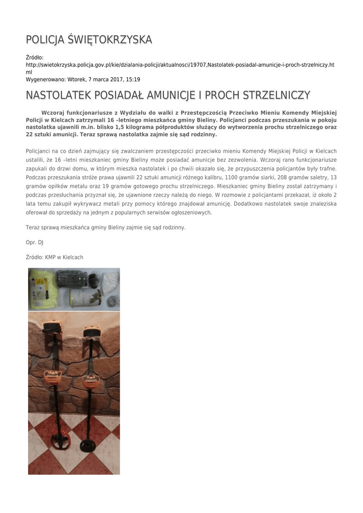 POLICJA ŚWIĘTOKRZYSKA Źródło: http://swietokrzyska.policja.gov.pl/kie/dzialania-policji/aktualnosci/19707,Nastolatek-posiadal-amunicje-i-proch-strzelniczy.ht ml Wygenerowano: Wtorek, 7 marca 2017, 15:19 NASTOLATEK POSIADAŁ AMUNICJE I PROCH STRZELNICZY Wczoraj funkcjonariusze z Wydziału do walki z Przestępczością Przeciwko Mieniu Komendy Miejskiej Policji w Kielcach zatrzymali 16 –letniego mieszkańca gminy Bieliny. Policjanci podczas przeszukania w pokoju nastolatka ujawnili m.in. blisko 1,5 kilograma półproduktów służący do wytworzenia prochu strzelniczego oraz 22 sztuki amunicji. Teraz sprawą nastolatka zajmie się sąd rodzinny. Policjanci na co dzień zajmujący się zwalczaniem przestępczości przeciwko mieniu Komendy Miejskiej Policji w Kielcach ustalili, że 16 –letni mieszkaniec gminy Bieliny może posiadać amunicje bez zezwolenia. Wczoraj rano funkcjonariusze zapukali do drzwi domu, w którym mieszka nastolatek i po chwili okazało się, że przypuszczenia policjantów były trafne. Podczas przeszukania stróże prawa ujawnili 22 sztuki amunicji różnego kalibru, 1100 gramów siarki, 208 gramów saletry, 13 gramów opiłków metalu oraz 19 gramów gotowego prochu strzelniczego. Mieszkaniec gminy Bieliny został zatrzymany i podczas przesłuchania przyznał się, że ujawnione rzeczy należą do niego. W rozmowie z policjantami przekazał, iż około 2 lata temu zakupił wykrywacz metali przy pomocy którego znajdował amunicję. Dodatkowo nastolatek swoje znaleziska oferował do sprzedaży na jednym z popularnych serwisów ogłoszeniowych. Teraz sprawą mieszkańca gminy Bieliny zajmie się sąd rodzinny. Opr. DJ Źródło: KMP w Kielcach Ocena: 0/5 (1) Tweetnij
