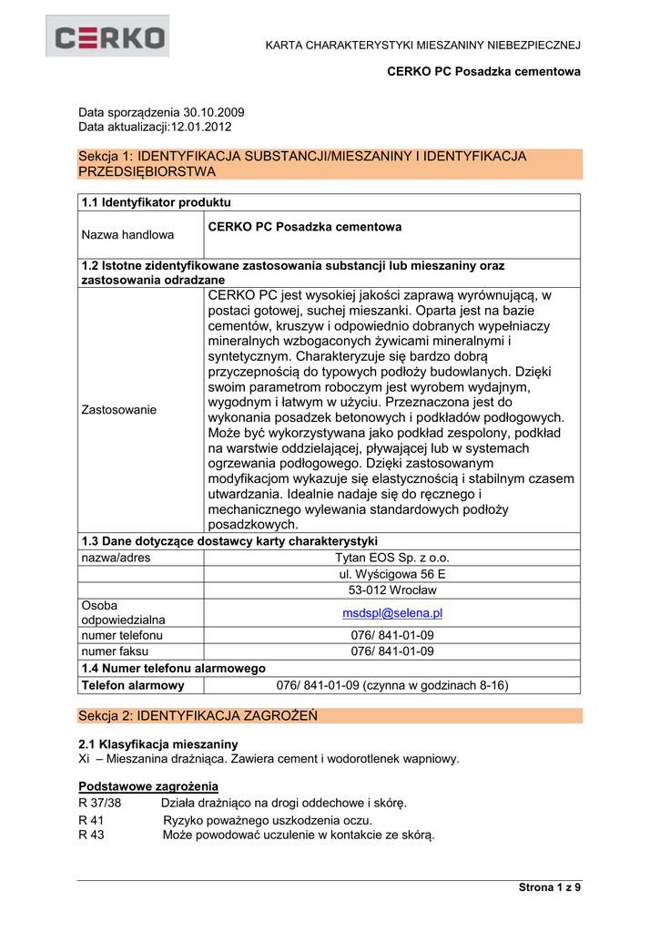 KARTA CHARAKTERYSTYKI MIESZANINY NIEBEZPIECZNEJ CERKO PC Posadzka cementowa Data sporządzenia 30.10.2009 Data aktualizacji:12.01.2012 Sekcja 1: IDENTYFIKACJA SUBSTANCJI/MIESZANINY I IDENTYFIKACJA PRZEDSIĘBIORSTWA 1.1 Identyfikator produktu Nazwa handlowa CERKO PC Posadzka cementowa 1.2 Istotne zidentyfikowane zastosowania substancji lub mieszaniny oraz zastosowania odradzane Zastosowanie CERKO PC jest wysokiej jakości zaprawą wyrównującą, w postaci gotowej, suchej mieszanki. Oparta jest na bazie cementów, kruszyw i odpowiednio dobranych wypełniaczy mineralnych wzbogaconych żywicami mineralnymi i syntetycznym. Charakteryzuje się bardzo dobrą przyczepnością do typowych podłoży budowlanych. Dzięki swoim parametrom roboczym jest wyrobem wydajnym, wygodnym i łatwym w użyciu. Przeznaczona jest do wykonania posadzek betonowych i podkładów podłogowych. Może być wykorzystywana jako podkład zespolony, podkład na warstwie oddzielającej, pływającej lub w systemach ogrzewania podłogowego. Dzięki zastosowanym modyfikacjom wykazuje się elastycznością i stabilnym czasem utwardzania. Idealnie nadaje się do ręcznego i mechanicznego wylewania standardowych podłoży posadzkowych. 1.3 Dane dotyczące dostawcy karty charakterystyki nazwa/adres Tytan EOS Sp. z o.o. ul. Wyścigowa 56 E 53-012 Wrocław Osoba [email protected] odpowiedzialna numer telefonu 076/ 841-01-09 numer faksu 076/ 841-01-09 1.4 Numer telefonu alarmowego Telefon alarmowy 076/ 841-01-09 (czynna w godzinach 8-16) Sekcja 2: IDENTYFIKACJA ZAGROŻEŃ 2.1 Klasyfikacja mieszaniny Xi – Mieszanina drażniąca. Zawiera cement i wodorotlenek wapniowy. Podstawowe zagrożenia R 37/38 Działa drażniąco na drogi oddechowe i skórę. R 41 Ryzyko poważnego uszkodzenia oczu. R 43 Może powodować uczulenie w kontakcie ze skórą. Strona 1 z 9 KARTA CHARAKTERYSTYKI MIESZANINY NIEBEZPIECZNEJ CERKO PC Posadzka cementowa 2.2 Elementy oznakowania Symbole ostrzegawcze Xi – drażniący Zwroty R R 37/38 R 41 R 43 Działa drażniąco na drogi oddechowe i skórę. Ryzyko poważnego uszkodzenia oczu. Może powodować uczulenie w kontakcie ze skórą. Zwroty S S2 Chronić przed dziećmi. S22 Nie wdychać pyłu S 26 Zanieczyszczone oczy przemyć natychmiast dużą ilością wody i zasięgnąć porady lekarza S36/37/39 Nosić odpowiednią odzież ochronną, odpowiednie rękawice ochronne i okulary lub ochronę twarzy S46 W razie połknięcia niezwłocznie zasięgnij porady lekarza – pokaż opakowanie lub etykietę 2.3 Inne zagrożenia Zgodnie z załącznikiem XIII Rozporządzenia REACH w sprawie PBT oraz vPvB, mieszanina nie spełnia kryteriów PBT ani vPvB. Ze względu na swoją postać – pył, produkt może mechanicznie podrażniać oczy i układ oddechowy. Sekcja 3: SKŁAD/INFORMACJA O SKŁADNIKACH 3.1 Substancje Nie dotyczy. 3.2 Mieszaniny Mieszanina cementu proszkowych. portlandzkiego, Substancje niebezpieczne CAS EINECS piasku kwarcowego, metylocelulozy NAZWA STĘŻENIE 65-997-15-1 266-043-4 Klinkier portlandzki >10% 1305-62-0 215-137-3 Wodorotlenek wapniowy <10% i żywic KLASYFIKACJA Xi,37/38 R41, R43 Xi,37/38 R41, R43 Inne informacje: Do klasyfikacji produktu przyjęto rzeczywistą zawartość składników niebezpiecznych. Zawartość rozpuszczalnego chromu (VI) w gotowej masie wyrobu wynosi <0,0002% Pełna treść przytoczonych wskazówek dotyczących zagrożeń znajduje się w rozdziale 16. Strona 2 z 9 KARTA CHARAKTERYSTYKI MIESZANINY NIEBEZPIECZNEJ CERKO PC Posadzka cementowa Sekcja 4: ŚRODKI PIERWSZEJ POMOCY 4.1 Opis środków pierwszej pomocy W przypadku wdychania substancji Dostarczyć świeże powietrze, jeśli są problemy z oddychaniem zastosować oddychanie usta-usta, wezwać lekarza. W przypadku kontaktu ze skórą Zmyć dużą ilością wody lub wody z mydłem. W przypadku podrażnienia skóry zgłosić się do lekarza (pokazać etykietę). W przypadku kontaktu z oczami Nie trzeć oczu. Płukać oczy z otwartą powieką przez 20 minut pod bieżącą wodą. W przypadku soczewek kontaktowych przed płukaniem należy je wyjąć. Należy skonsultować się z lekarzem okulistą. Po połknięciu Nie wywoływać wymiotów. Nie podawać nic do picia, usta przepłukać wodą. Niezwłocznie skonsultować się z lekarzem. 4.2. Najważniejsze ostre i opóźnione objawy oraz skutki narażenia Produkt o odczynie alkalicznym. Nie należy dopuszczać do długotrwałego i bezpośredniego kontaktu suchej bądź gotowej mieszanki ze skórą, oczami czy drogami oddechowymi. Należy przestrzegać uwag dotyczących bezpieczeństwa i użytkowania zamieszczonych na etykiecie. Natychmiast usuwać produkt ze skóry, oczu i śluzówek, co pozwoli zapobiec wszelkim opóźnionym skutkom narażenia. 4.3. Wskazania dotyczące wszelkiej natychmiastowej pomocy lekarskiej i szczególnego postępowania z poszkodowanym Nie dopuszczać do stwardnienia zaprawy. W przypadku kontaktu z oczami lub śluzówkami wskazana jest konsultacja medyczna. W przypadku długotrwałego kontaktu ze skórą stosować kremy ochronne. Sekcja 5: POSTĘPOWANIE W PRZYPADKU POŻARU 5.1 Środki gaśnicze Odpowiednie środki gaśnicze: Wszystkie typy środków gaśniczych. Niewłaściwe środki gaśnicze: brak. 5.2 Szczególne zagrożenia związane z substancją Nie istnieje żadne szczególne zagrożenie związane z właściwościami samego produktu, produktów spalania, lub powstających gazów. 5.3 Informacje dla straży pożarnej Nosić pełne ubranie ochronne. Nosić urządzenie ochrony dróg oddechowych niezależnie od powietrza otoczenia. Sekcja 6. POSTĘPOWANIE W PRZYPADKU NIEZAMIERZONEGO UWOLNIENIA DO ŚRODOWISKA Strona 3 z 9 KARTA CHARAKTERYSTYKI MIESZANINY NIEBEZPIECZNEJ CERKO PC Posadzka cementowa 6.1 Indywidualne środki ostrożności, wyposażenie ochronne i procedury w sytuacjach awaryjnych Nosić osobistą odzież ochronną. Zadbać o wystarczające wietrzenie. Dla osób nie należących do personelu udzielającego pomocy: Należy ocenić sytuację i