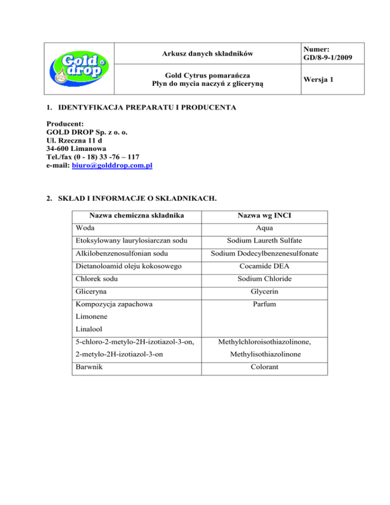 Numer: GD/8-9-1/2009 Arkusz danych składników Gold Cytrus pomarańcza Płyn do mycia naczyń z gliceryną Wersja 1 1. IDENTYFIKACJA PREPARATU I PRODUCENTA Producent: GOLD DROP Sp. z o. o. Ul. Rzeczna 11 d 34-600 Limanowa Tel./fax (0 - 18) 33 -76 – 117 e-mail: [email protected] 2. SKŁAD I INFORMACJE O SKŁADNIKACH. Nazwa chemiczna składnika Woda Etoksylowany laurylosiarczan sodu Alkilobenzenosulfonian sodu Nazwa wg INCI Aqua Sodium Laureth Sulfate Sodium Dodecylbenzenesulfonate Dietanoloamid oleju kokosowego Cocamide DEA Chlorek sodu Sodium Chloride Gliceryna Glycerin Kompozycja zapachowa Parfum Limonene Linalool 5-chloro-2-metylo-2H-izotiazol-3-on, 2-metylo-2H-izotiazol-3-on Barwnik Methylchloroisothiazolinone, Methylisothiazolinone Colorant