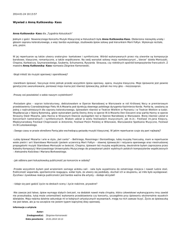 2014-01-24 10:13:57 Wywiad z Anną Kutkowską- Kass Anna Kutkowska- Kass dla „Tygodnia Koluszkach” Jednym z gości Noworocznego Koncertu Muzyki Klasycznej w Koluszkach była Anna Kutkowska-Kass. Obdarzona niezwykłą urodą i głosem sopranu koloraturowego, a więc bardzo wysokiego, studiowała śpiew solowy pod kierunkiem Marii Fołtyn. Wykonuje recitale, arie, pieśni. W jej repertuarze są także utwory oratoryjno- kantatowe i symfoniczne. Wśród wykonywanych przez nią utworów są kompozycje barokowe, klasyczne, romantyczne, a także współczesne. Na swój warsztat solowy moja rozmówczynyni „ bierze” dzieła Moniuszki, Chopina, Karłowicza, Szymanowskeigo, Szuberta, Schumanna, Ryszarda Straussa, czy niektórych spośród kompozytorów francuskich. Z maestro Anną Kutkowską- Kass rozmawia Zbigniew Komorowski. -Skąd miłość do muzyki operowej i operetkowej? -Uwielbiam śpiewać, fascynuje mnie jednak przede wszystkim śpiew operowy, opera, muzyka klasyczna. Moje śpiewanie jest pewnie genetycznie uwarunkowane, ponieważ moja mama jest również śpiewaczką, jednak ma inny głos – mezzosopran. -Proszę coś powiedzieć o sobie naszym czytelnikom? -Posiadam głos – sopran koloraturowy, debiutowałam w Operze Narodowej w Warszawie w roli Królowej Nocy w premierowym przedstawieniu Czarodziejskiego Fletu W.A.Mozarta pod dyrekcją sławnego polskiego dyrygenta Kazimierza Korda. Partię tę, uważaną za jedną z najtrudniejszych dla sopranu koloraturowego, śpiewałam również w Teatrze Wielkim w Poznaniu i w Teatrze Wielkim w Łodzi. Współpracuje z Operą Bytomską, gdzie wykonałam partię Donny Anny w operze W.A.Mozarta Don Giovanni oraz partię Hanny w operze Straszny Dwór Mozarta. Jako Hanna w Strasznym Dworze wystąpiłam też w Operze Narodowej w Warszawie. Biorę również udział w koncertach kameralnych i symfonicznych. Brałam udział w wielu festiwalach muzycznych, jak m.in.: Festiwal im.Jana Kiepury, Międzynarodowy Festiwal Chopinowski w Antoninie, Festiwal Pieśni Polskiej w Wilanowie, Warszawskie Spotkania Muzyczne, Festiwal im.W.Lutosławskiego. -.Swego czasu w prasie określono Panią jako wschodzącą gwiazdę muzyki klasycznej. W jakim repertuarze czuje się pani najlepiej? -Lubię śpiewać Mozarta i arie w stylu „bel canto” – Belliniego, Rossiniego i Donizettiego, lubię muzykę francuską, mam w repertuarze wiele pieśni i arii Stanisława Moniuszki (jestem uczennicą Marii Fołtyn – sławnej śpiewaczki i reżysera operowego oraz niestrudzonej propagatorki muzyki Stanisława Moniuszki w świecie), Chopina, śpiewam też muzykę współczesną, dwukrotnie byłam zaproszona przez Katedrę Kompozycji Warszawskiego Uniwersytetu Muzycznego do prawykonań pieśni wybitnych polskich kompozytorów współczesnych – Aleksandra Kościówa i Mariana Borkowskiego. -.Jak odbiera pani koluszkowską publiczność po koncercie w sobotę? -Przede wszystkim byłam pod wrażeniem samego widoku sali - sala była wypełniona do ostatniego miejsca i nawet ludzie stali. Publiczność wspaniała, spontanicznie reagująca, widać było, że utwory się podobały, słuchali ich w skupieniu, aż miło było występować. Życzliwa i żywiołowa reakcja publiczności jest bardzo ważna dla artysty – dodaje skrzydeł! - Udaje się pani godzić życie na deskach sceny i życie rodzinne, prywatne? -Nie zawsze jest łatwo, śpiew wymaga stałych ćwiczeń, na dodatek nawet mała chrypka, która człowiekowi wykonującemu inny zawód nie przeszkadza, tutaj może uniemożliwić wykonanie przedstawienia czy koncertu, szczególnie przy śpiewaniu ekstremalnie wysokich dźwięków. Moja rodzina dzielnie sekunduje mi w kolejnych artystycznych wyzwaniach, mogę na nich zawsze liczyć. Życie ze śpiewaczką nie jest łatwe, ale ja na szczęście nie jestem typem kapryśnej diwy operowej. Informacje o artykule Autor: Zredagował(a): Data powstania: Zbigniew Komorowski 24.01.2014 10:13 Data ostatniej modyfikacji: Liczba wyświetleń: 535 Wydrukowano z serwisu: archiwum.koluszki.pl Wydrukowano dnia: 2017-03-07 15:28:05