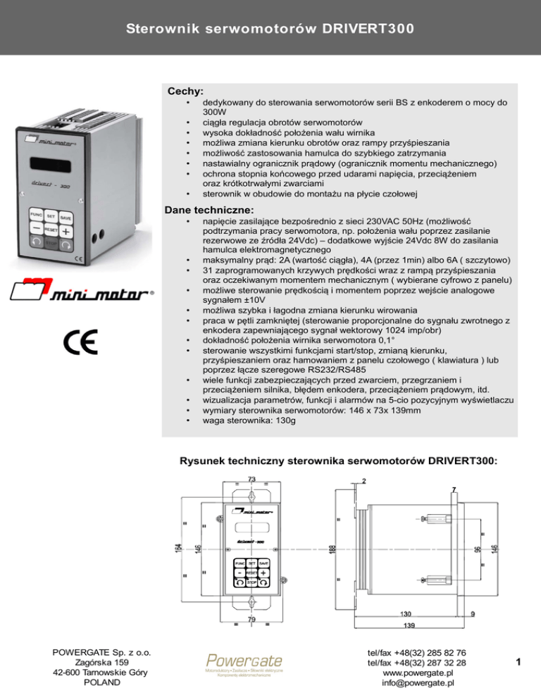 Sterownik serwomotorów DRIVERT300 Cechy: • • • • • • • • dedykowany do sterowania serwomotorów serii BS z enkoderem o mocy do 300W ciągła regulacja obrotów serwomotorów wysoka dokładność położenia wału wirnika możliwa zmiana kierunku obrotów oraz rampy przyśpieszania możliwość zastosowania hamulca do szybkiego zatrzymania nastawialny ogranicznik prądowy (ogranicznik momentu mechanicznego) ochrona stopnia końcowego przed udarami napięcia, przeciążeniem oraz krótkotrwałymi zwarciami sterownik w obudowie do montażu na płycie czołowej Dane techniczne: • • • • • • • • • • • • napięcie zasilające bezpośrednio z sieci 230VAC 50Hz (możliwość podtrzymania pracy serwomotora, np. położenia wału poprzez zasilanie rezerwowe ze źródła 24Vdc) – dodatkowe wyjście 24Vdc 8W do zasilania hamulca elektromagnetycznego maksymalny prąd: 2A (wartość ciągła), 4A (przez 1min) albo 6A ( szczytowo) 31 zaprogramowanych krzywych prędkości wraz z rampą przyśpieszania oraz oczekiwanym momentem mechanicznym ( wybierane cyfrowo z panelu) możliwe sterowanie prędkością i momentem poprzez wejście analogowe sygnałem ±10V możliwa szybka i łagodna zmiana kierunku wirowania praca w pętli zamkniętej (sterowanie proporcjonalne do sygnału zwrotnego z enkodera zapewniającego sygnał wektorowy 1024 imp/obr) dokładność położenia wirnika serwomotora 0,1° sterowanie wszystkimi funkcjami start/stop, zmianą kierunku, przyśpieszaniem oraz hamowaniem z panelu czołowego ( klawiatura ) lub poprzez łącze szeregowe RS232/RS485 wiele funkcji zabezpieczających przed zwarciem, przegrzaniem i przeciążeniem silnika, błędem enkodera, przeciążeniem prądowym, itd. wizualizacja parametrów, funkcji i alarmów na 5-cio pozycyjnym wyświetlaczu wymiary sterownika serwomotorów: 146 x 73x 139mm waga sterownika: 130g Rysunek techniczny sterownika serwomotorów DRIVERT300: POWERGATE Sp. z o.o. Zagórska 159 42-600 Tarnowskie Góry POLAND tel/fax +48(32) 285 82 76 tel/fax +48(32) 287 32 28 www.powergate.pl [email protected] 1