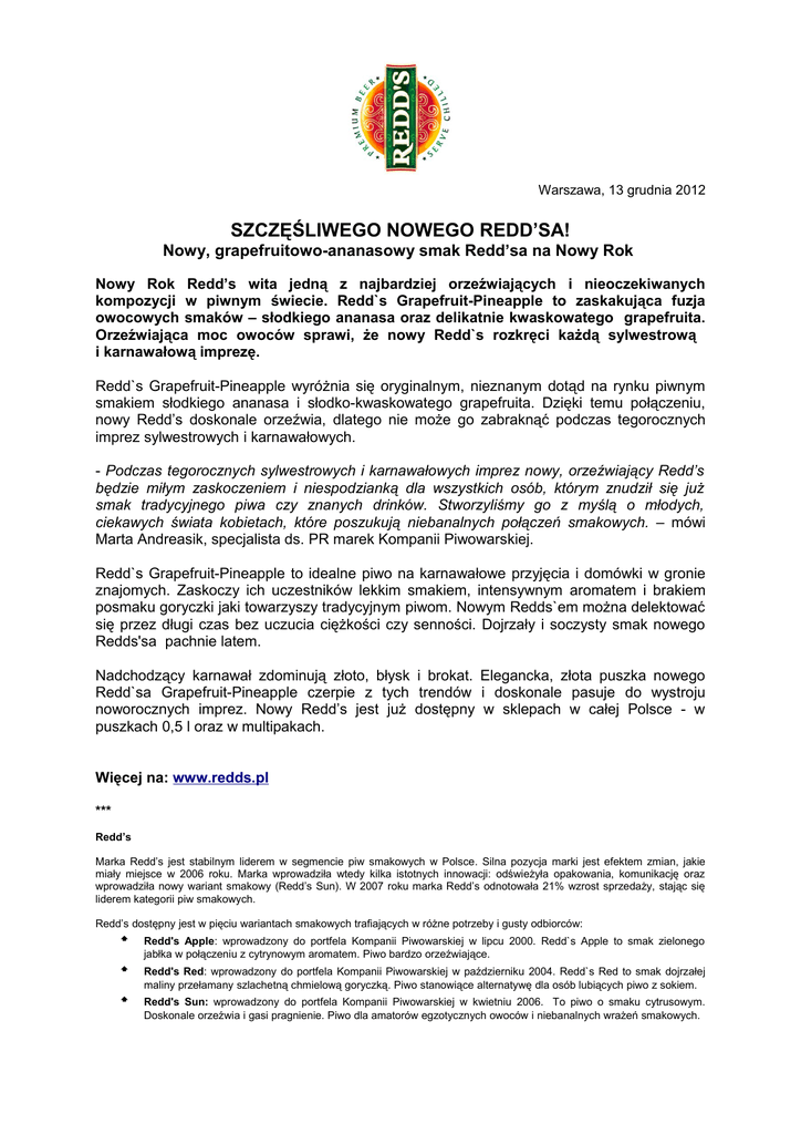 Warszawa, 13 grudnia 2012 SZCZĘŚLIWEGO NOWEGO REDD’SA! Nowy, grapefruitowo-ananasowy smak Redd’sa na Nowy Rok Nowy Rok Redd’s wita jedną z najbardziej orzeźwiających i nieoczekiwanych kompozycji w piwnym świecie. Redd`s Grapefruit-Pineapple to zaskakująca fuzja owocowych smaków – słodkiego ananasa oraz delikatnie kwaskowatego grapefruita. Orzeźwiająca moc owoców sprawi, że nowy Redd`s rozkręci każdą sylwestrową i karnawałową imprezę. Redd`s Grapefruit-Pineapple wyróżnia się oryginalnym, nieznanym dotąd na rynku piwnym smakiem słodkiego ananasa i słodko-kwaskowatego grapefruita. Dzięki temu połączeniu, nowy Redd’s doskonale orzeźwia, dlatego nie może go zabraknąć podczas tegorocznych imprez sylwestrowych i karnawałowych. - Podczas tegorocznych sylwestrowych i karnawałowych imprez nowy, orzeźwiający Redd’s będzie miłym zaskoczeniem i niespodzianką dla wszystkich osób, którym znudził się już smak tradycyjnego piwa czy znanych drinków. Stworzyliśmy go z myślą o młodych, ciekawych świata kobietach, które poszukują niebanalnych połączeń smakowych. – mówi Marta Andreasik, specjalista ds. PR marek Kompanii Piwowarskiej. Redd`s Grapefruit-Pineapple to idealne piwo na karnawałowe przyjęcia i domówki w gronie znajomych. Zaskoczy ich uczestników lekkim smakiem, intensywnym aromatem i brakiem posmaku goryczki jaki towarzyszy tradycyjnym piwom. Nowym Redds`em można delektować się przez długi czas bez uczucia ciężkości czy senności. Dojrzały i soczysty smak nowego Redds'sa pachnie latem. Nadchodzący karnawał zdominują złoto, błysk i brokat. Elegancka, złota puszka nowego Redd`sa Grapefruit-Pineapple czerpie z tych trendów i doskonale pasuje do wystroju noworocznych imprez. Nowy Redd’s jest już dostępny w sklepach w całej Polsce - w puszkach 0,5 l oraz w multipakach. Więcej na: www.redds.pl *** Redd’s Marka Redd’s jest stabilnym liderem w segmencie piw smakowych w Polsce. Silna pozycja marki jest efektem zmian, jakie miały miejsce w 2006 roku. Marka wprowadziła wtedy kilka istotnych innowacji: odświeżyła opakowania, komunikację oraz wprowadziła nowy wariant smakowy (Redd’s Sun). W 2007 roku marka Redd’s odnotowała 21% wzrost sprzedaży, stając się liderem kategorii piw smakowych. Redd’s dostępny jest w pięciu wariantach smakowych trafiających w różne potrzeby i gusty odbiorców: Redd's Apple: wprowadzony do portfela Kompanii Piwowarskiej w lipcu 2000. Redd`s Apple to smak zielonego jabłka w połączeniu z cytrynowym aromatem. Piwo bardzo orzeźwiające. Redd's Red: wprowadzony do portfela Kompanii Piwowarskiej w październiku 2004. Redd`s Red to smak dojrzałej maliny przełamany szlachetną chmielową goryczką. Piwo stanowiące alternatywę dla osób lubiących piwo z sokiem. Redd's Sun: wprowadzony do portfela Kompanii Piwowarskiej w kwietniu 2006. To piwo o smaku cytrusowym. Doskonale orzeźwia i gasi pragnienie. Piwo dla amatorów egzotycznych owoców i niebanalnych wrażeń smakowych. Redd`s Cranberry: wprowadzony do portfela Kompanii Piwowarskiej we wrześniu 2011 jako wersja limitowana, w marcu 2012 przeszedł do stałej sprzedaży. Redd`s Cranberry jest delikatny, słodki a wyrafinowany, piwny, a aromatycznie żurawinowy. Piwo orzeźwiające, idealne również na jesienne i zimowe wieczory. Redd`s Grapefruit Pineapple: wprowadzony do portfela Kompanii Piwowarskiej w grudniu 2012 roku. Redd`s Grapefruit Pineapple to piwo o smaku dwóch soczystych owoców: słodkiego ananasa i kwaskowatego grapefruita. Piwo bardzo orzeźwiające i aromatyczne. Wszystkie warianty piwa Redd’s mają 4,5% zawartości alkoholu. Kompania Piwowarska – Lider branży piwowarskiej w Polsce Kompania Piwowarska jest największym przedsiębiorstwem piwowarskim w Polsce. Kilkusetletnie doświadczenia w warzeniu piwa, nowoczesne technologie i rygorystyczne przestrzeganie zasad produkcji na światowym poziomie gwarantują najwyższą jakość produktów. Do portfela marek KP należą najpopularniejsze polskie piwa - m.in. Tyskie, Żubr, Lech, Dębowe Mocne, Redd's, a także międzynarodowe marki premium: Pilsner Urquell, Grolsch oraz Peroni Nastro Azzurro. Kompania Piwowarska (utworzona w 1999 roku) posiada trzy browary (w Tychach, Poznaniu i Białymstoku) oraz oddziały handlowe na terenie całego kraju. Prowadzi także działalność społeczną nastawioną na walkę z wykluczeniem społecznym na tle ubóstwa oraz programy edukacyjne popularyzujące odpowiedzialność i umiar w konsumowaniu alkoholu. Wielkość sprzedaży osiągniętej przez KP w roku finansowym zakończonym 31 marca 2011 r. wyniosła 14,1 mln hektolitrów piwa. SABMiller – jeden z największych na świecie producentów piwa Kompania Piwowarska jest częścią jednego z największych na świecie producentów piwa - SABMiller plc. Grupa produkuje lub dystrybuuje piwo na sześciu kontynentach, a jej ogólnoświatowy portfel obejmuje międzynarodowe piwa premium, takie jak Grolsch, Miller Genuine Draft, Peroni Nastro Azzurro czy Pilsner Urquell oraz czołowe marki lokalne, takie jak Aquila, Castle, Miller Lite, Snow czy Tyskie. SABMiller jest jedną z największych na świecie (poza USA) firm rozlewających produkty Coca-Coli. W roku finansowym zakończonym 31 marca 2011 SABMiller osiągnął przychody w wysokości 28,3 mld USD oraz wypracował zysk brutto (EBITA) w wysokości 5 mld USD. SABMiller plc jest notowany na giełdach papierów wartościowych w Londynie i Johannesburgu. Dodatkowych informacji udzielają: Marta Podhorecka Consultant Q&AConsulting [email protected] www.qaconsulting.pl tel.: +48 61 8525849; tel. kom.: +48 694 475 306 Marta Andreasik Specjalista ds. PR marek Kompanii Piwowarskiej Kompania Piwowarska S.A. [email protected] www.kp.pl Tel.: +48 48 22 315 27 97 Tel. Kom.: +48 695 850 168