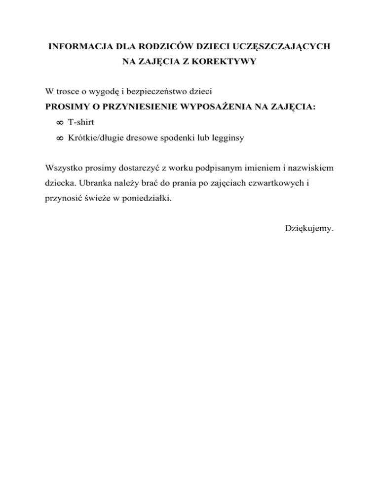 INFORMACJA DLA RODZICÓW DZIECI UCZĘSZCZAJĄCYCH NA ZAJĘCIA Z KOREKTYWY W trosce o wygodę i bezpieczeństwo dzieci PROSIMY O PRZYNIESIENIE WYPOSAŻENIA NA ZAJĘCIA: • T-shirt • Krótkie/długie dresowe spodenki lub legginsy Wszystko prosimy dostarczyć z worku podpisanym imieniem i nazwiskiem dziecka. Ubranka należy brać do prania po zajęciach czwartkowych i przynosić świeże w poniedziałki. Dziękujemy.